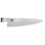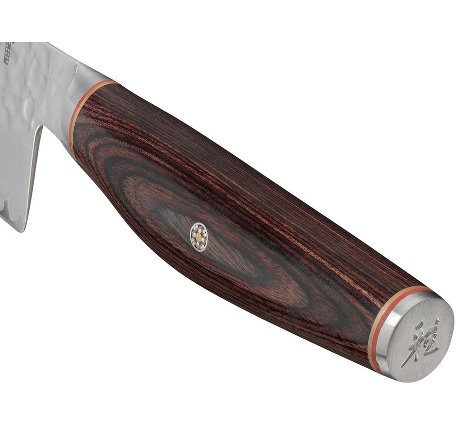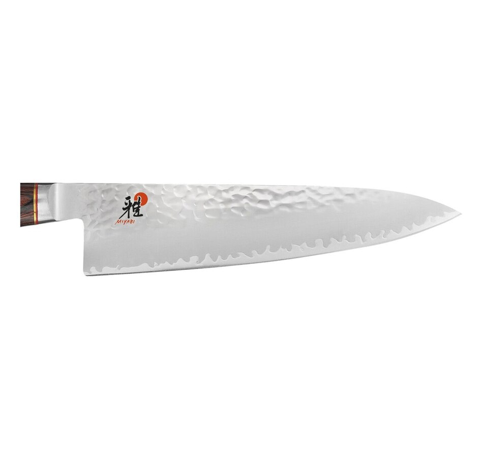 The blade is made of a micro-carbide powder steel core wrapped in two additional layers of steel. The blade is hammer-forged, giving it an appearance slightly reminiscent of the Tschumine design. In addition, each blade of the Miyabi 600MCT series is put through different ice-hardening processes which must be completed at -196°C, so that a final hardness of around 63 Rockwell is achieved.
