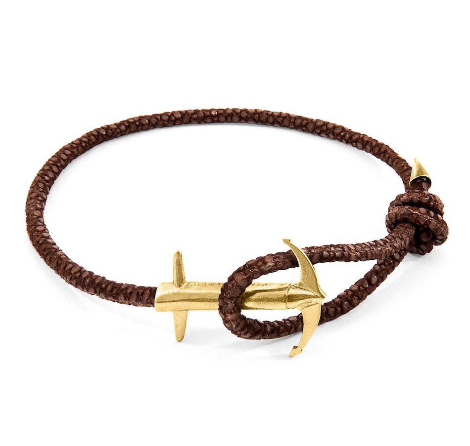 The Mocha Brown Admiral Anchor 9ct Yellow Gold and Stingray Leather Bracelet was both designed and skilfully handcrafted completely in Great Britain. Combining British craft manufacturing with a discerning modern-minimalist style, this ANCHOR & CREW bracelet features:Genuine and natural round-shaped soft-to-touch stingray leather (GB)Secure solid 9ct (karat) yellow gold anchor (GB) A fineness of 9ct (karat) is chosen for this solid yellow gold to give added durability/wearability benefitsPLEASE NOTEDue to this design's fine materiality, please note there is a 7-10 working day(s) extension on manufacturing. Quality matters.SIZINGThis bracelet is one size fits all, with the leather able to extend or tighten to suit your wrist size. To take the bracelet on or off your wrist, simply slide the one adjustable knot around the leather to make the loop size smaller or larger, and once set, keep the loop size consistent and continue wearing by easily unhooking the clasp from the loop. Less is More.