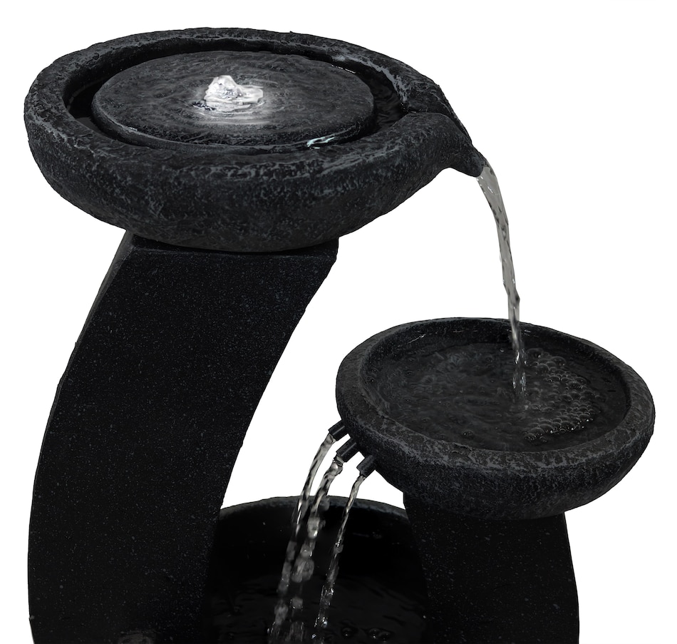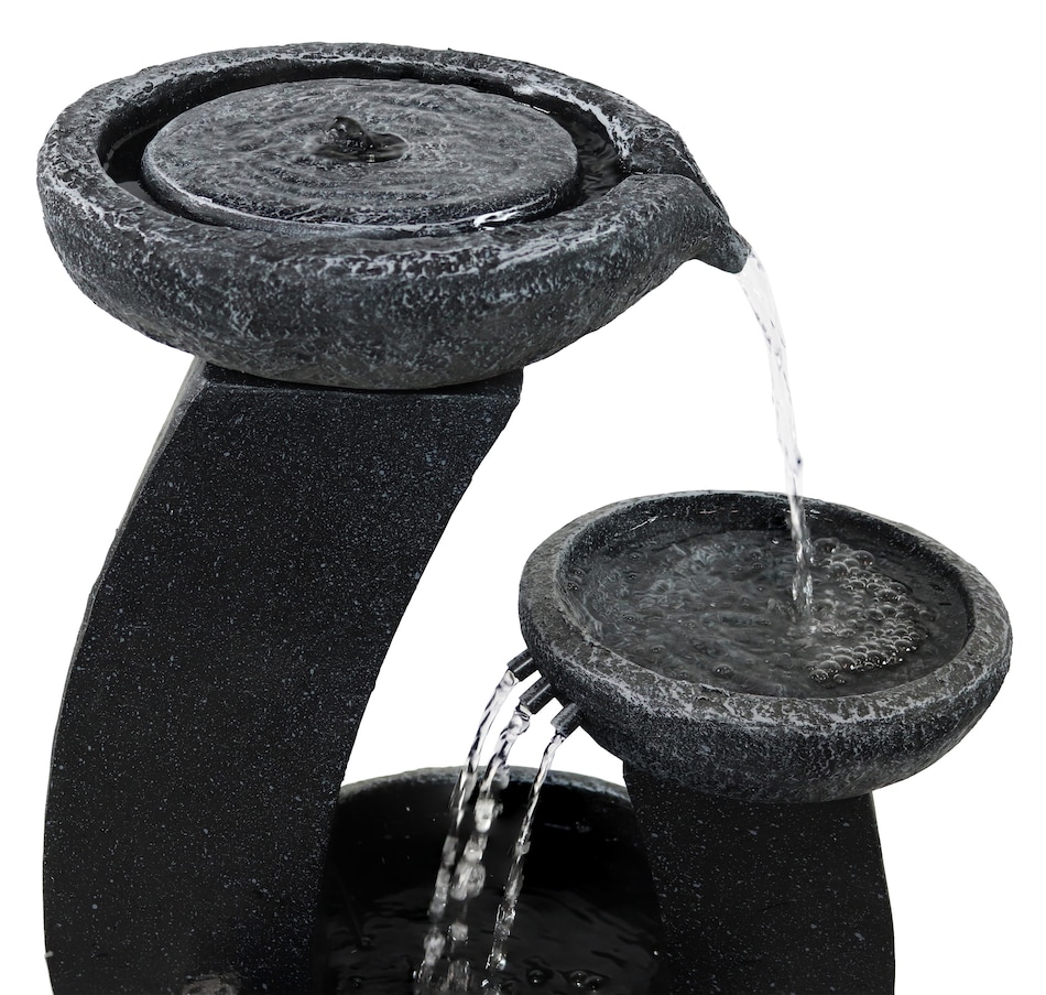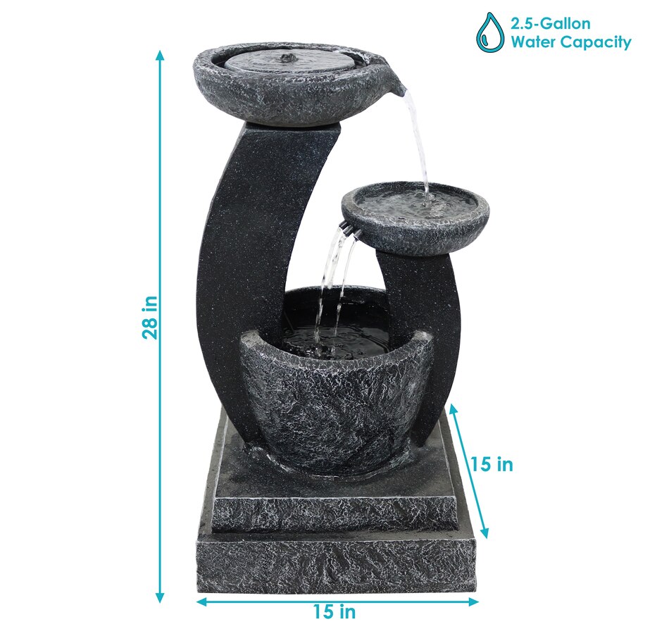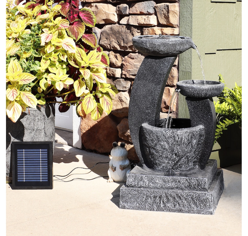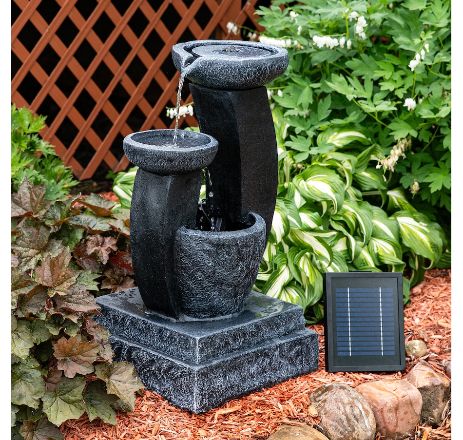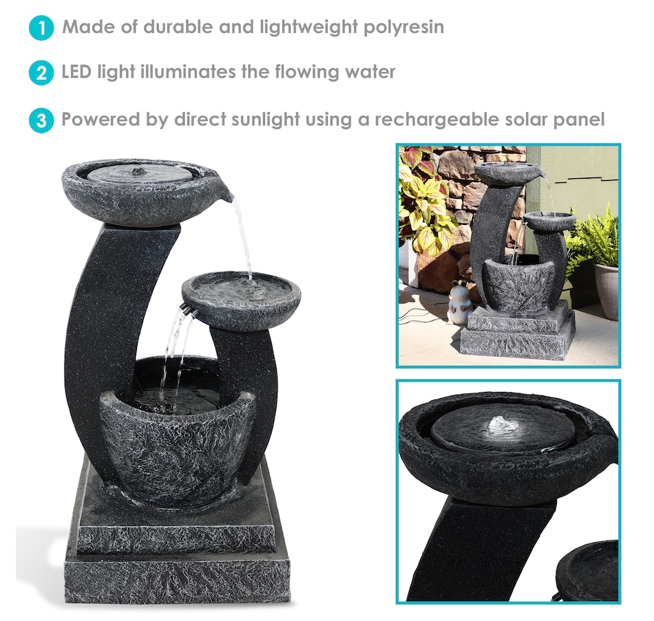 This decorative, unique solar fountain with a battery for backup is sure to bring elements of peace, serenity and class to any garden, patio, porch, deck, or other outdoor space in need of an uplifting, soothing focal point. Once assembled, simply connect the solar pump to the panel and place the panel in direct sunlight. Mount and conceal the solar panel in a sunny place and enjoy! The solar with battery backup option allows this fountain to harness solar energy even when there is no sunlight! The rechargeable battery pack charges throughout the day (with or without the fountain running) so the gentle water sounds may be enjoyed in the evening as well. To run on battery mode simply press the battery On/Off button. This fountain also features an LED light on the top tier to illuminate the water bubbling at night!