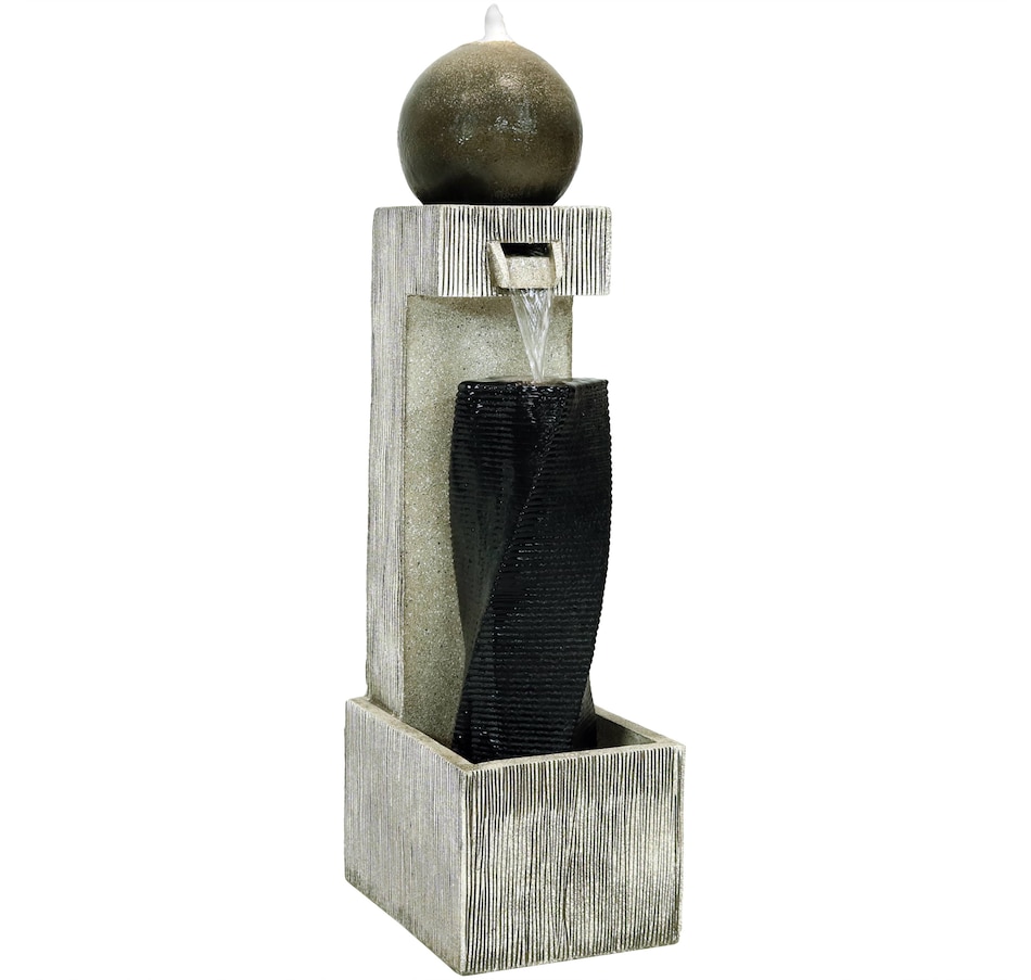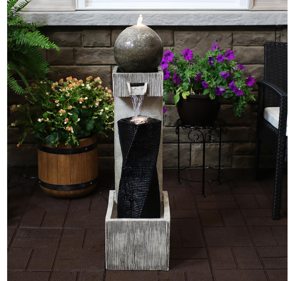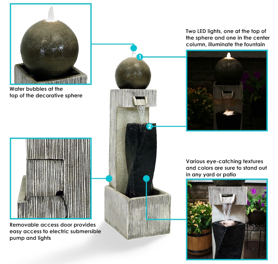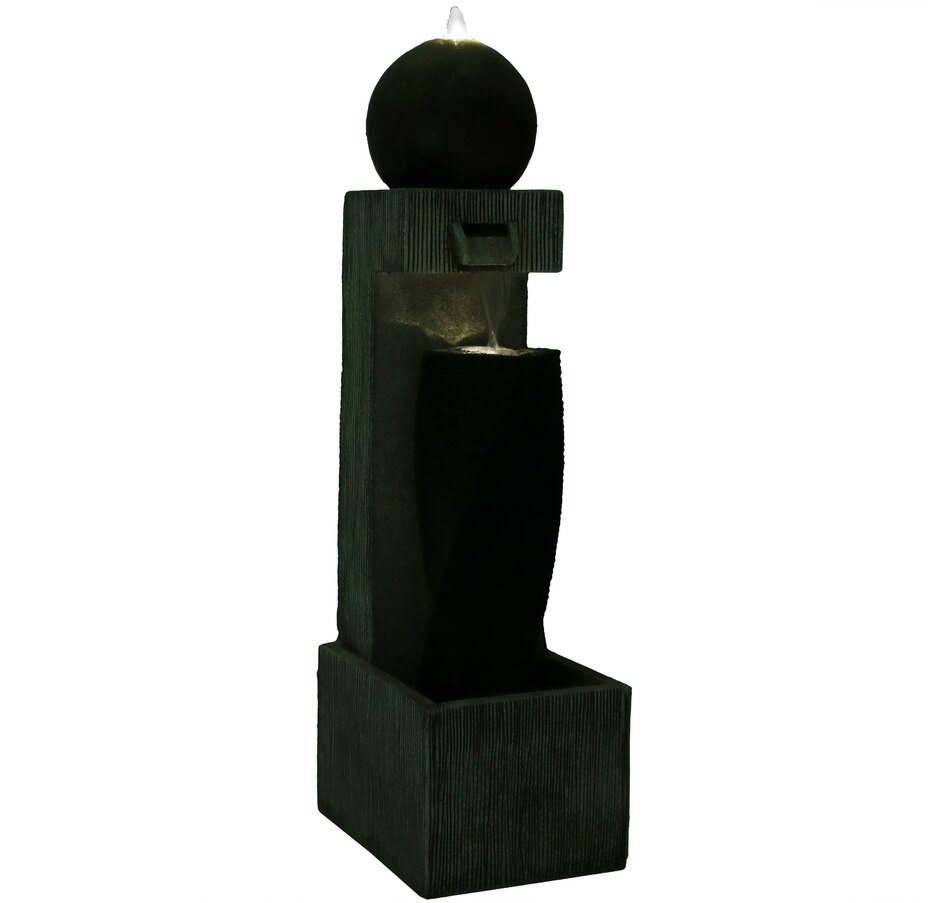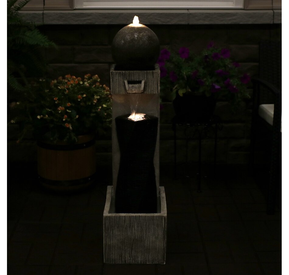Add an artistic and contemporary water feature to the garden, patio, yard, or other landscaping area with the Modern Artistry water fountain featuring LED lights. Made of durable polyresin, this fountain features a variety of shapes and textures that lend visual interest to this outdoor decor piece while remaining resistant to the elements outdoors. Water streams from the top of the sphere and out from the spout onto the black column below. The water flows down the ridges of the black column to the bottom basin where it collects and circulates back to the top via a submersible electric pump. Enjoy this beautiful water feature at night with the LED lights illuminating the fountain from the top of the sphere and the column. This fountain includes an electric submersible pump that makes it simple to set up without any complicated installation or plumbing involved. Just place this fountain anywhere, plug it in to the nearest outlet, and relax, enjoying the soothing sounds and beautiful features.