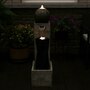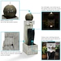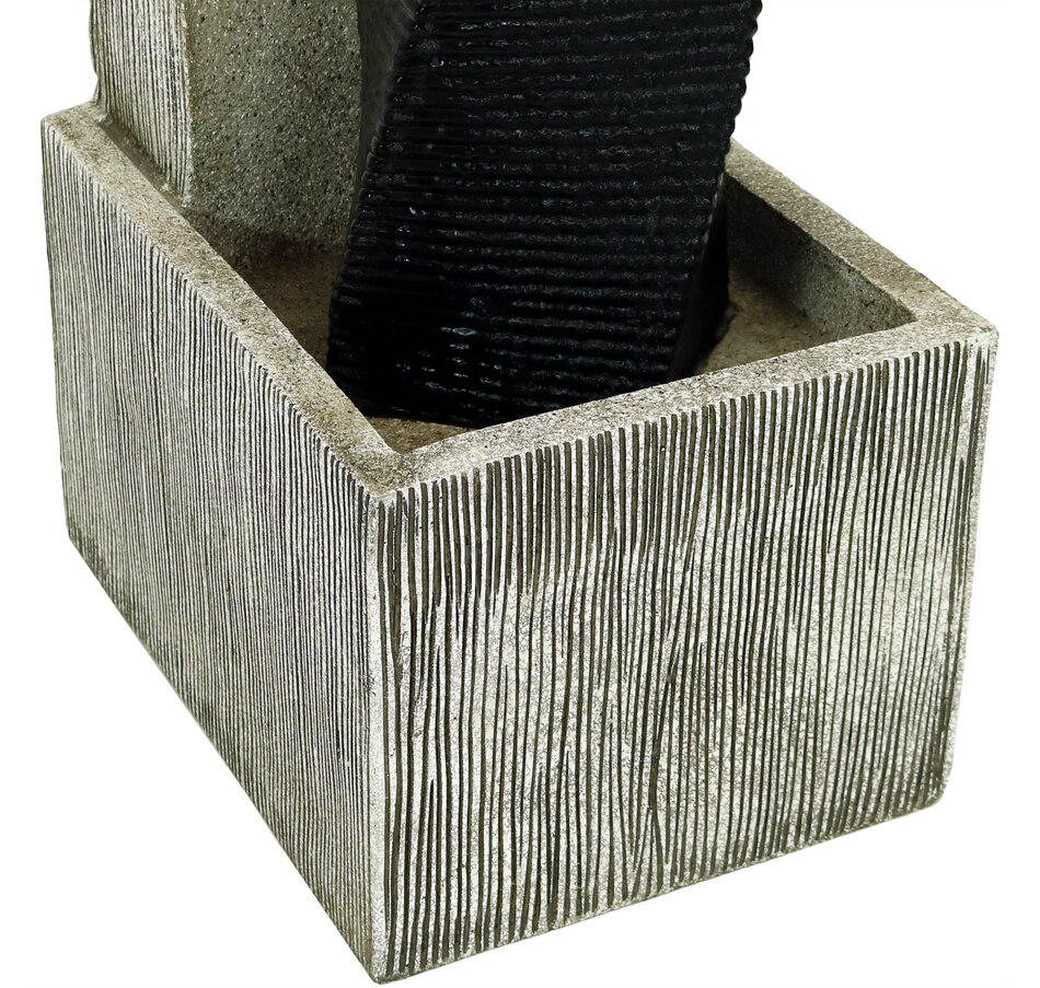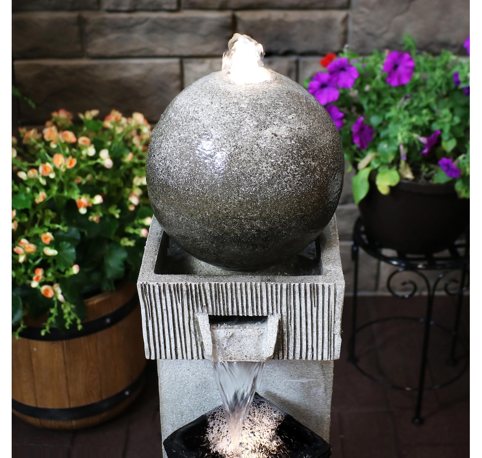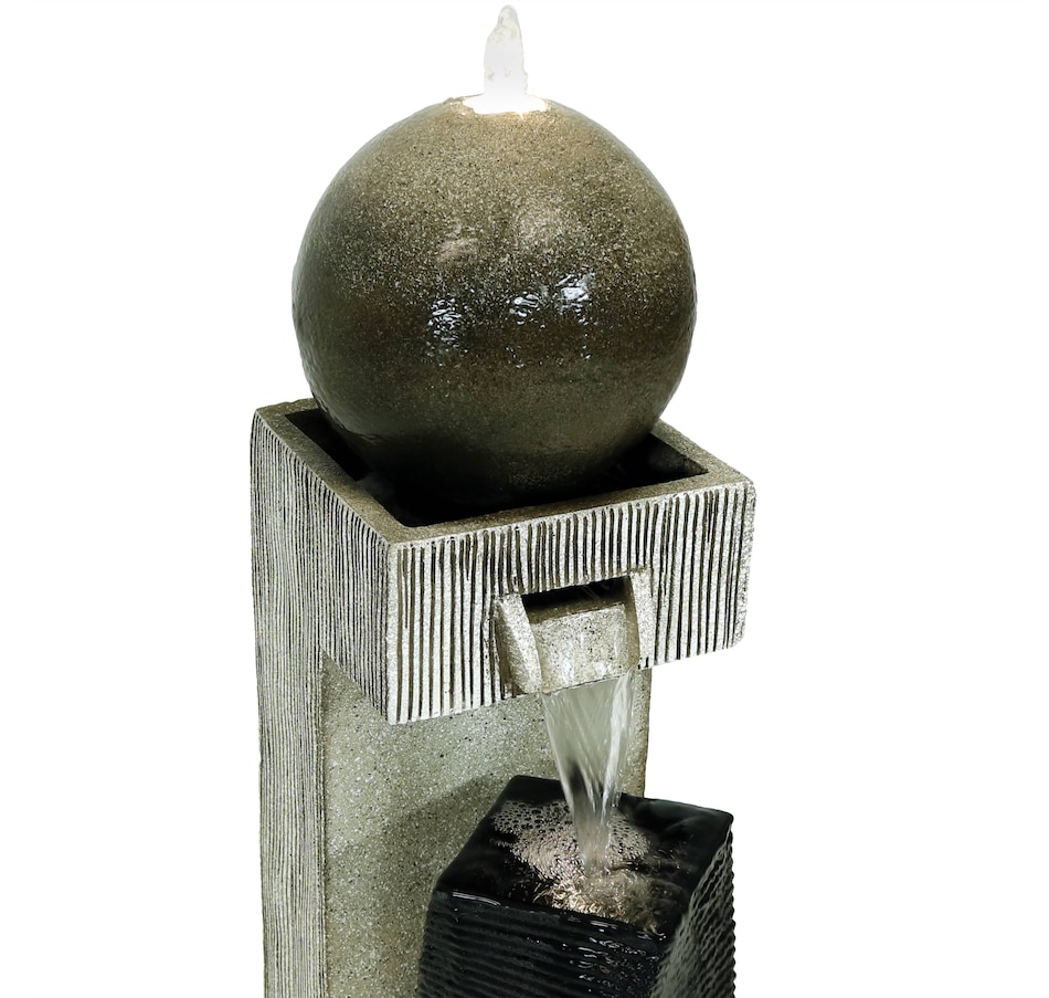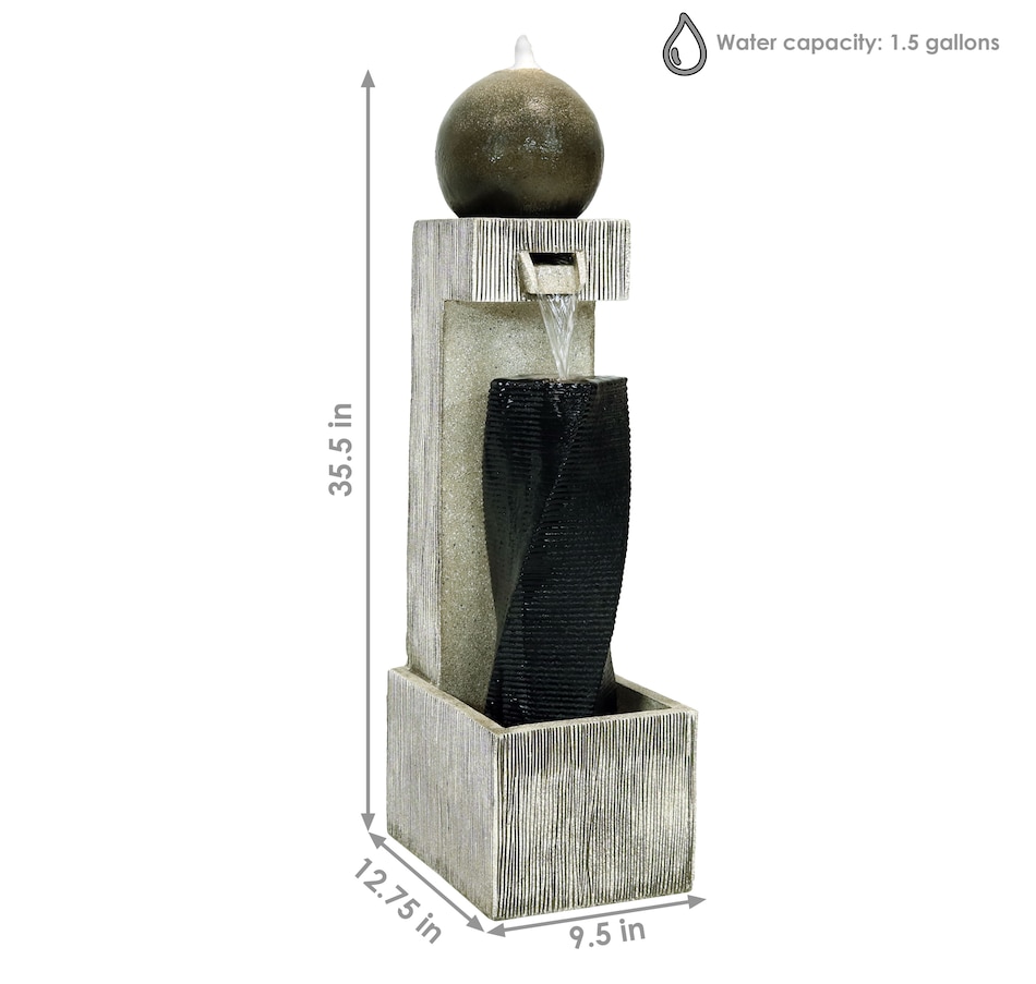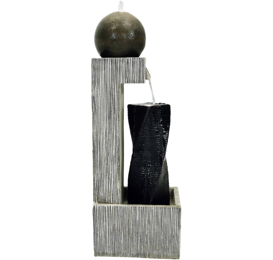 Add an artistic and contemporary water feature to the garden, patio, yard, or other landscaping area with the Modern Artistry water fountain featuring LED lights. Made of durable polyresin, this fountain features a variety of shapes and textures that lend visual interest to this outdoor decor piece while remaining resistant to the elements outdoors. Water streams from the top of the sphere and out from the spout onto the black column below. The water flows down the ridges of the black column to the bottom basin where it collects and circulates back to the top via a submersible electric pump. Enjoy this beautiful water feature at night with the LED lights illuminating the fountain from the top of the sphere and the column. This fountain includes an electric submersible pump that makes it simple to set up without any complicated installation or plumbing involved. Just place this fountain anywhere, plug it in to the nearest outlet, and relax, enjoying the soothing sounds and beautiful features.
