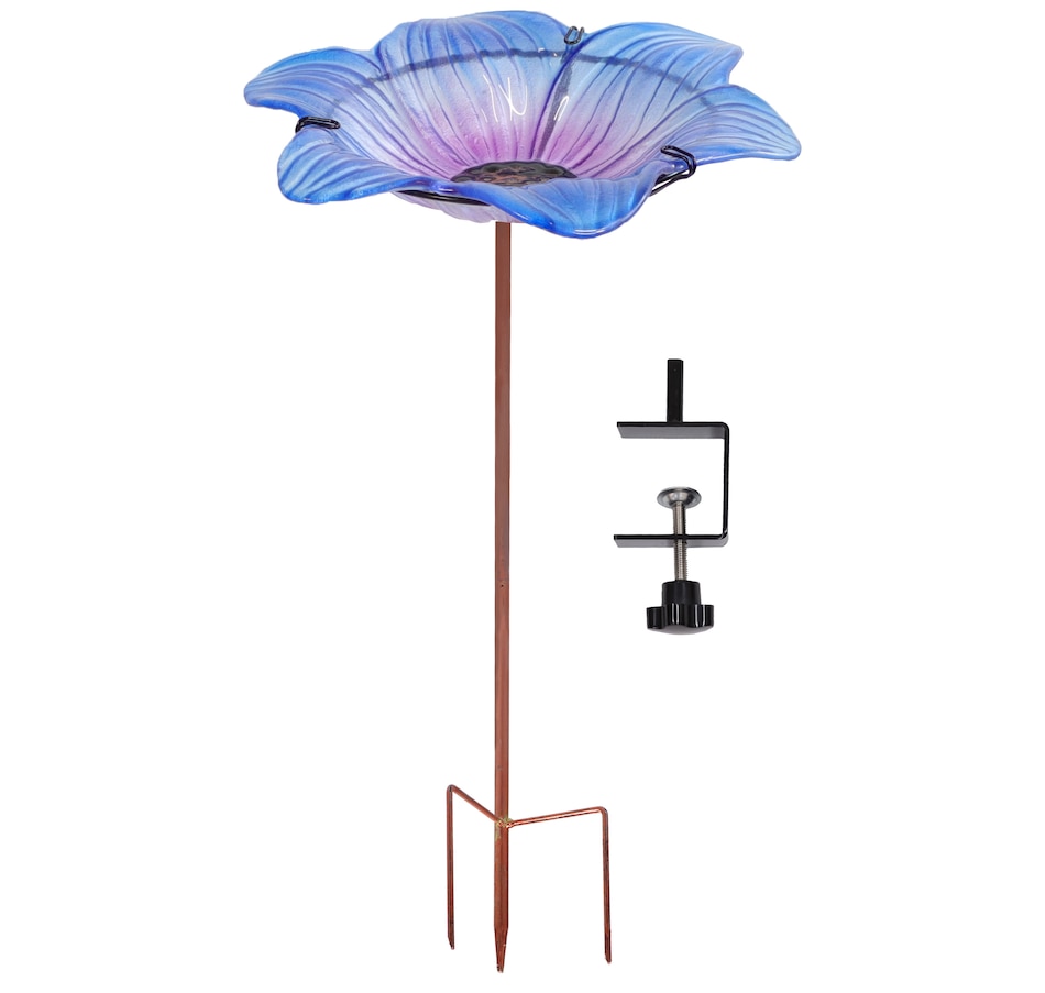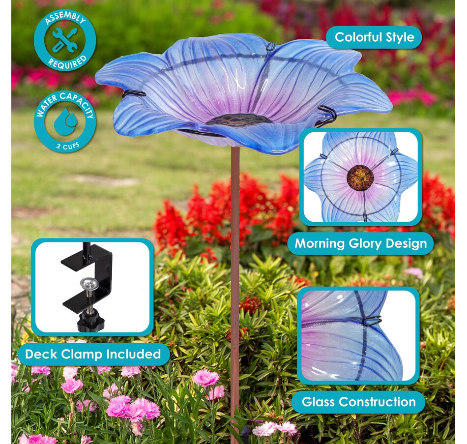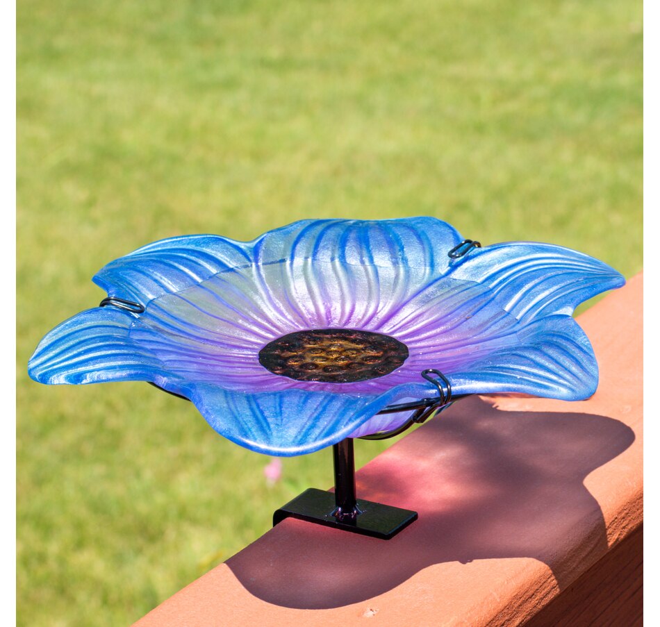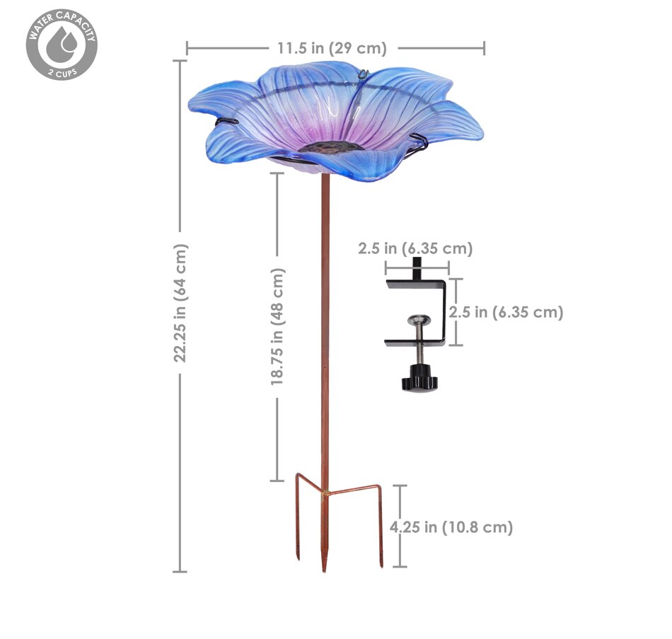 Provide a stylish oasis for the local birds with this elegant and versatile deck-mount bird bath. Beautifully crafted from glass and featuring a unique 6-petaled flower shape and a vibrant blue color, this flower bird bath includes two convenient mounting options. Use the deck clamp to secure the bird bath firmly to a railing or outdoor table, or attach the 3-pronged stake to drive the stand securely into the earth. The bowl can hold up to 2 cups of water for feathered friends to use for preening or drinking. Both the clamp and the stake are made from durable iron for lasting strength. The deck clamp has a classic black finish while the stand features a shiny copper color. This lovely bird bath is a beautiful garden accent for the deck, front porch, backyard, or garden.