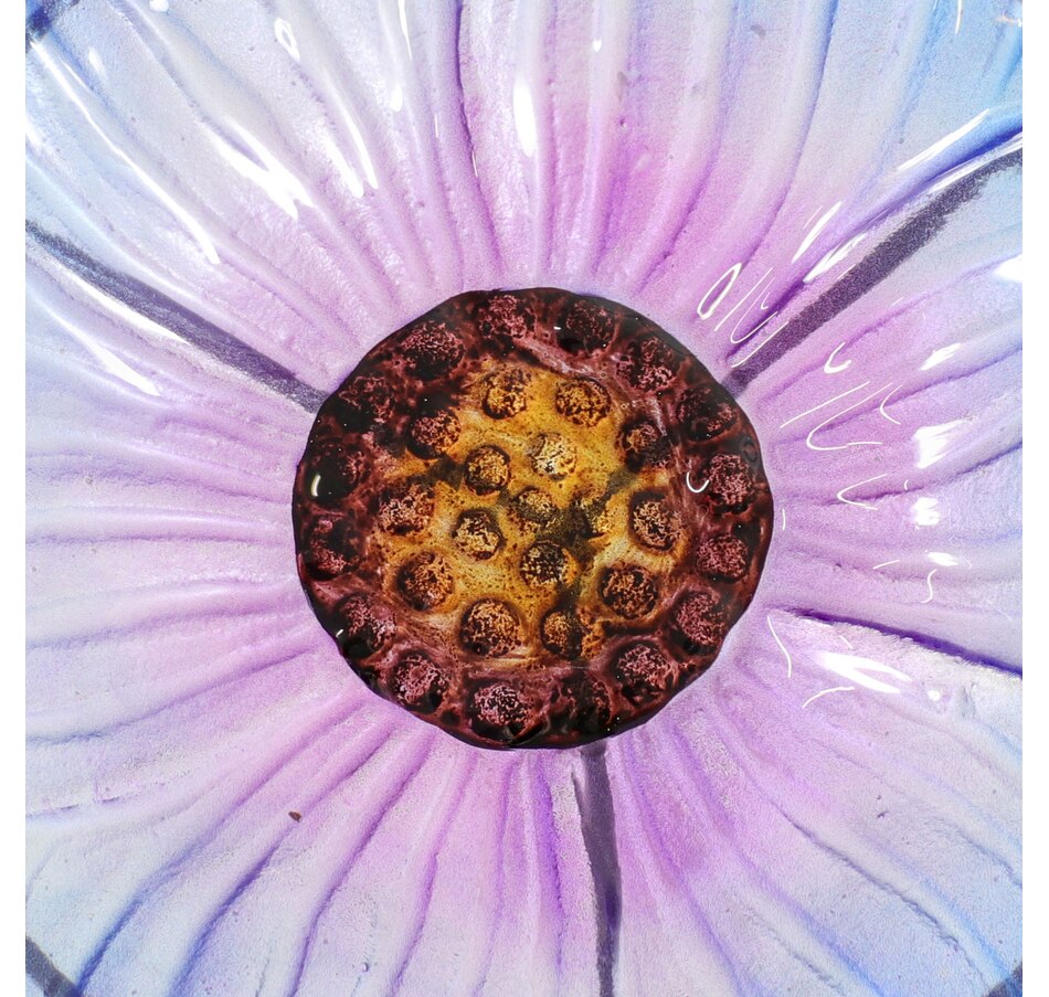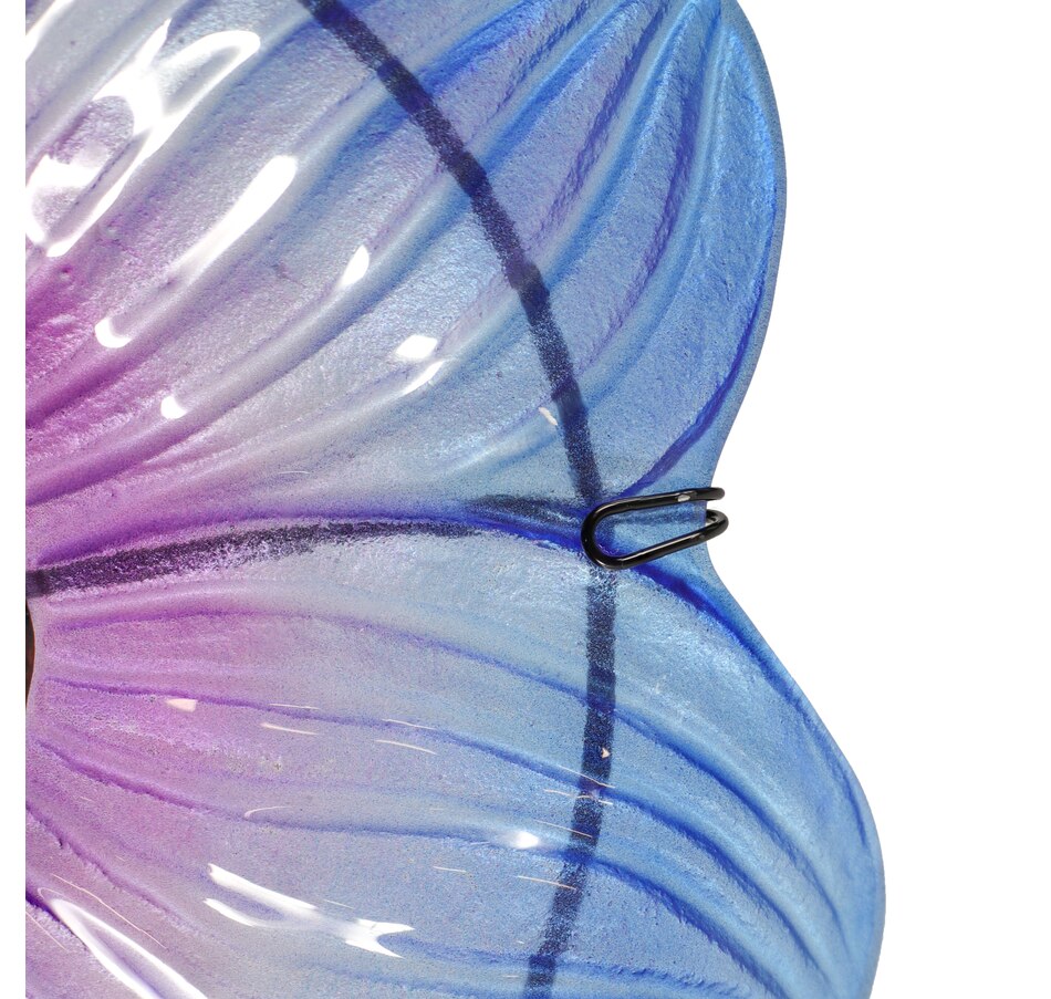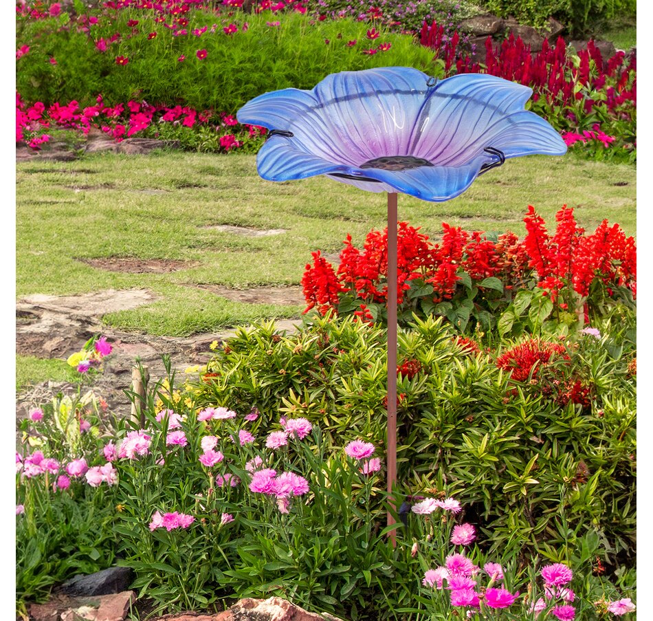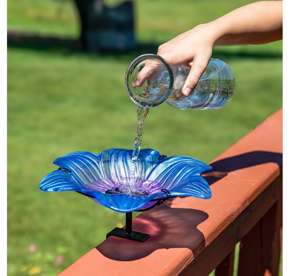 Provide a stylish oasis for the local birds with this elegant and versatile deck-mount bird bath. Beautifully crafted from glass and featuring a unique 6-petaled flower shape and a vibrant blue color, this flower bird bath includes two convenient mounting options. Use the deck clamp to secure the bird bath firmly to a railing or outdoor table, or attach the 3-pronged stake to drive the stand securely into the earth. The bowl can hold up to 2 cups of water for feathered friends to use for preening or drinking. Both the clamp and the stake are made from durable iron for lasting strength. The deck clamp has a classic black finish while the stand features a shiny copper color. This lovely bird bath is a beautiful garden accent for the deck, front porch, backyard, or garden.