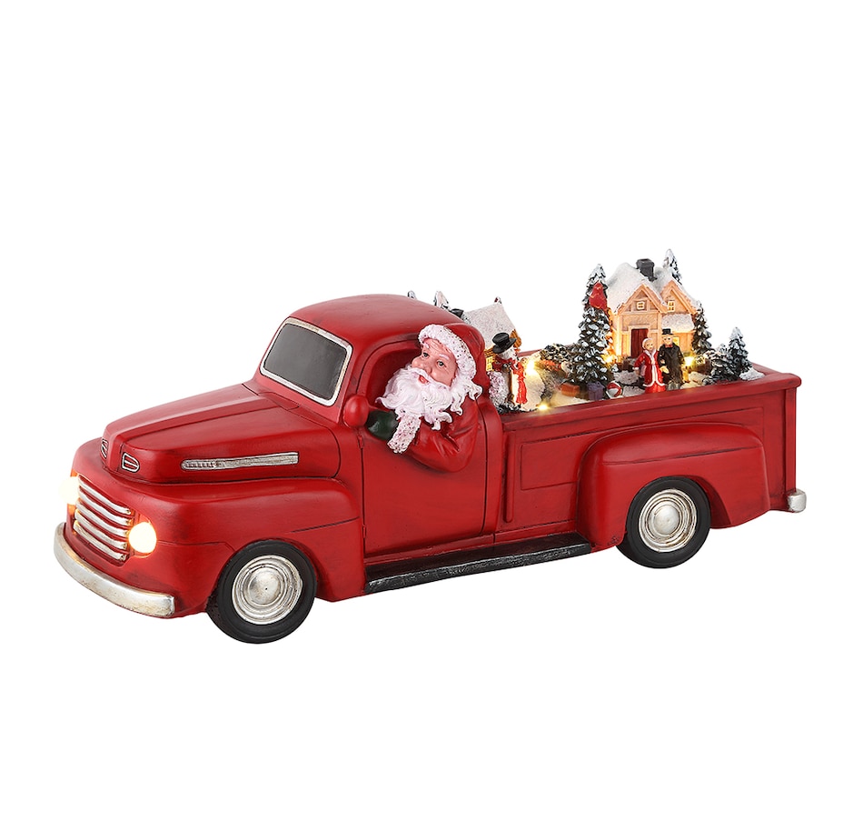 This charming holiday truck plays eight Christmas carols, and features an illuminated and animated train scene in a truck bed. It has light-up LED headlights, and operates on a six hour timer.