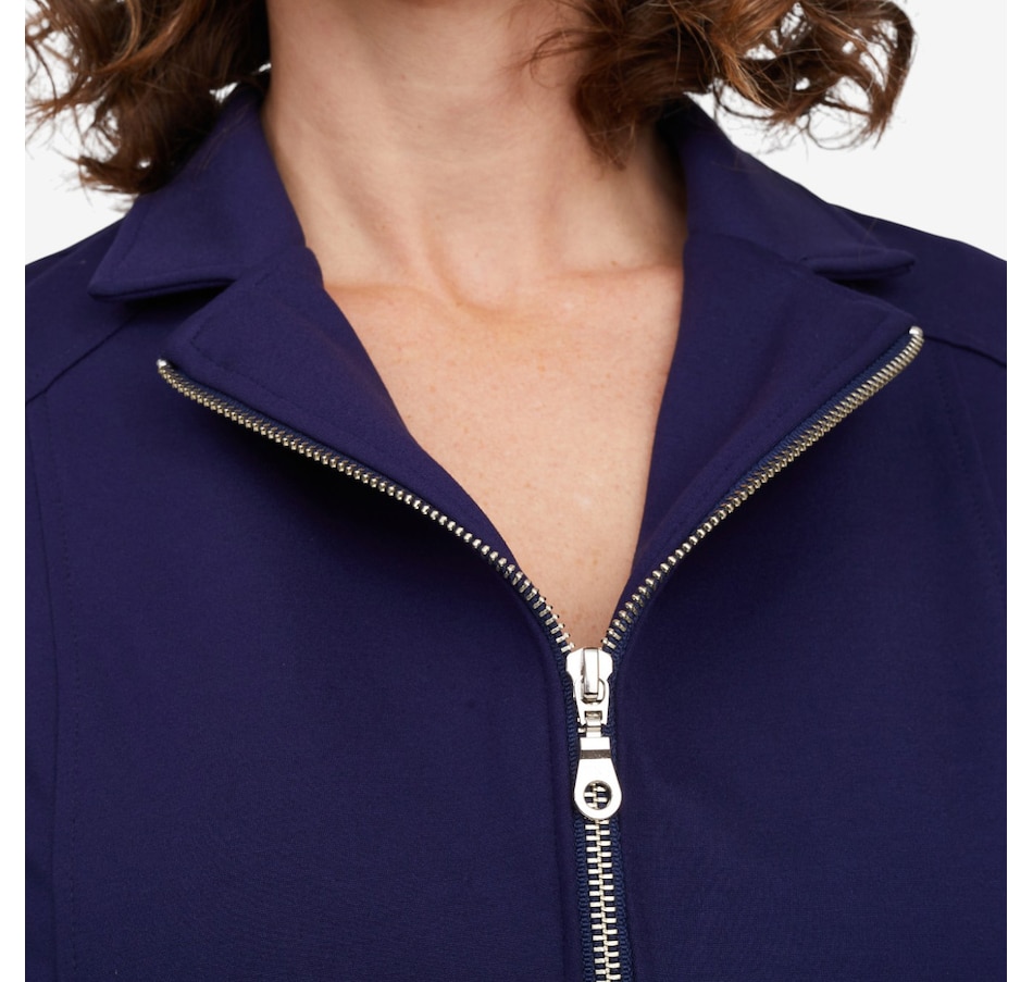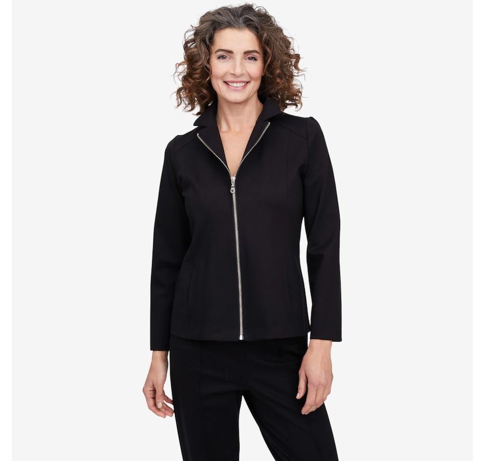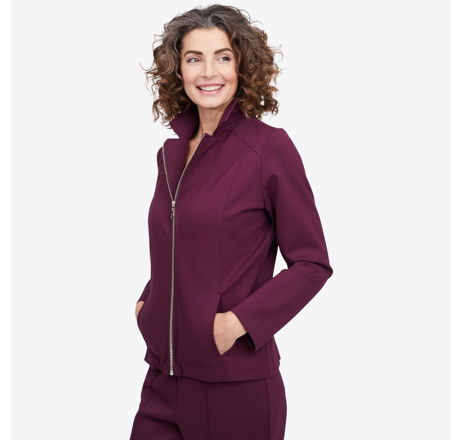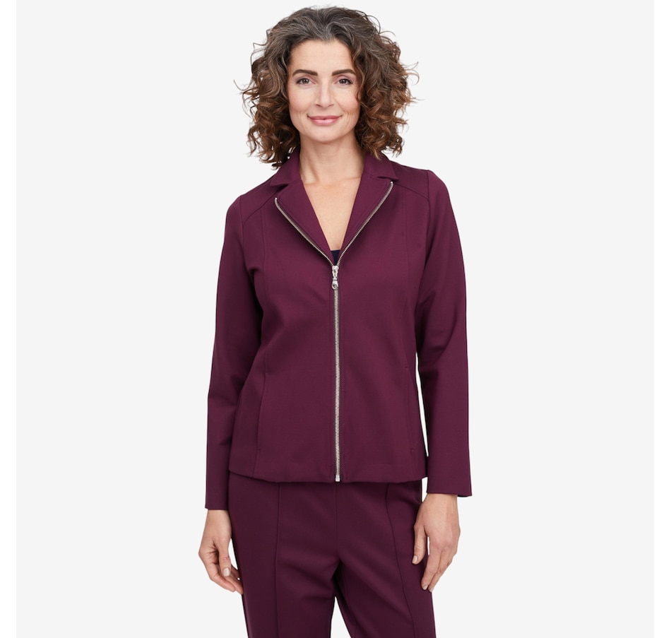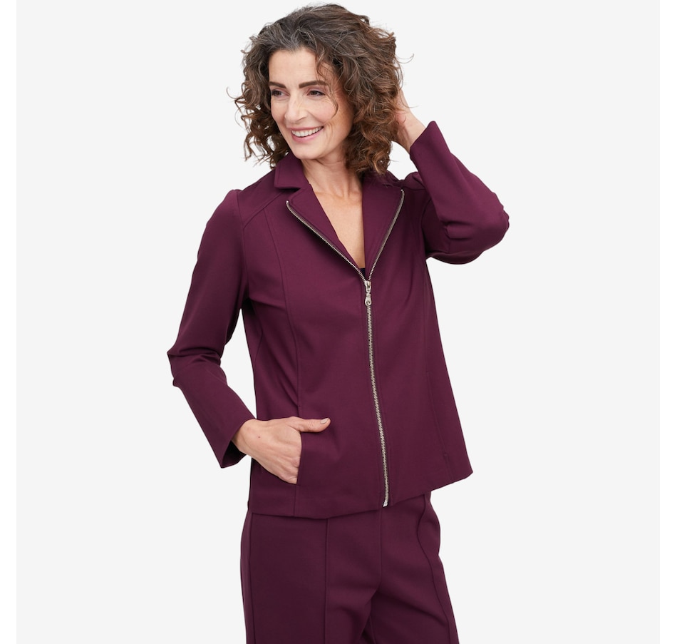 Whether your stepping on a plane for your next great adventure or getting a coffee with your bestie, you'll exude undeniably style every time with this Bon Voyage Collection ponte zip moto jacket from Mr. Max. It finishes with a classic metal zipper, offers pockets for convenience and is proudly made in Canada.