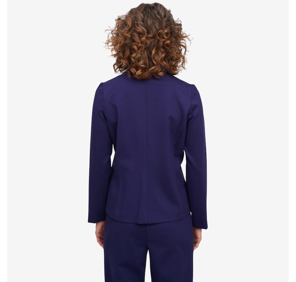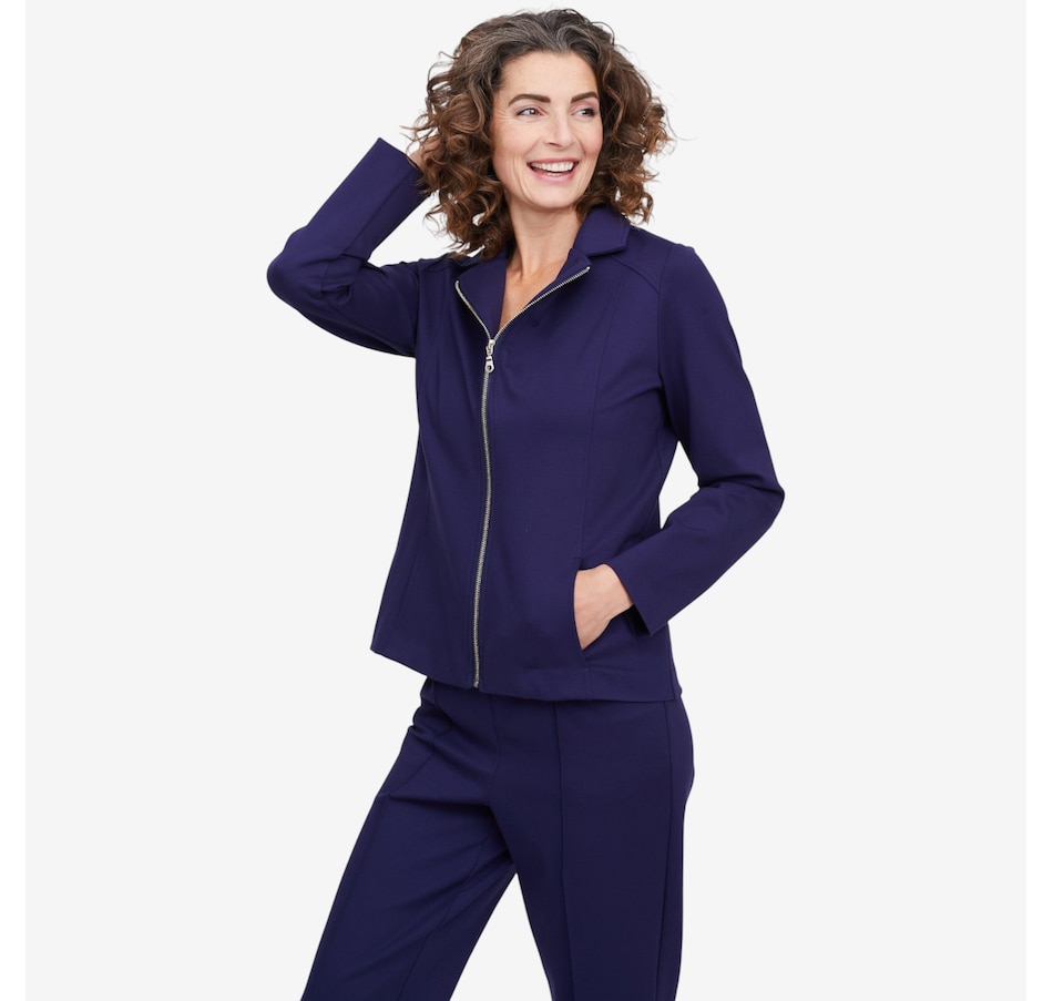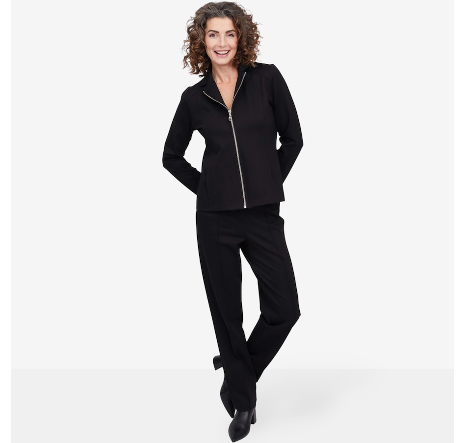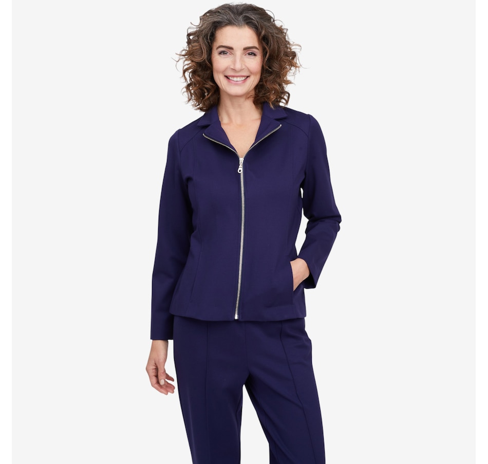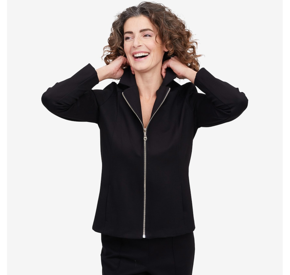 Whether your stepping on a plane for your next great adventure or getting a coffee with your bestie, you'll exude undeniably style every time with this Bon Voyage Collection ponte zip moto jacket from Mr. Max. It finishes with a classic metal zipper, offers pockets for convenience and is proudly made in Canada.