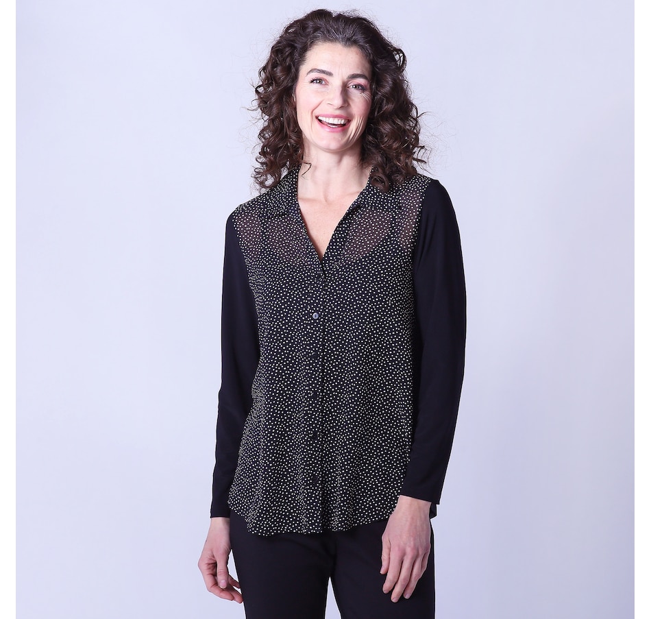 Elevate your look in undeniable style whenever you wear this beautiful chiffon dot and Brazil knit blouse and camisole from Mr. Max. This is a two-piece set with a detachable tank top inside.