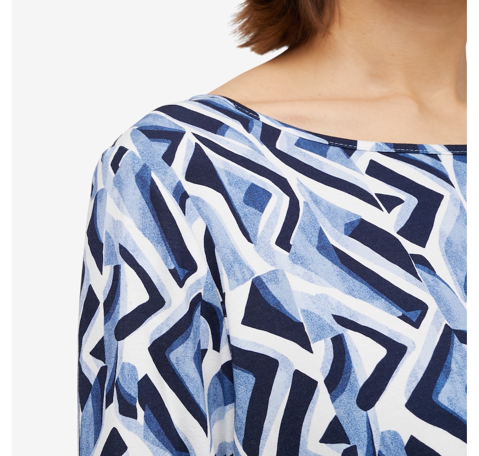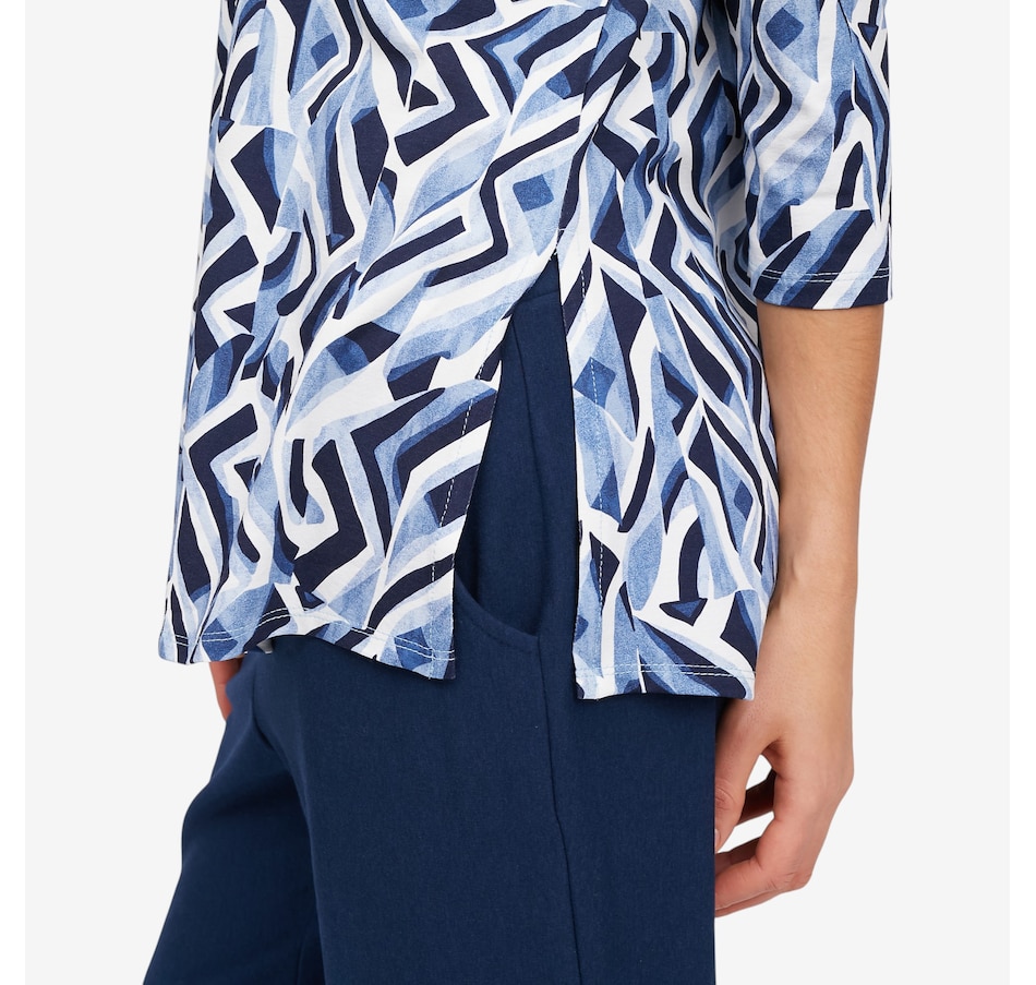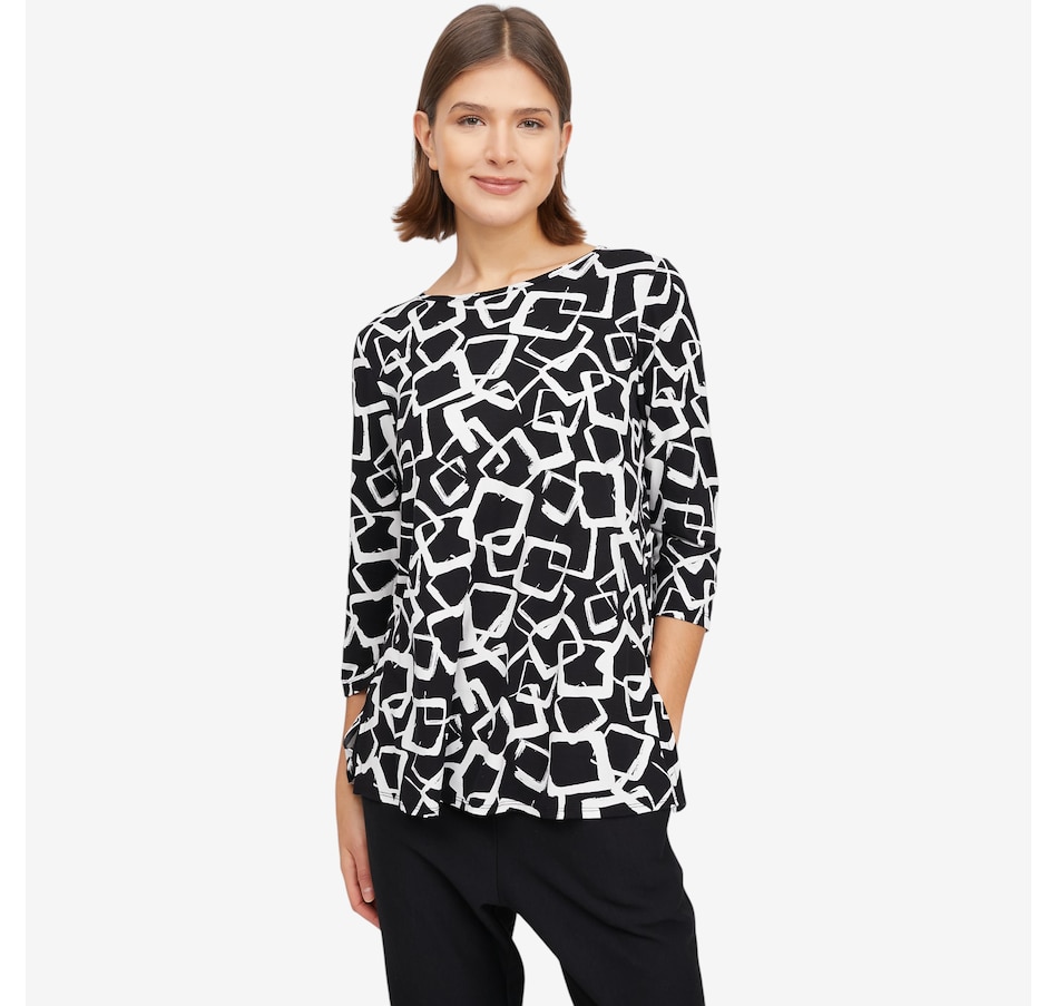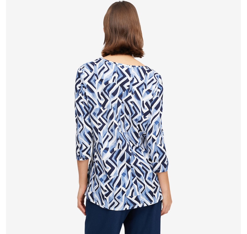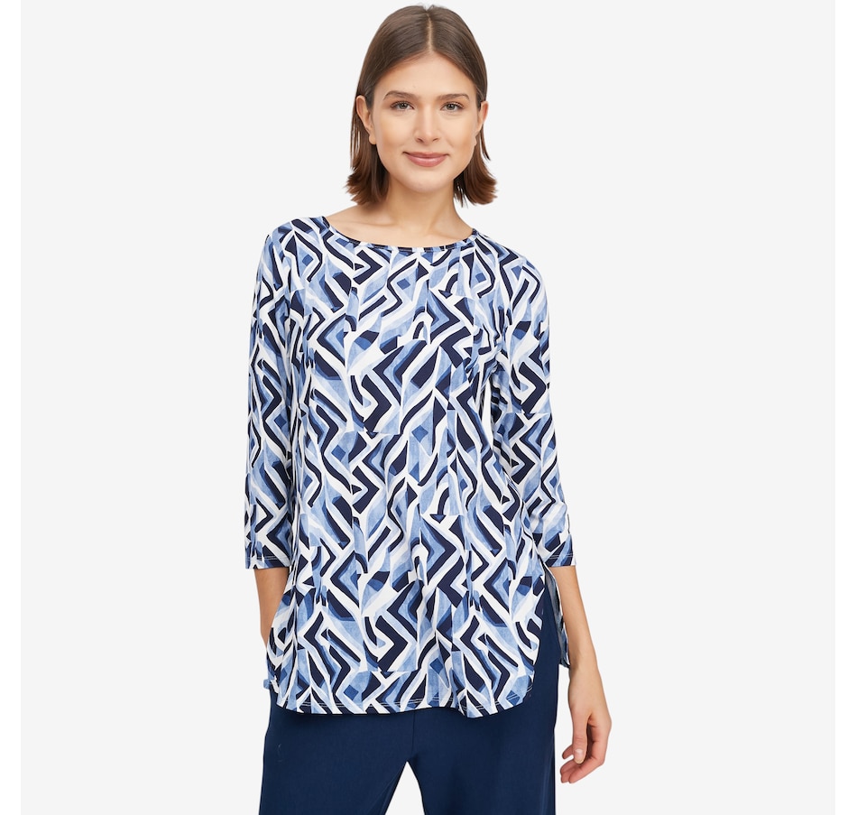 Make a statement with the effortless beauty of this Mr. Max printed Dakota signature relaxed fit top, designed in two stunning, unique prints that instantly elevate everyday style. The round neckline and 3/4 inset sleeves offer timeless appeal, while the relaxed fit drapes comfortably and flatters the silhouette. Side slits and a clean finished hem add ease of movement and polished versatility, making this top ideal for pairing with anything from denim to dressier pieces.
