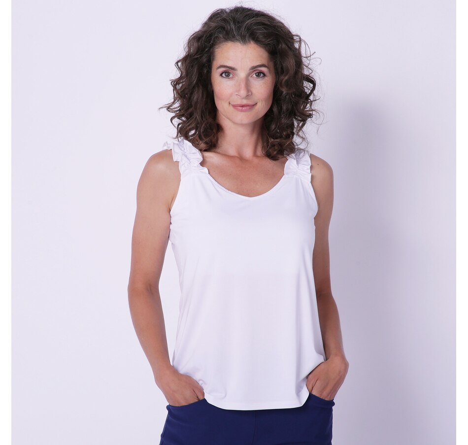 Add something stylish and distinct to your warm weather look wearing this ultra modal tank with shirred strap detail from Mr. Max.