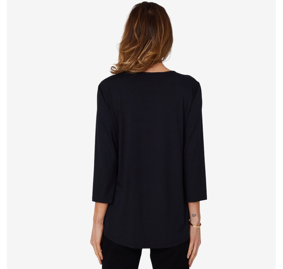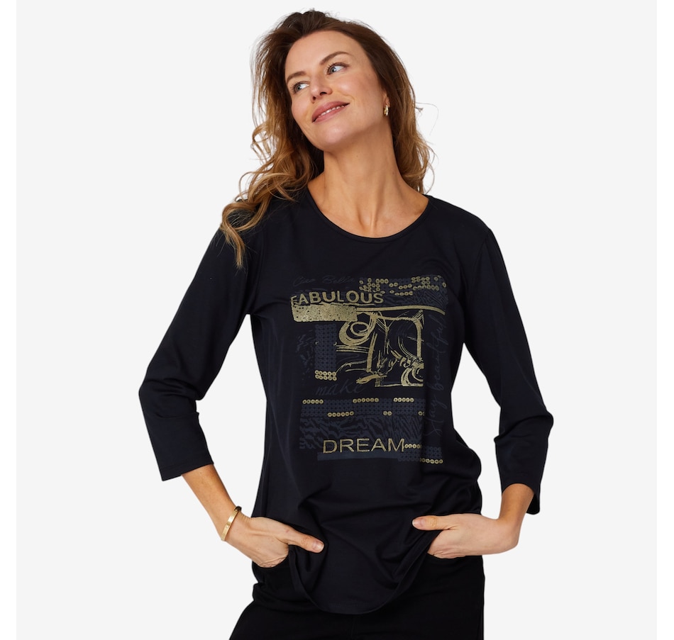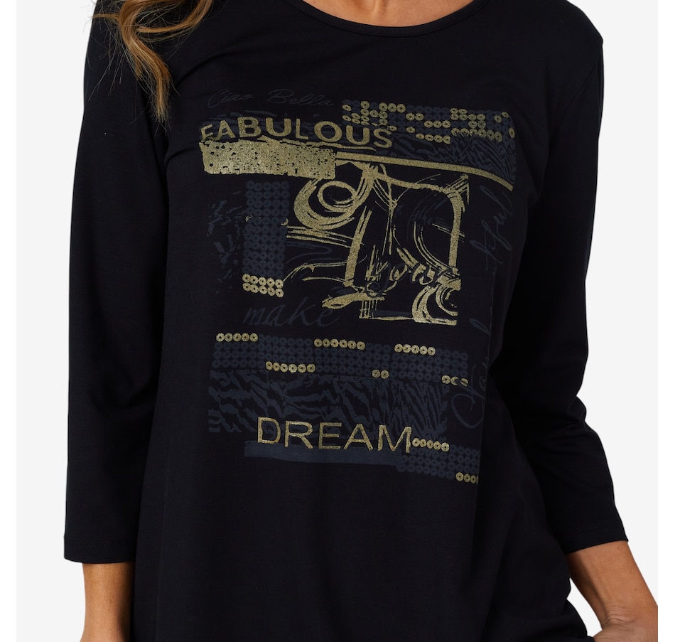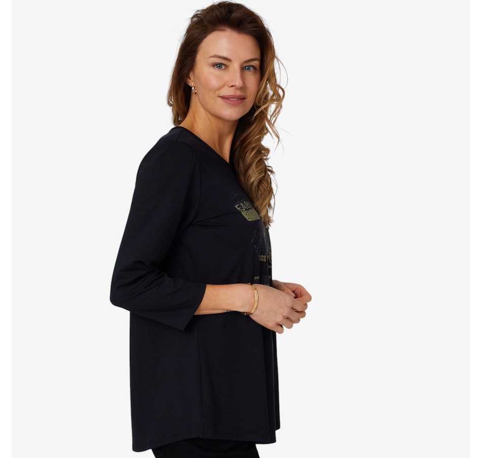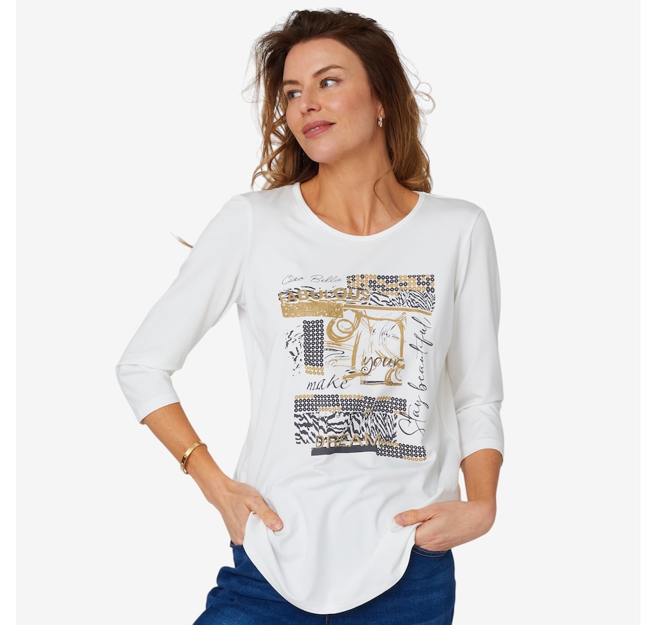 Add something super on-trend to centre all your looks with this screen print detail ultra modal top from Mr. Max. It will not pill or fade regardless of how many washes, and looks great paired with your favourite jeans.