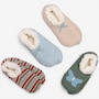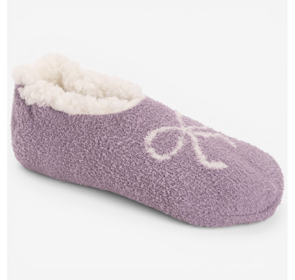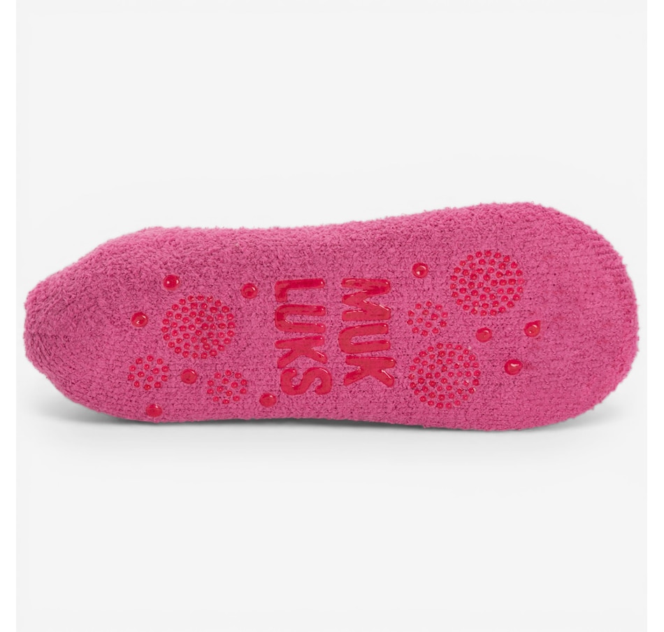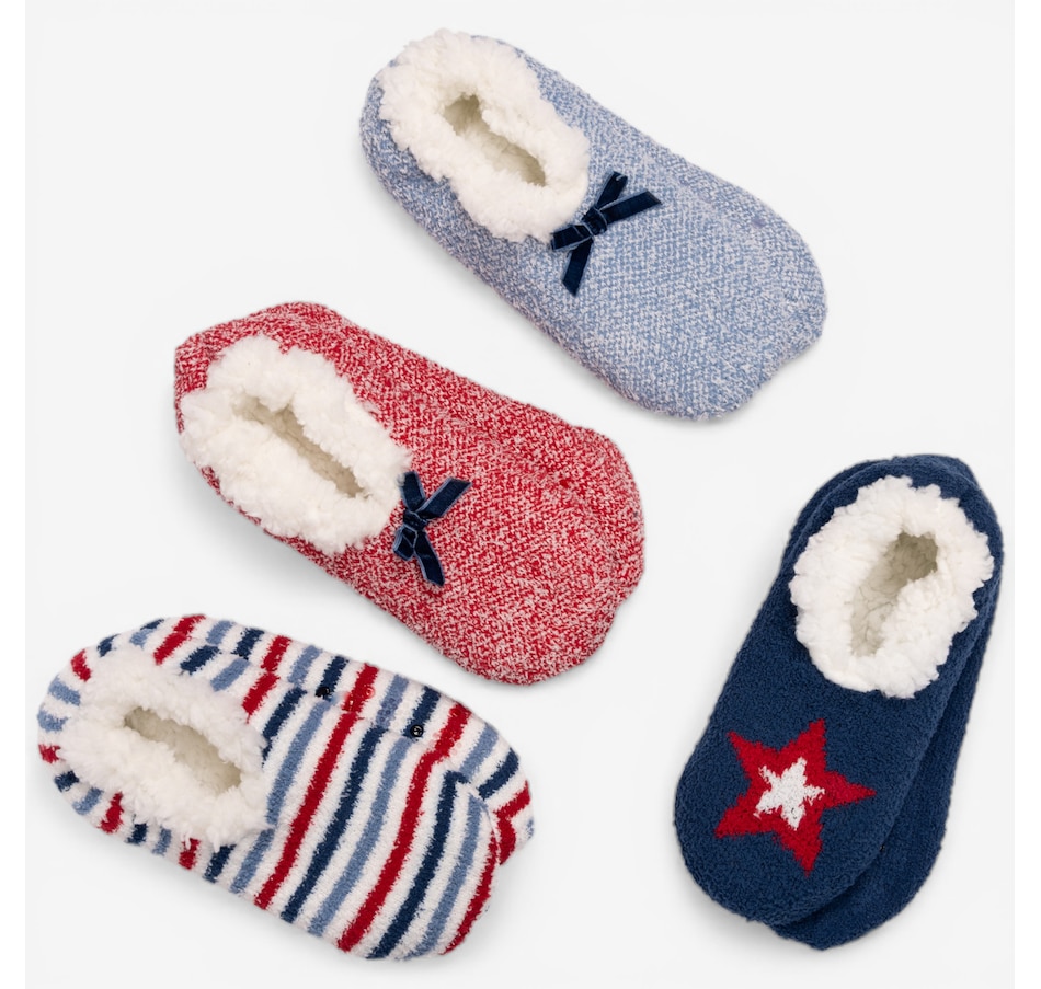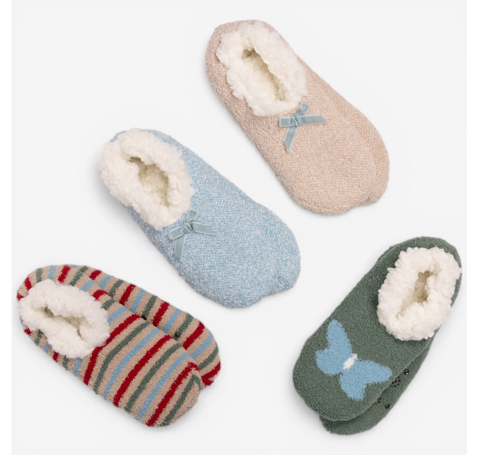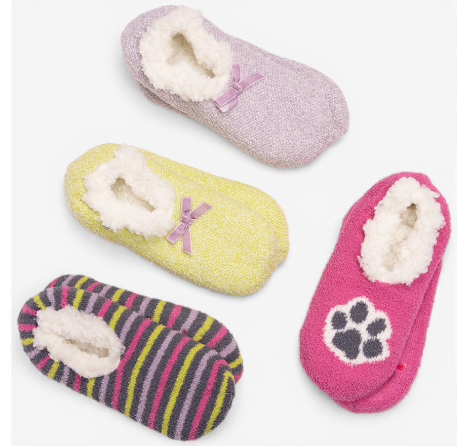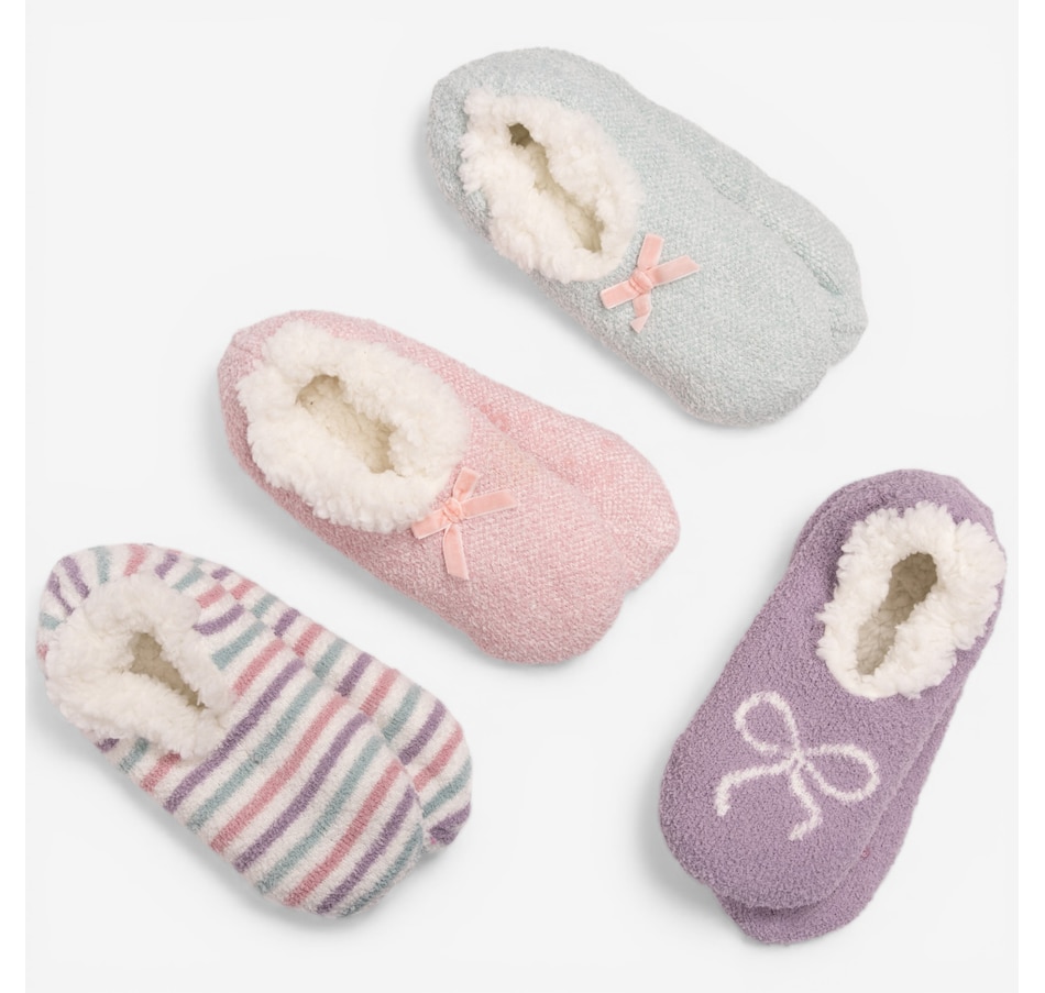 Give your feet the ultimate treat with Muk Luks’ aloe‑Infused ballerina slipper socks, a set of four ultra‑cozy pairs designed to wrap you in softness. Each pair features a plush cozy‑yarn outer and is lined with aloe‑infused faux shearling for a soothing, spa‑like feel that keeps you warm and comforted. Non‑skid Muk Luks grippers on the sole provide secure traction, making them ideal for lounging, relaxing, or winding down at home. Each pack includes a charming mix of styles: one motif pair, one stripe pair, and two marled pairs topped with sweet little bows. Finished with a to/from hangtag on every pair, this set is beautifully gift‑ready and perfect for sharing.