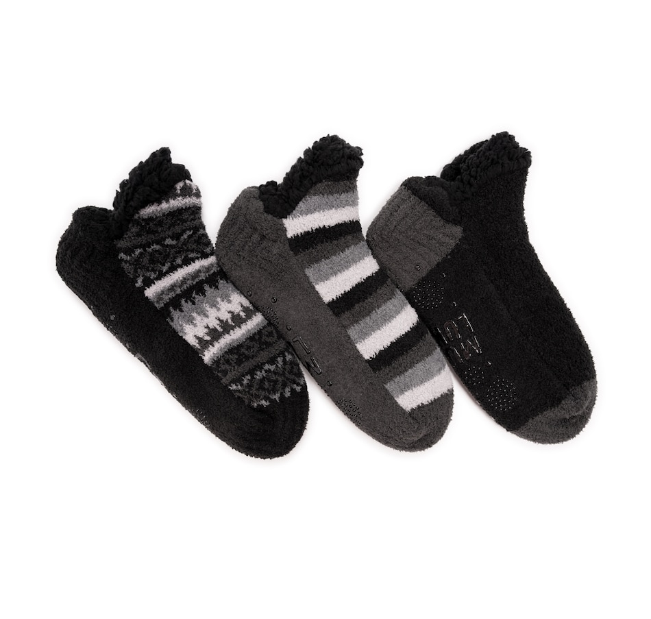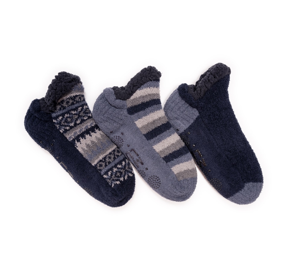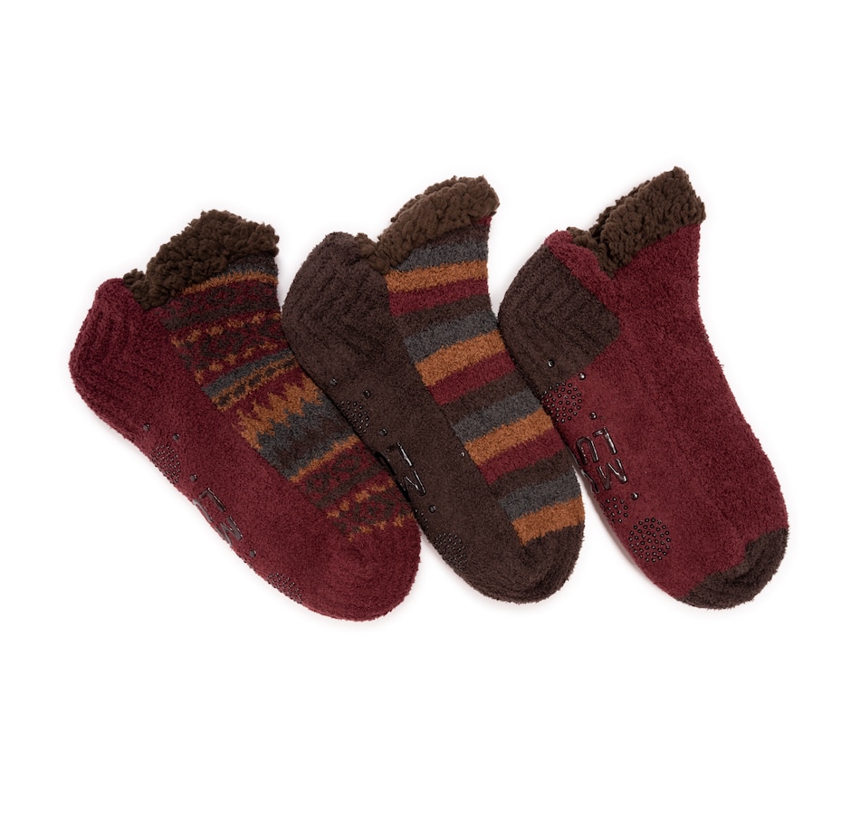This three-pack of cozy footie cabin socks feature a soft, aloe infused faux shearling lining to keep your toes warm and cozy. The non-skid grip pattern on the bottom of each sock helps to prevent slipping. Each set includes a fairisle, stripe and solid pair, and the To/From hangtag on each pair makes for great gift-giving.