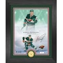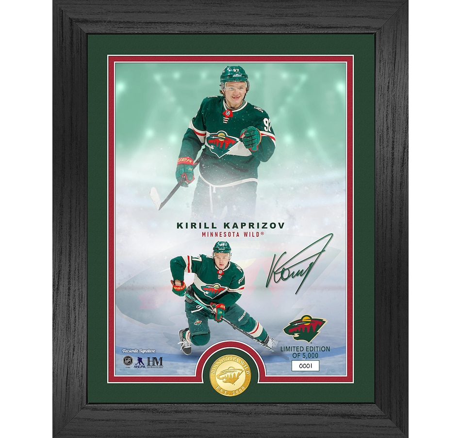 This limited-edition collectible frame is for the NHL’s best and brightest stars, featuring a custom designed photo combined with a minted coin. This 13" x 16" wood frame, with double matting and a glass front panel, features a hand numbered photo of Kirill Kaprizov with his facsimile (replica) signature. The unique photo with two images is combined with a 39mm minted bullion bronze team coin. A limited edition of only 5000 and officially licensed by the NHL and NHLPA, each photo mint is accompanied by a certificate of authenticity, making this a true collectible. This product is proudly made in the USA by The Highland Mint!