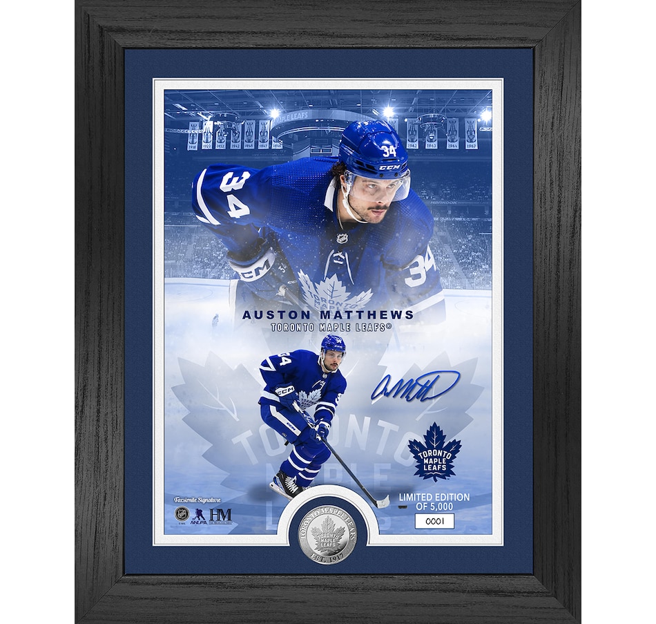 This limited edition 13" x 16" frame features, in double matting and under glass, a hand numbered 8" x 10" custom photo print of Auston Matthews in multiple action poses, as well as his facsimile (replica) signature, combined with a 39mm minted team silver plated coin. As a limited edition of only 5000 and officially licensed by the NHL and NHLPA, each photo mint is accompanied by a certificate of authenticity. This product is proudly made in the U.S.A. by The Highland Mint!