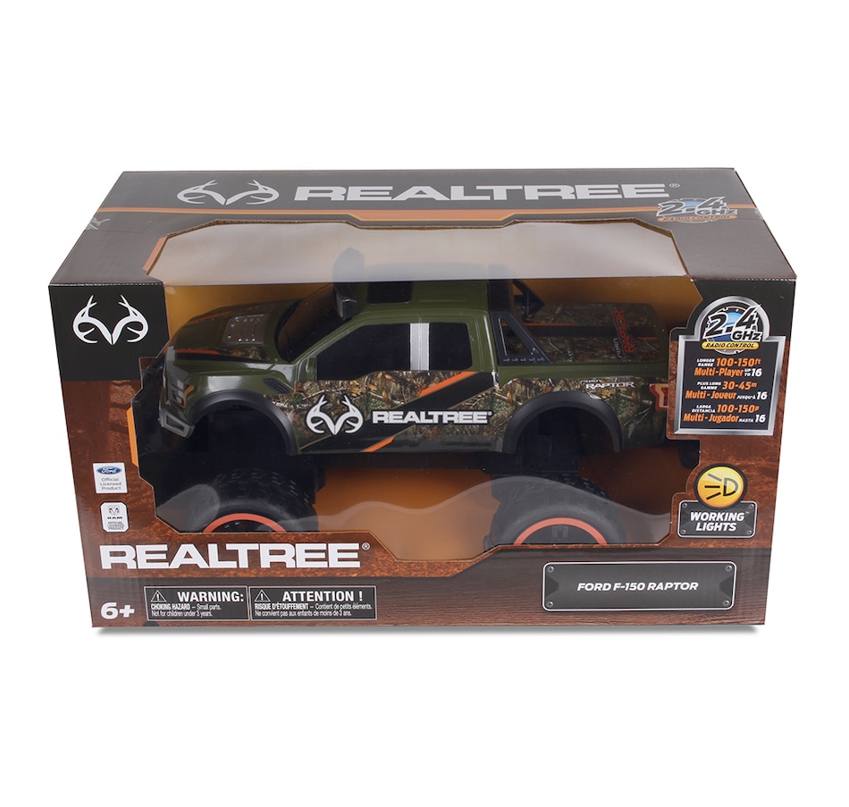 This 1:14 scale (14"L) full functional radio control F-150 Raptor is licensed by Ford Motors Company and Jordan Outdoors Enterprises. This truck is decorated with high quality and a realistic camouflage Realtree EDGE™ pattern with oversized wheels. It has high torque motor for incredible speed and working LED lights to navigate in the dark!