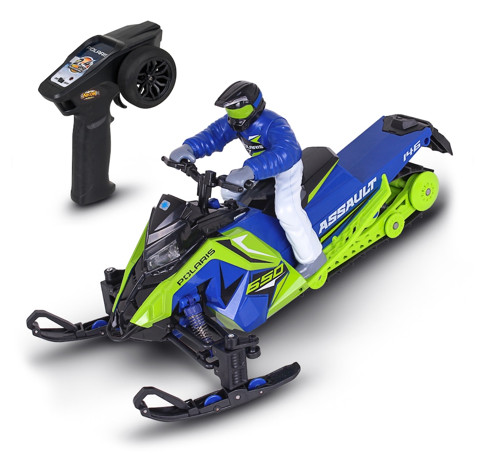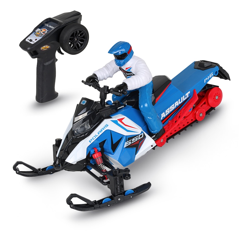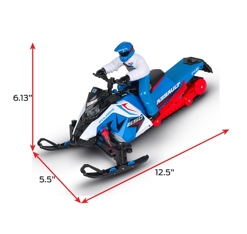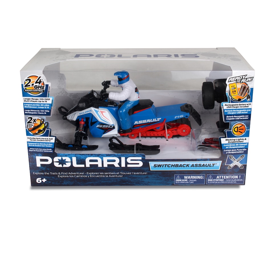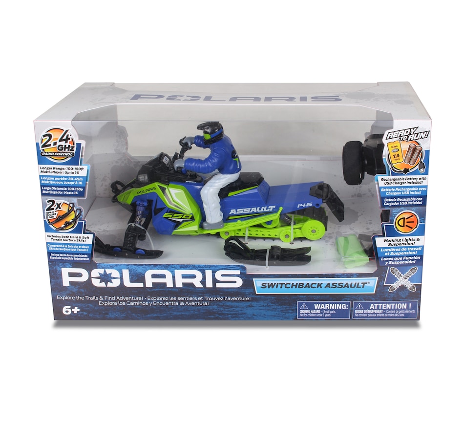 Gear up for a fun winter adventure with the Polaris Switchback Assault radio-controlled snowmobile. Engineered to handle the most demanding snow trails and icy landscapes, this ready-to-run snowmobile brings the thrill of Polaris's iconic snow machine to your fingertips. With its rugged build, precise controls and off-road versatility, this RC vehicle is perfect for snowmobile enthusiasts and RC adventurers alike. Whether you’re racing across snowy fields, carving through fresh powder or navigating icy trails, this RC snowmobile is designed to deliver the thrill of winter riding all year round. With its rugged features and high-performance capabilities, it’s the perfect winter toy for any snowmobile lover, and its rugged features, full suspension system and realistic details (e.g., working lights) are designed to provide endless fun on snow-covered tracks and trails.