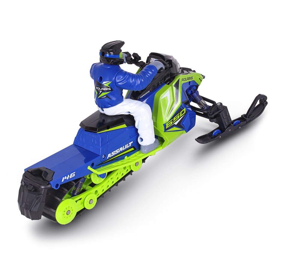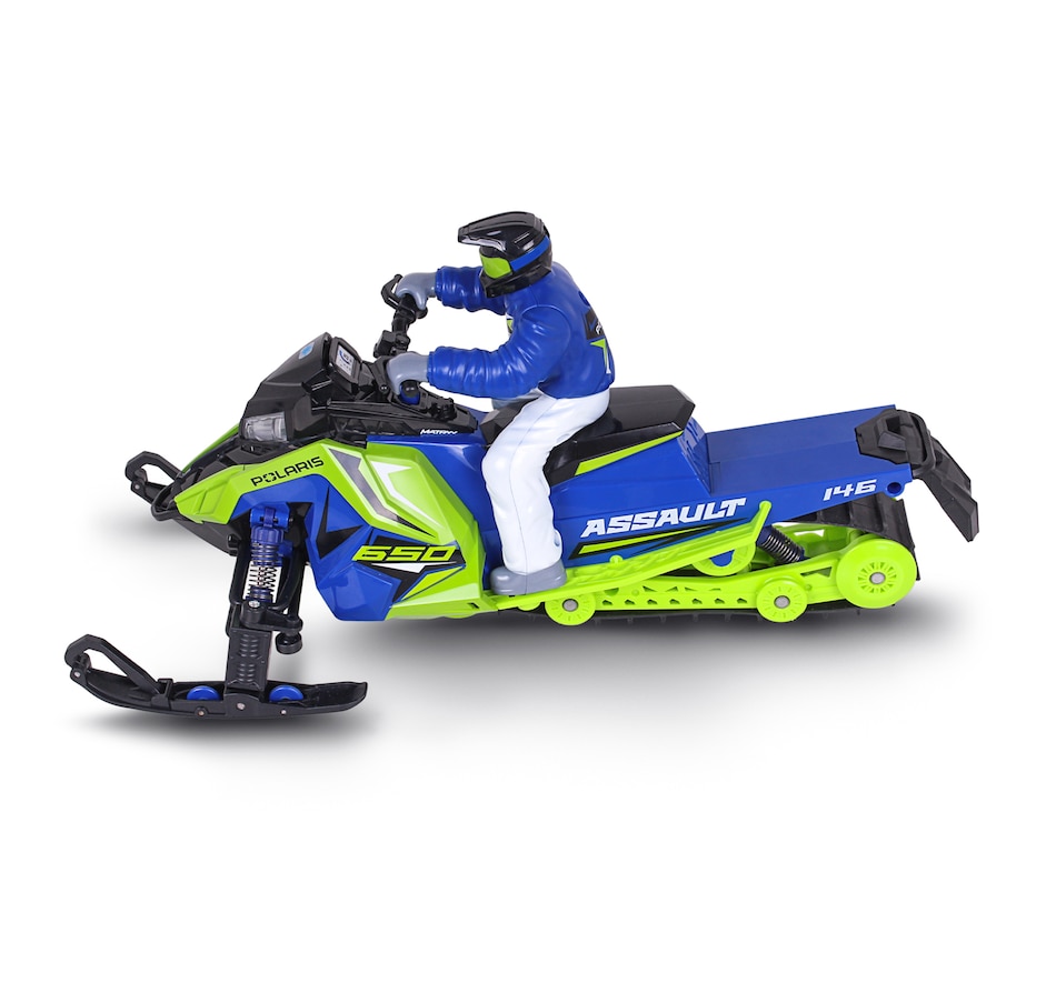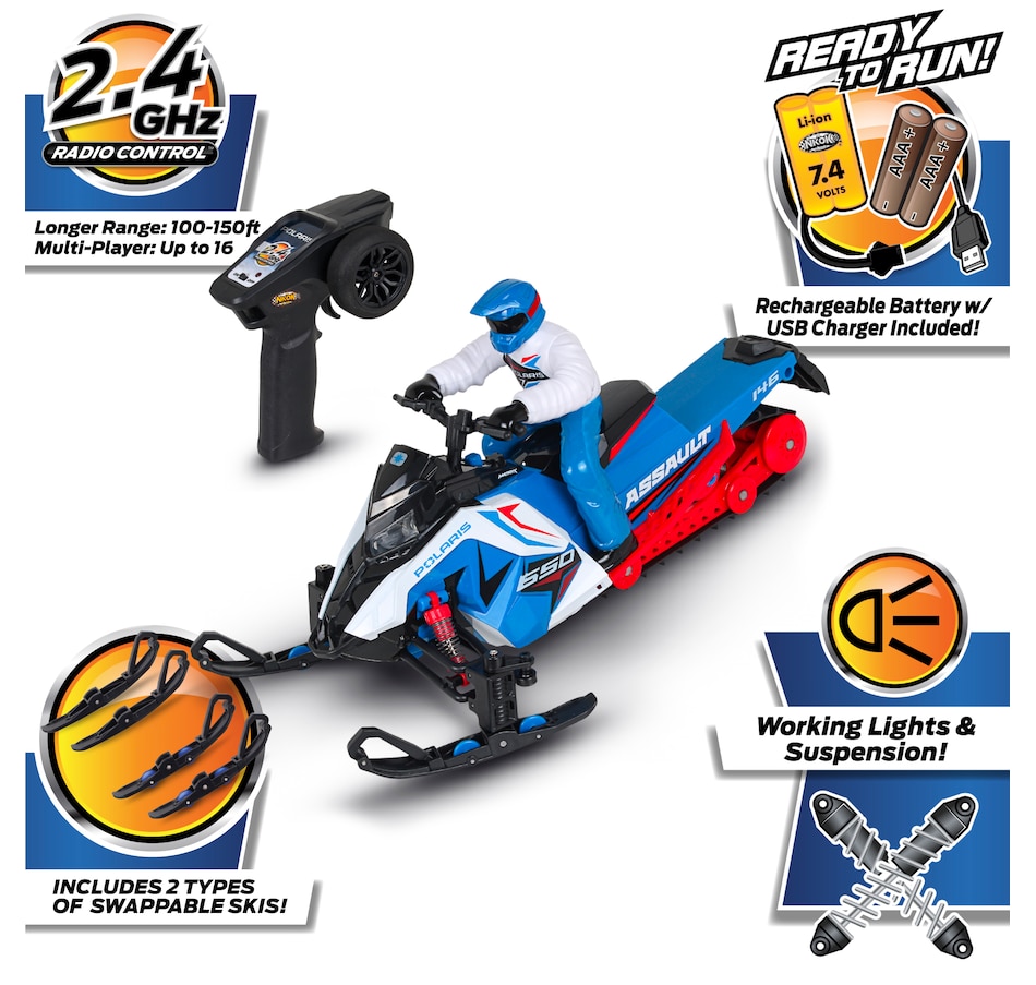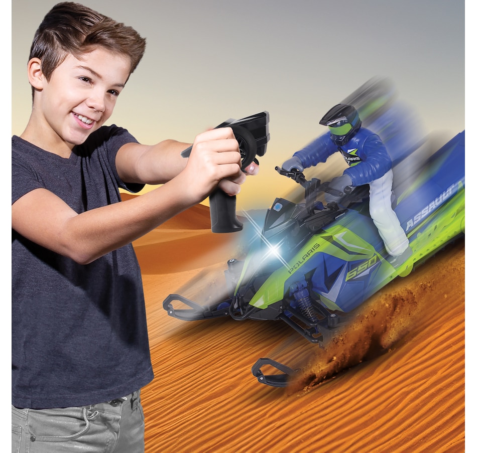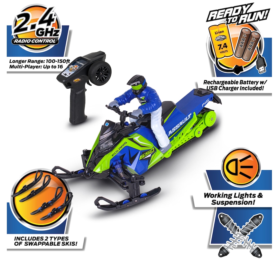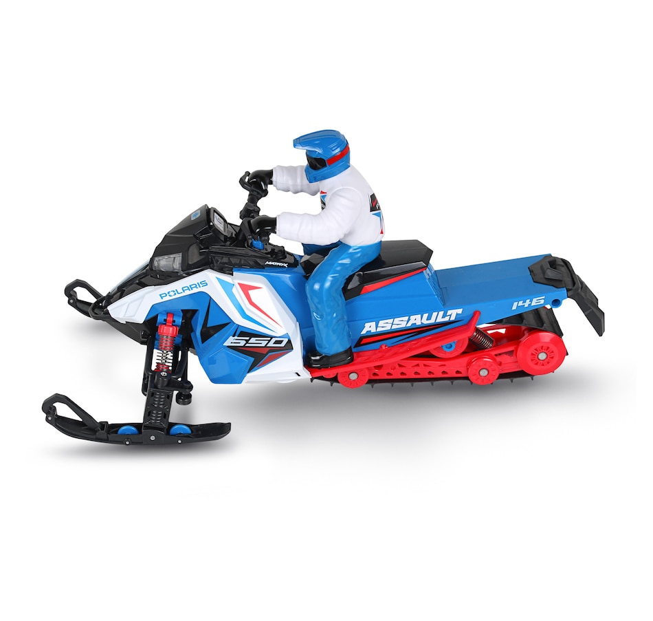 Gear up for a fun winter adventure with the Polaris Switchback Assault radio-controlled snowmobile. Engineered to handle the most demanding snow trails and icy landscapes, this ready-to-run snowmobile brings the thrill of Polaris's iconic snow machine to your fingertips. With its rugged build, precise controls and off-road versatility, this RC vehicle is perfect for snowmobile enthusiasts and RC adventurers alike. Whether you’re racing across snowy fields, carving through fresh powder or navigating icy trails, this RC snowmobile is designed to deliver the thrill of winter riding all year round. With its rugged features and high-performance capabilities, it’s the perfect winter toy for any snowmobile lover, and its rugged features, full suspension system and realistic details (e.g., working lights) are designed to provide endless fun on snow-covered tracks and trails.
