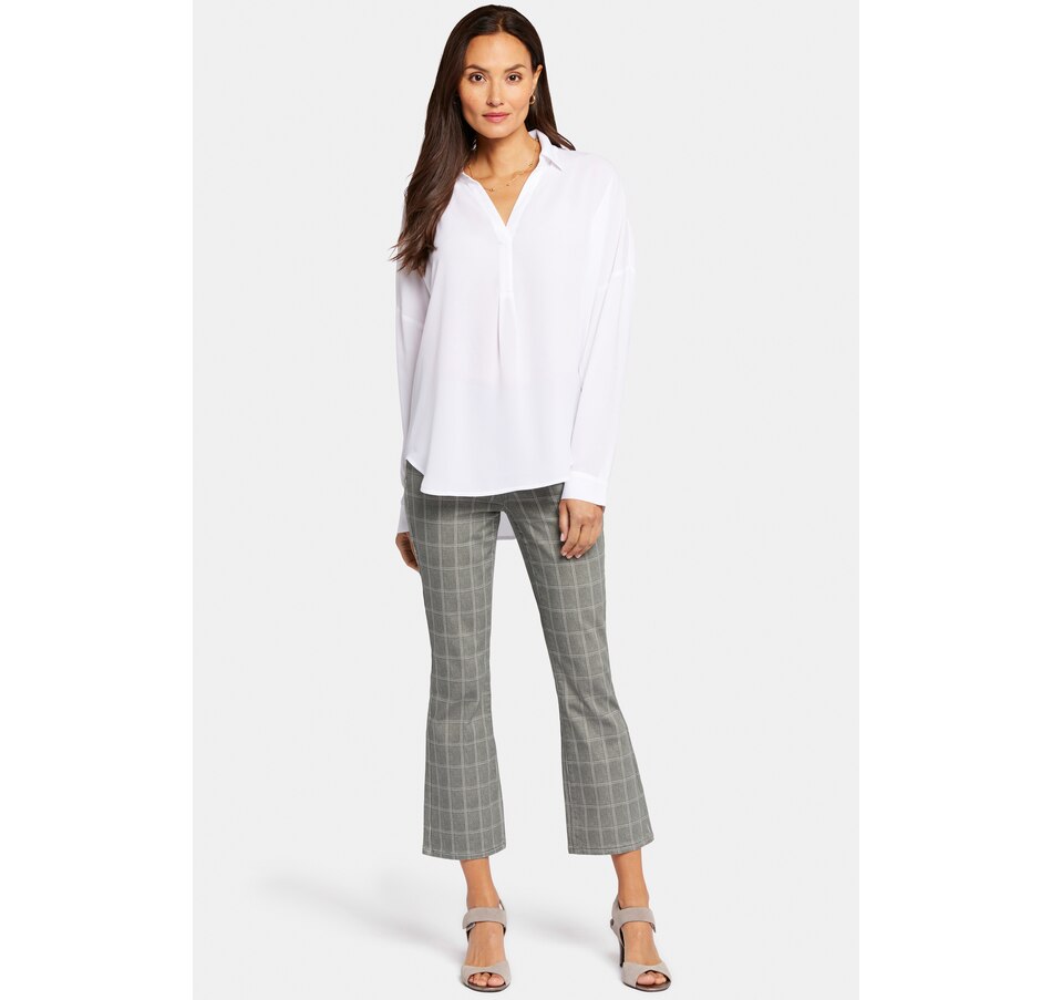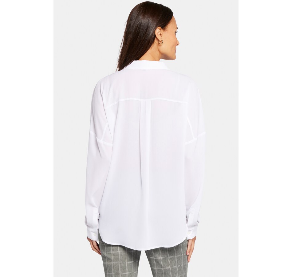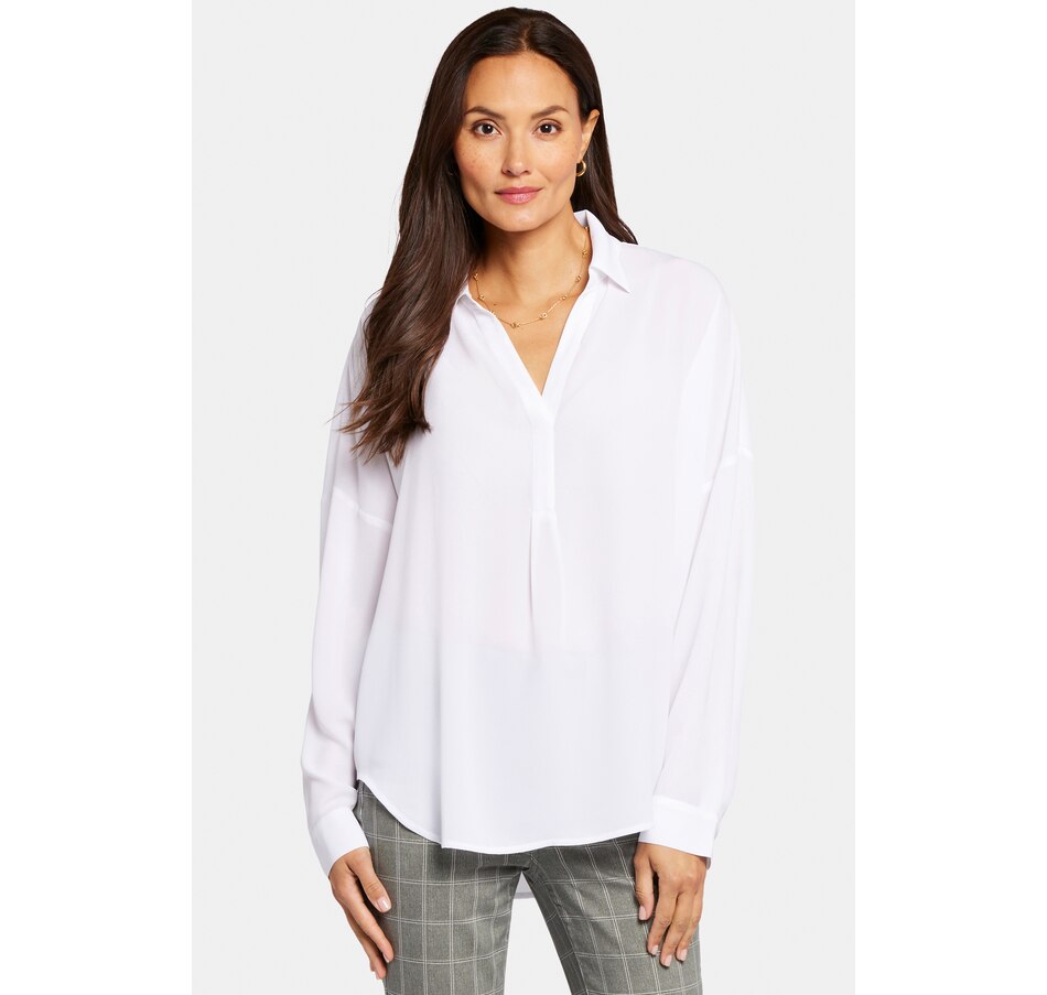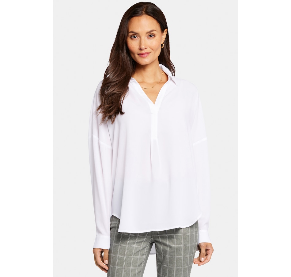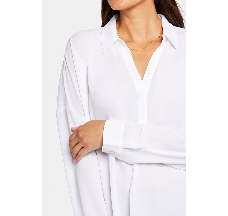 NYDJ's Becky blouse is made from georgette and has an impeccable drape. This collared pullover-style is a true wardrobe essential with fine tailored details and clean-finishes with a curved hem. It features a split neckline and dolman sleeves with button cuffs. The blouse's fabric is made from a sustainable polyester fibre created from 100% post-consumer plastic waste, resulting in less water, energy use and fewer greenhouse gas emissions without changing the look and feel of the fabric. The buttons are made with 50% post-consumer recycled polyester.