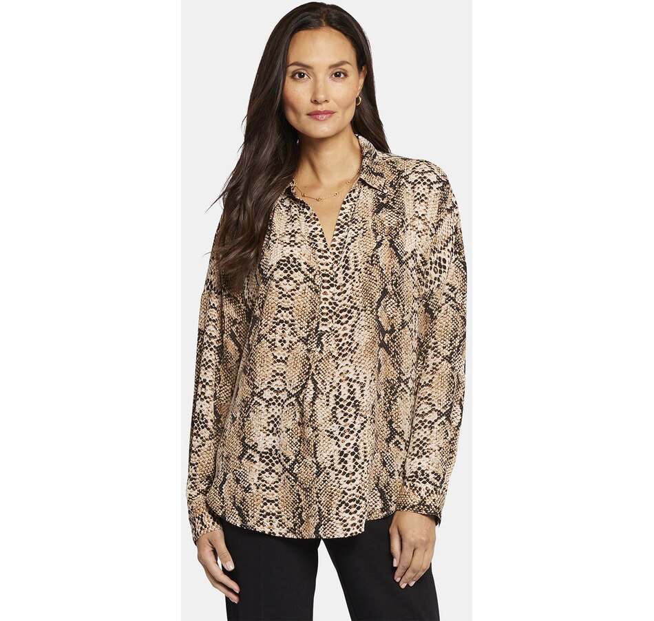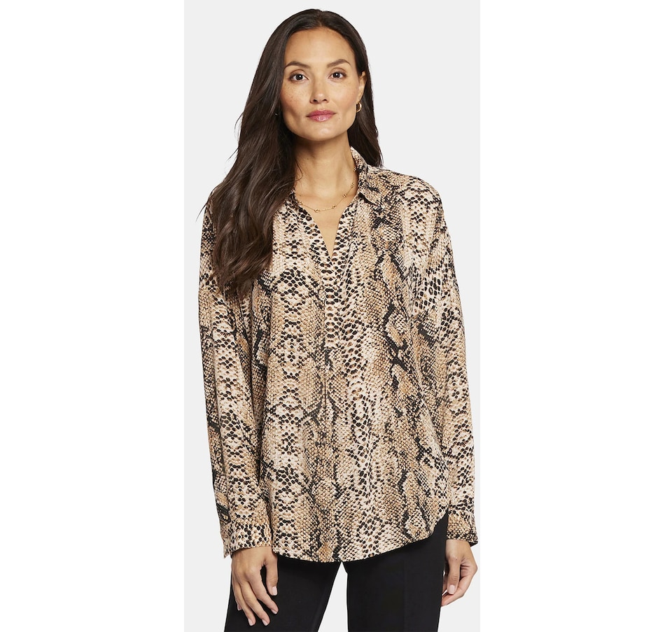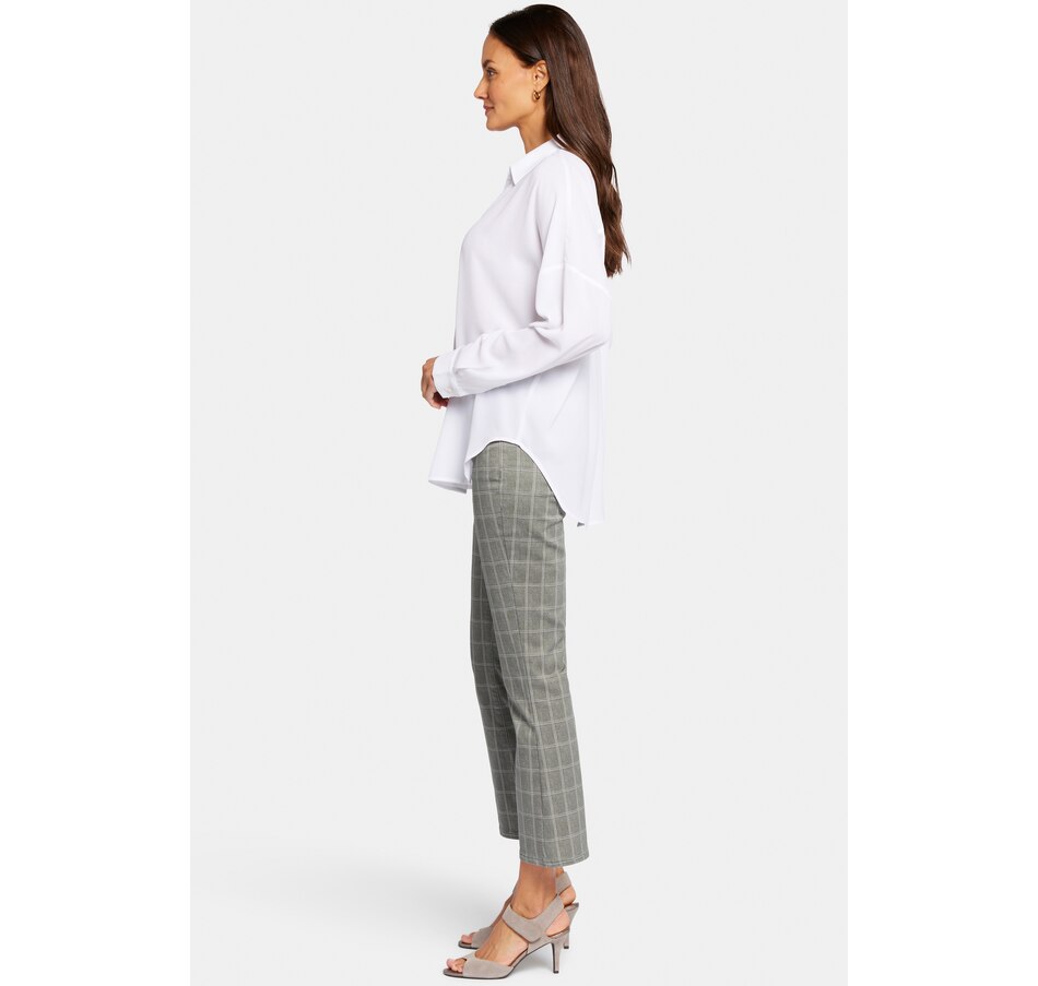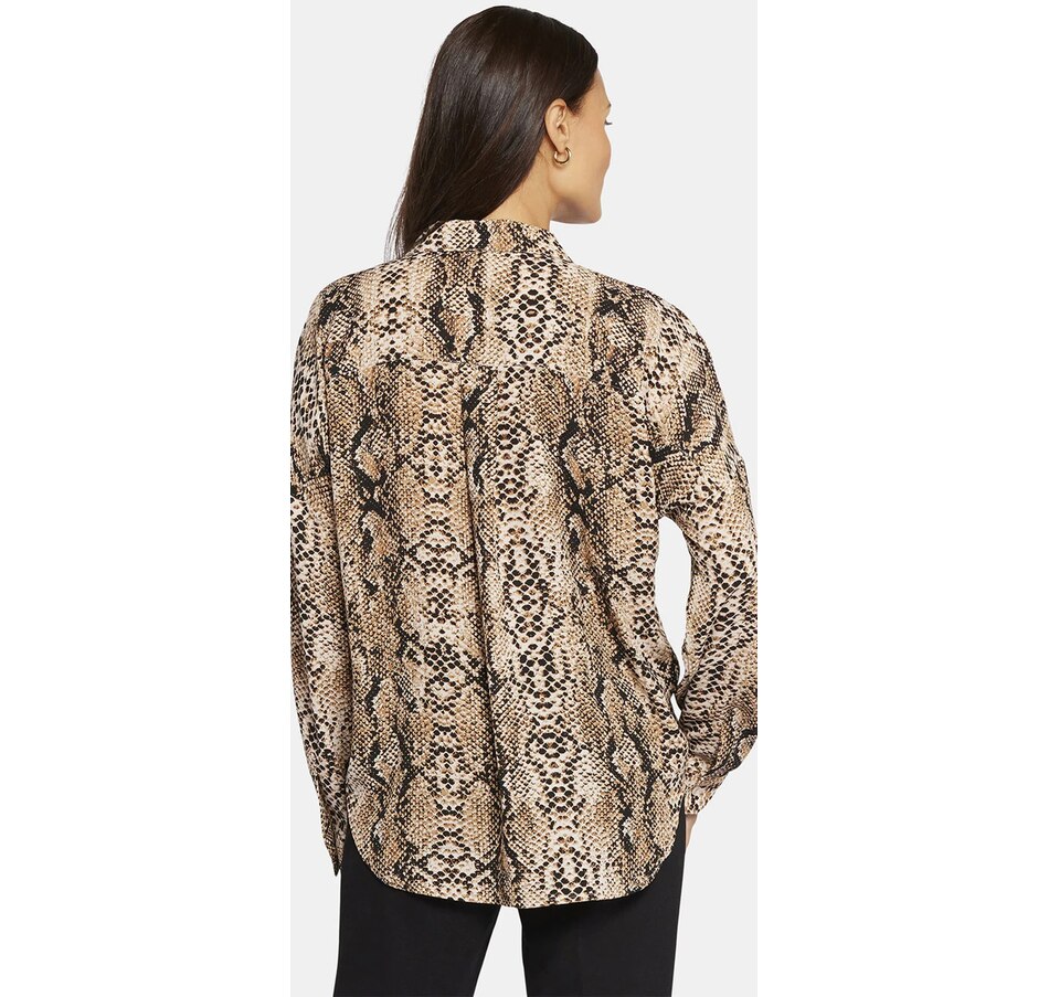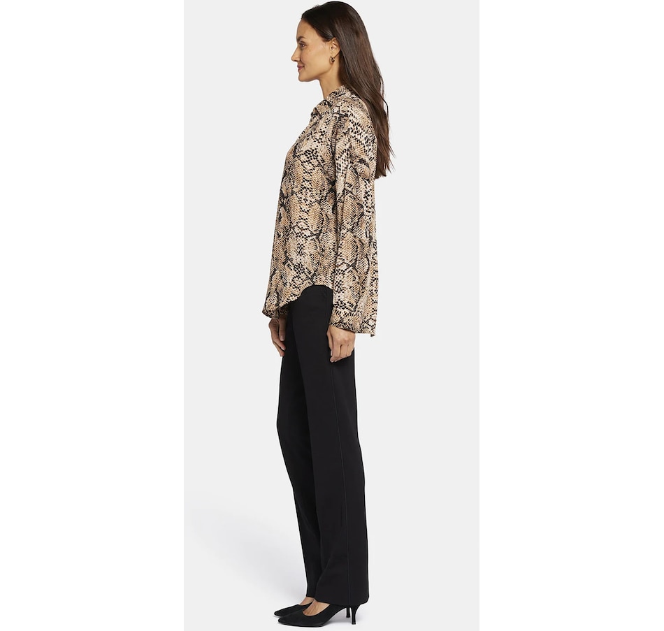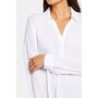 NYDJ's Becky blouse is made from georgette and has an impeccable drape. This collared pullover-style is a true wardrobe essential with fine tailored details and clean-finishes with a curved hem. It features a split neckline and dolman sleeves with button cuffs. The blouse's fabric is made from a sustainable polyester fibre created from 100% post-consumer plastic waste, resulting in less water, energy use and fewer greenhouse gas emissions without changing the look and feel of the fabric. The buttons are made with 50% post-consumer recycled polyester.