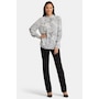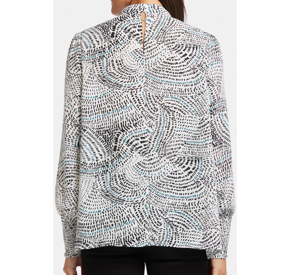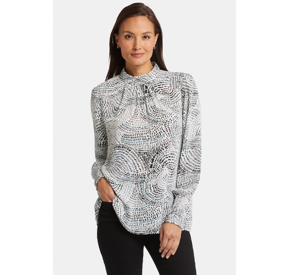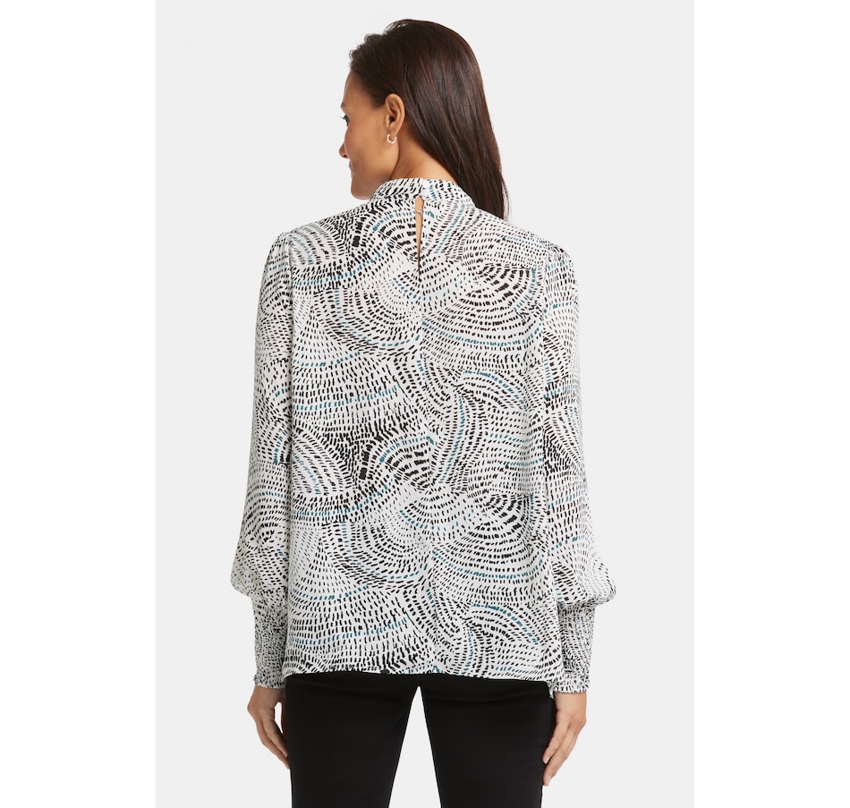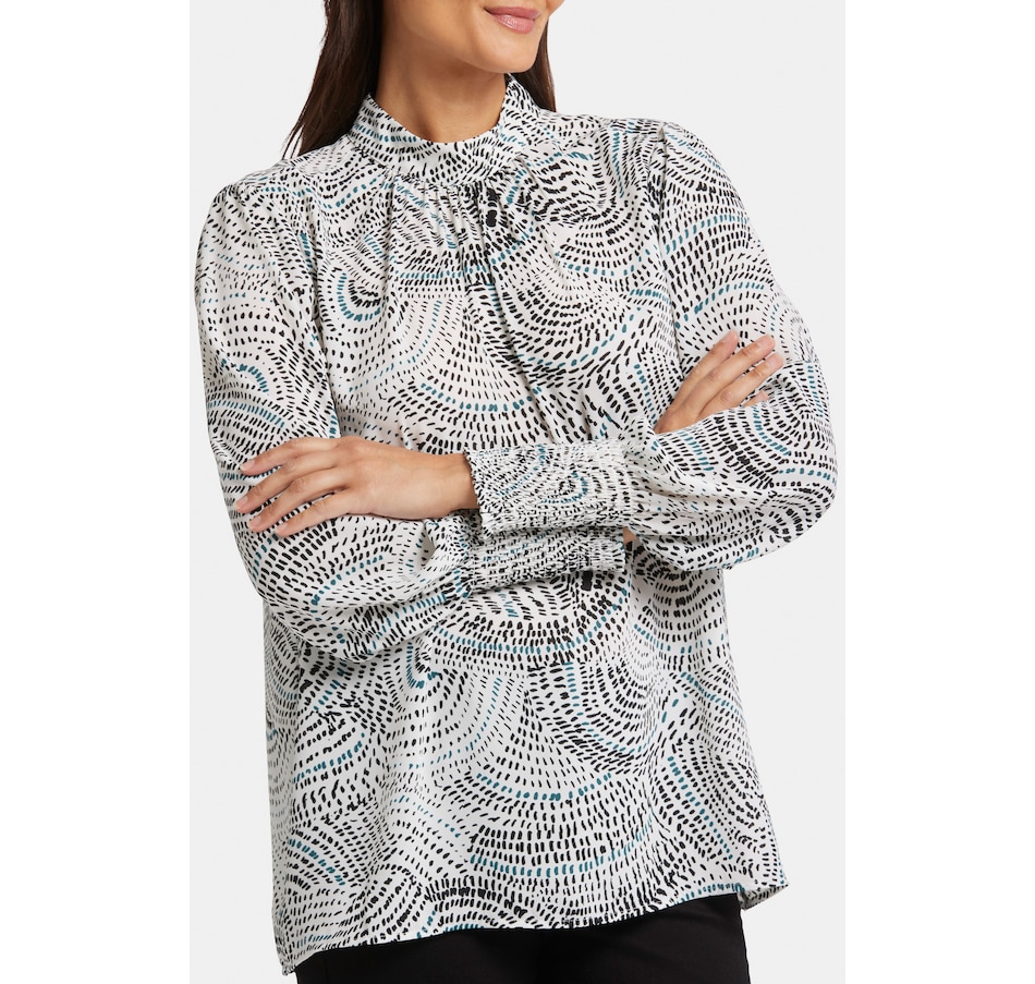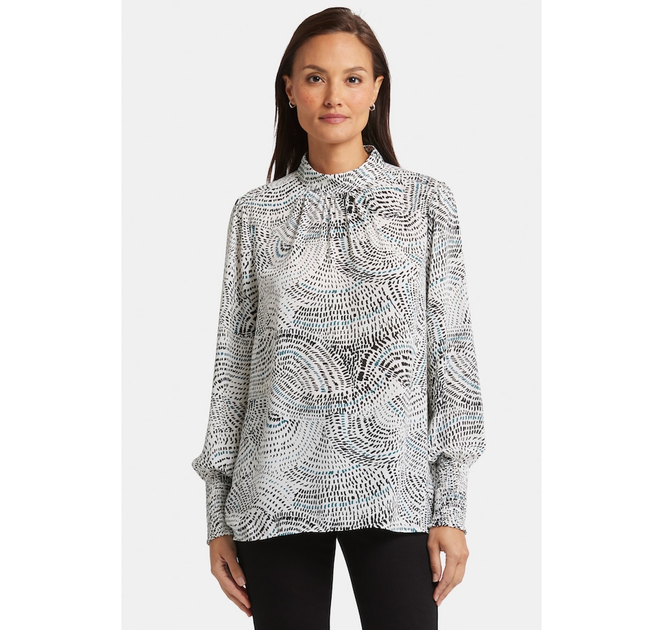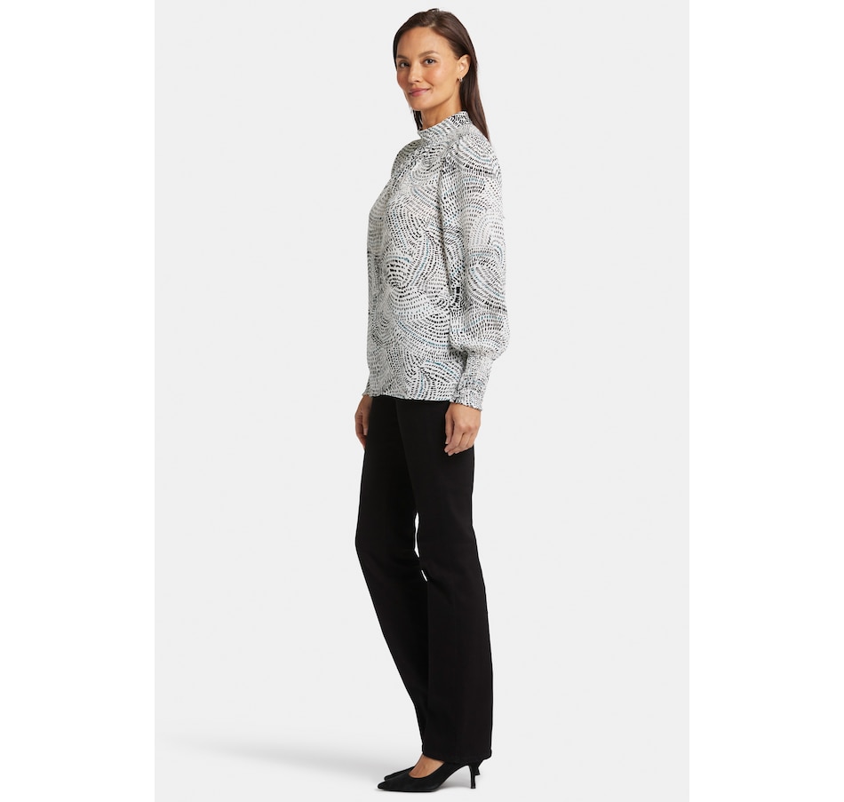 Introducing NYDJ's Britney blouse, where timeless elegance meets modern comfort. Crafted with meticulous attention to detail, this blouse features a sophisticated band collar and delicate front gathers. The long, full sleeves are gathered into stretch smock cuffs, making for a tailored yet effortlessly relaxed fit. This blouse is made with a sustainable polyester fibre created from 100% post-consumer plastic waste, resulting in less water and energy use and fewer greenhouse gas emissions without changing the look and feel of the fabric.