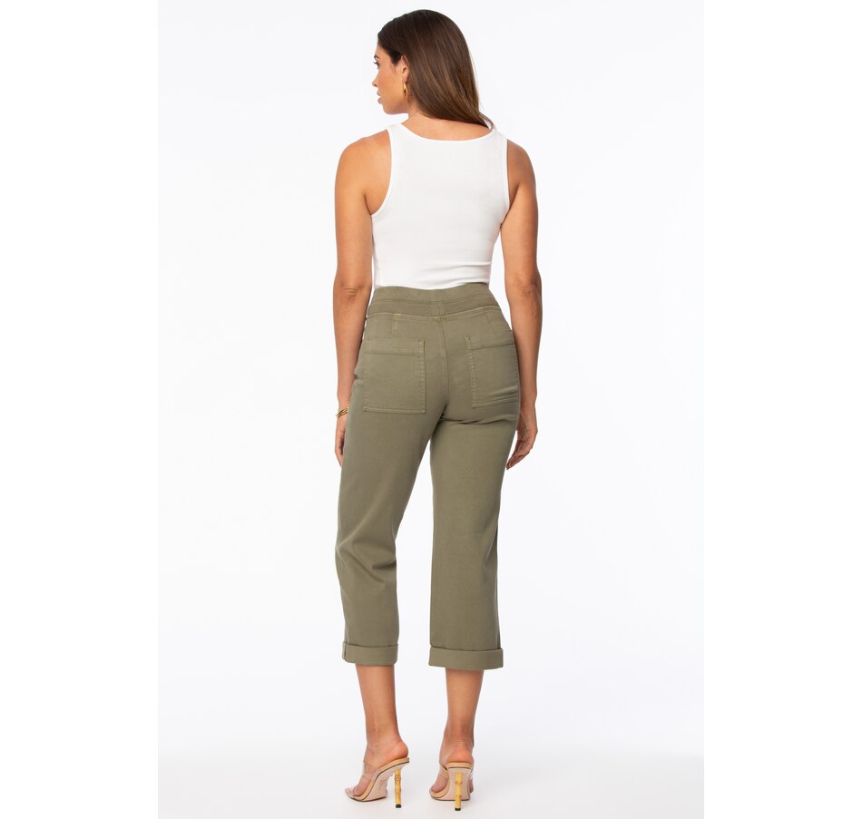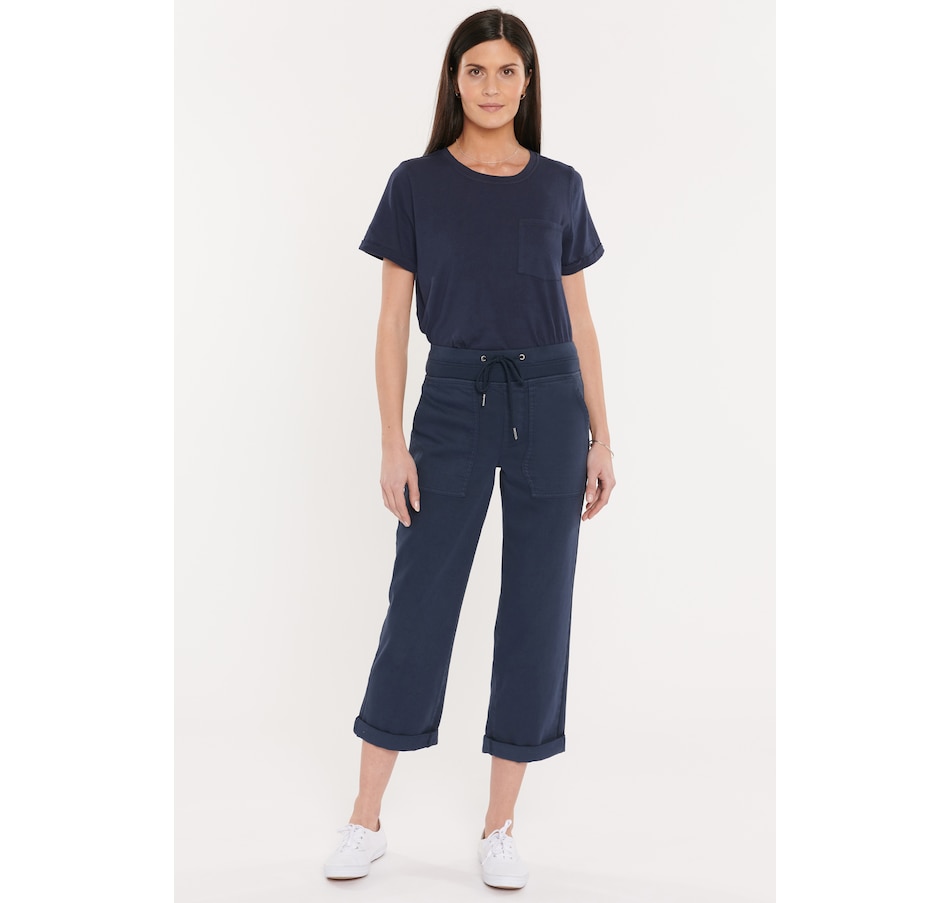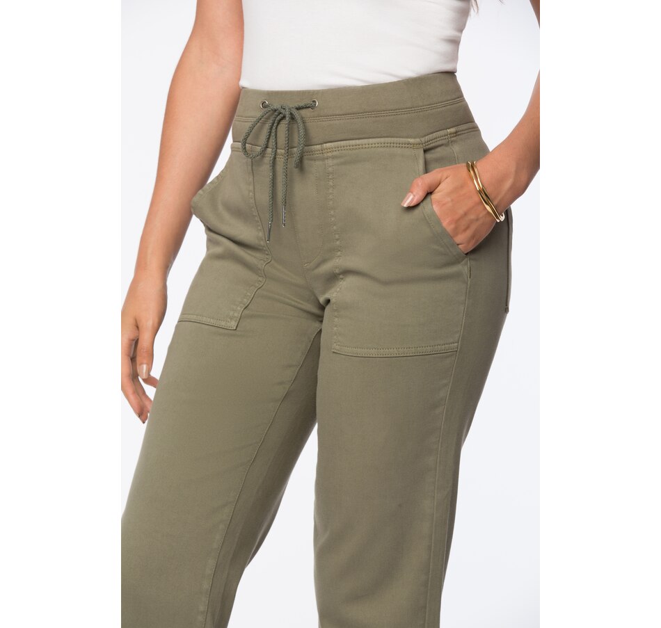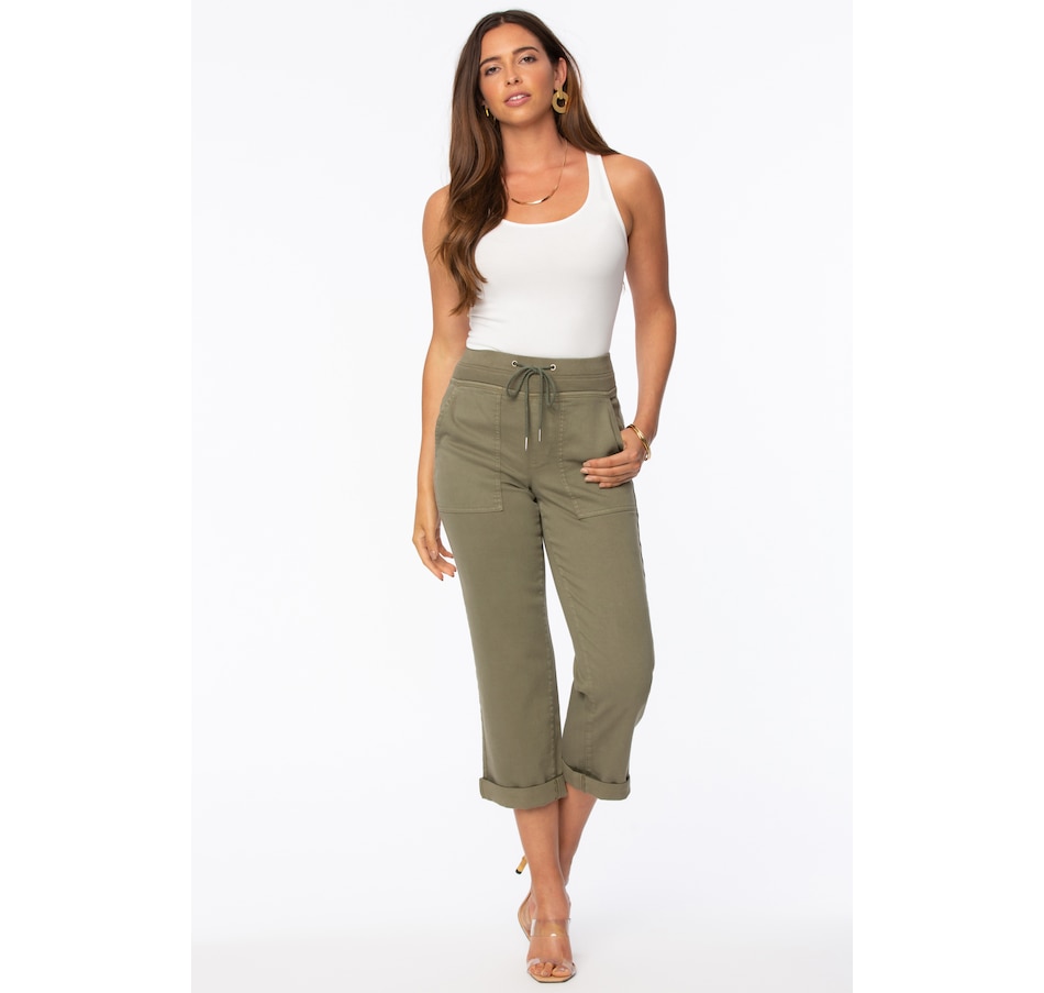 The drawstring cargo pants in stretch twill by NYDJ feel deliciously relaxed with their stretch drawstring tie waist and rolled front cargo pockets with back patch pockets add a utility finish to these casual jogger-like bottoms. To keep them ultra flattering, NYDJ's Lift Tuck Technology uses a proprietary slimming panel with a patented criss-cross designdesign that smooths and supports curves.