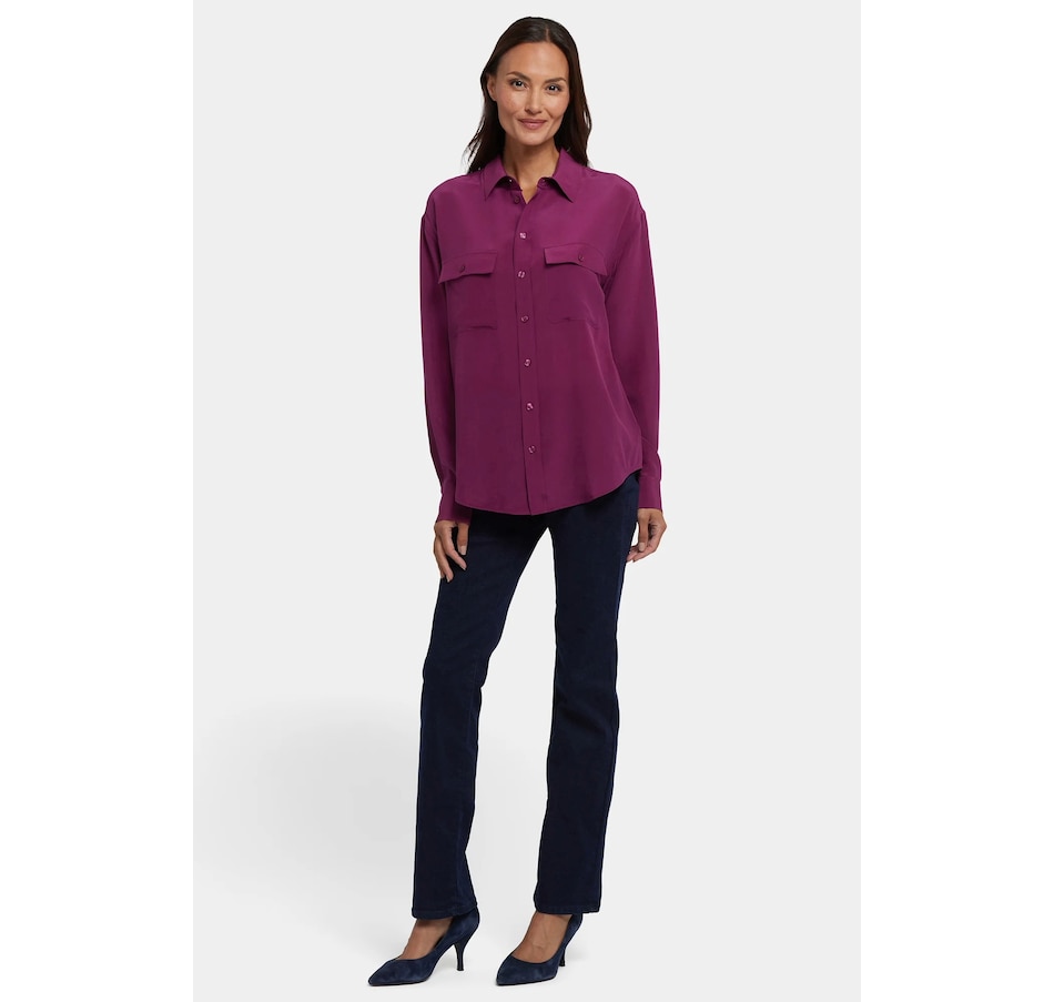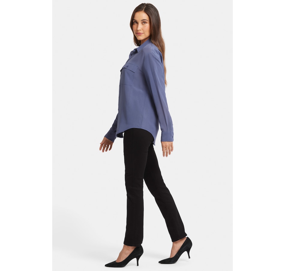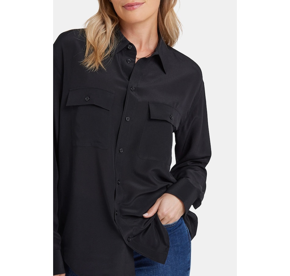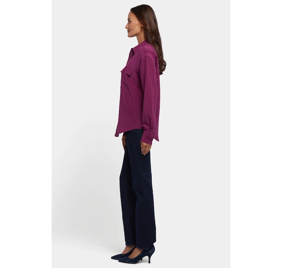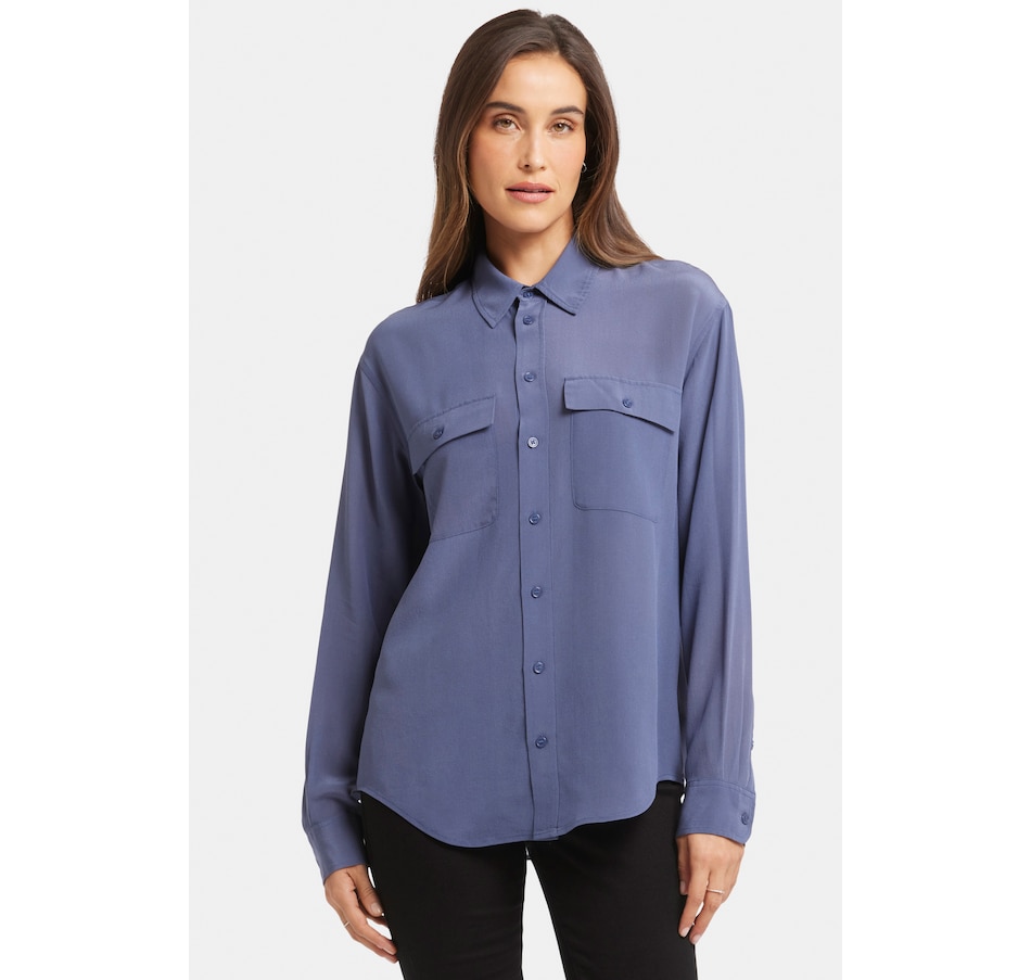 Luxurious with a utility-like twist, the Lauren silk blouse has classic shirt details including a point collar, a front button closure, long sleeves with button cuffs and a curved hem. The fit is just relaxed enough to pair with any jean or pant silhouette, and the design is finished with front button-flap patch pockets.