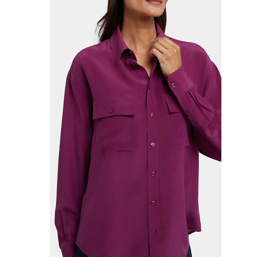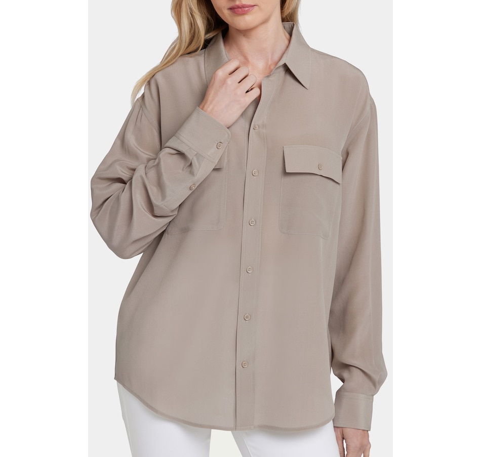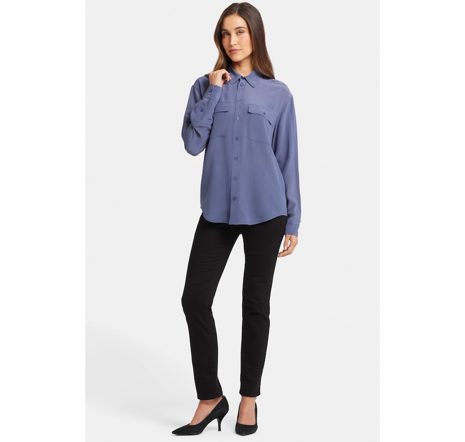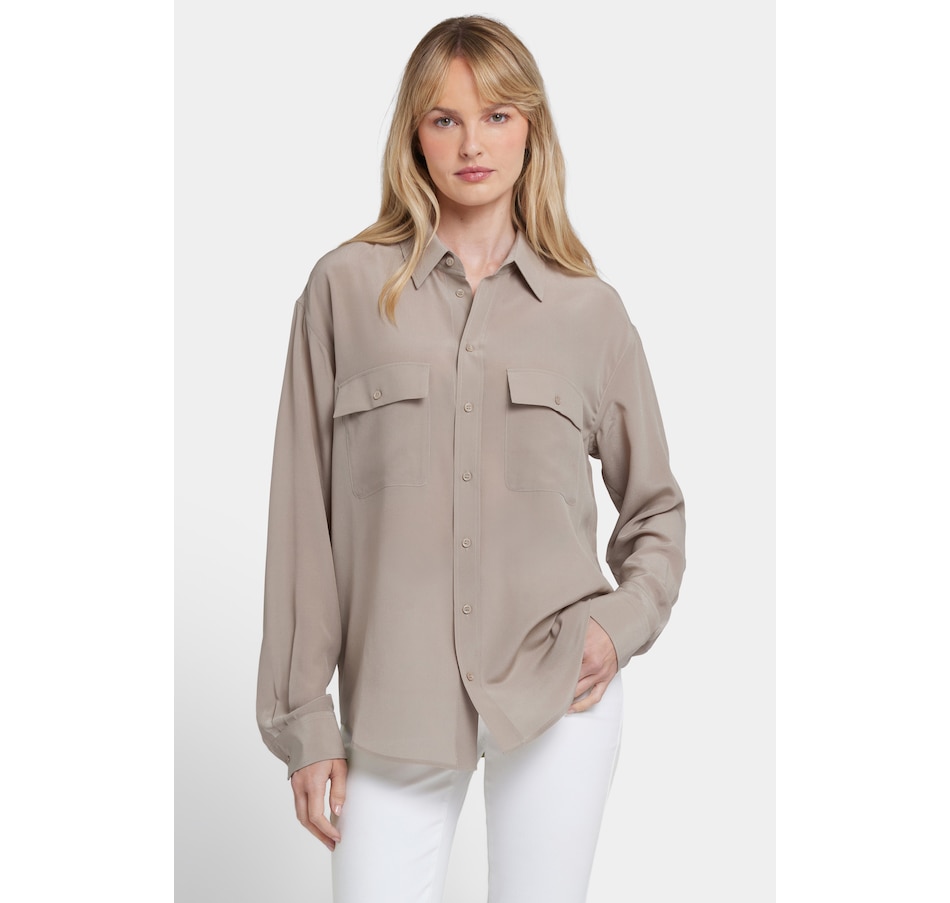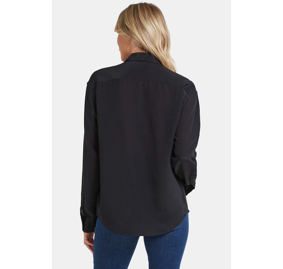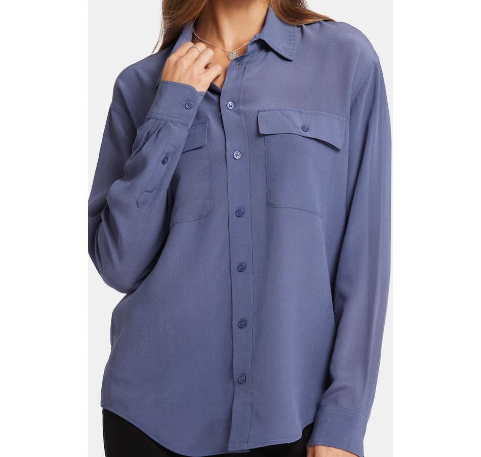 Luxurious with a utility-like twist, the Lauren silk blouse has classic shirt details including a point collar, a front button closure, long sleeves with button cuffs and a curved hem. The fit is just relaxed enough to pair with any jean or pant silhouette, and the design is finished with front button-flap patch pockets.