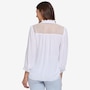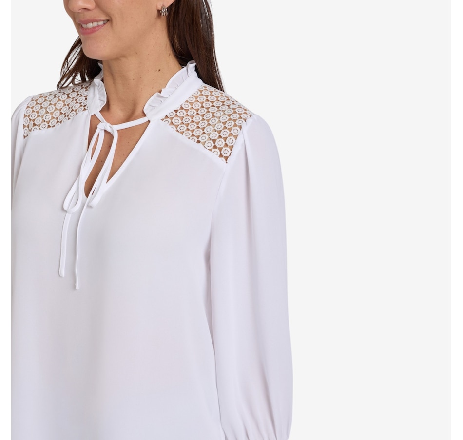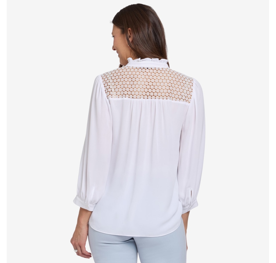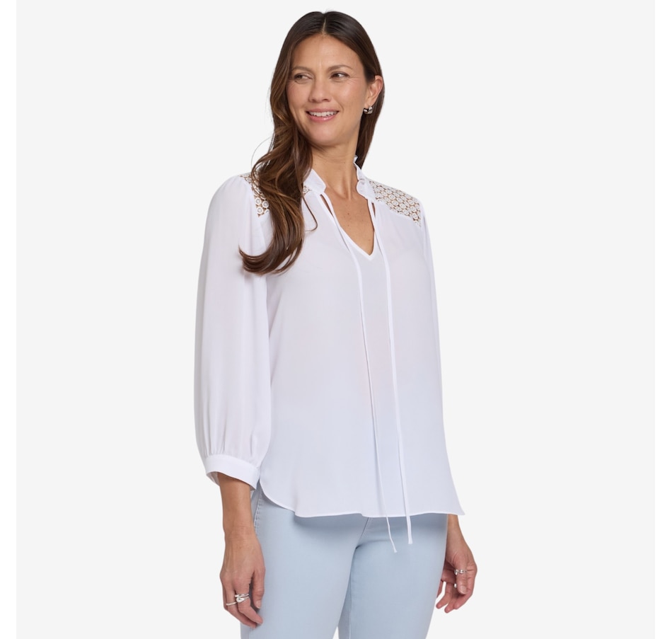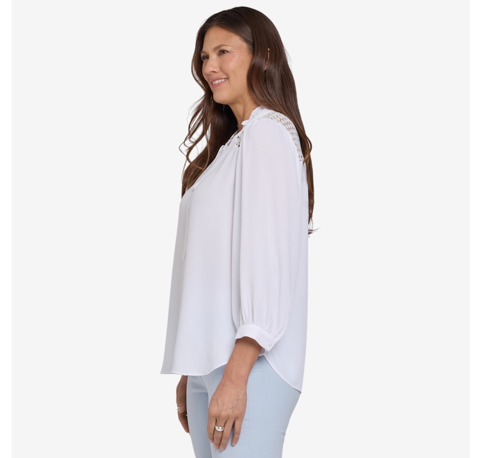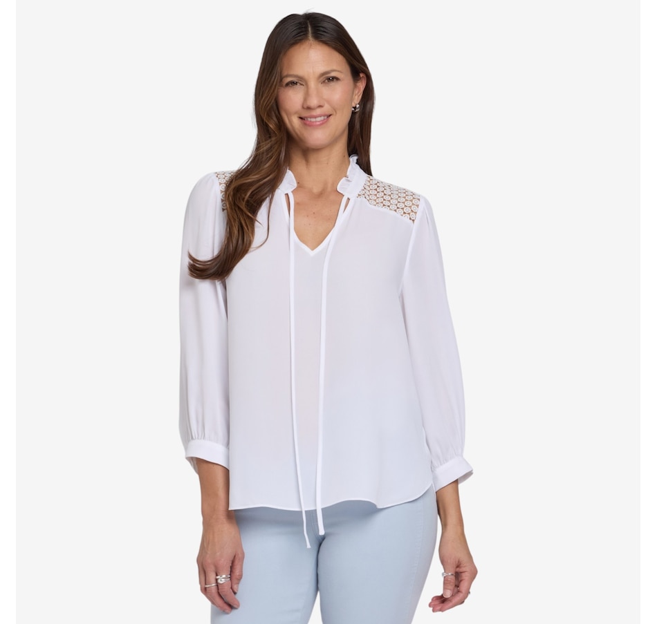 Add a touch of romance to your everyday style with NYDJ’s Lorelei lace yoke blouse, a beautifully detailed piece that elevates even the simplest denim. Designed with exquisite craftsmanship, it features a delicate sheer lace yoke, a soft ruffle collar, and a split neckline with ties that can be worn neatly in a bow or left undone for effortless charm. Long sleeves gathered into button cuffs bring graceful movement, while the flattering curved hem creates an elegant, easy silhouette. Made from lightweight, wrinkle‑resistant fabric crafted with sustainable polyester derived from 100% post‑consumer plastic waste, this blouse offers the same luxurious look and feel with a lighter environmental footprint.