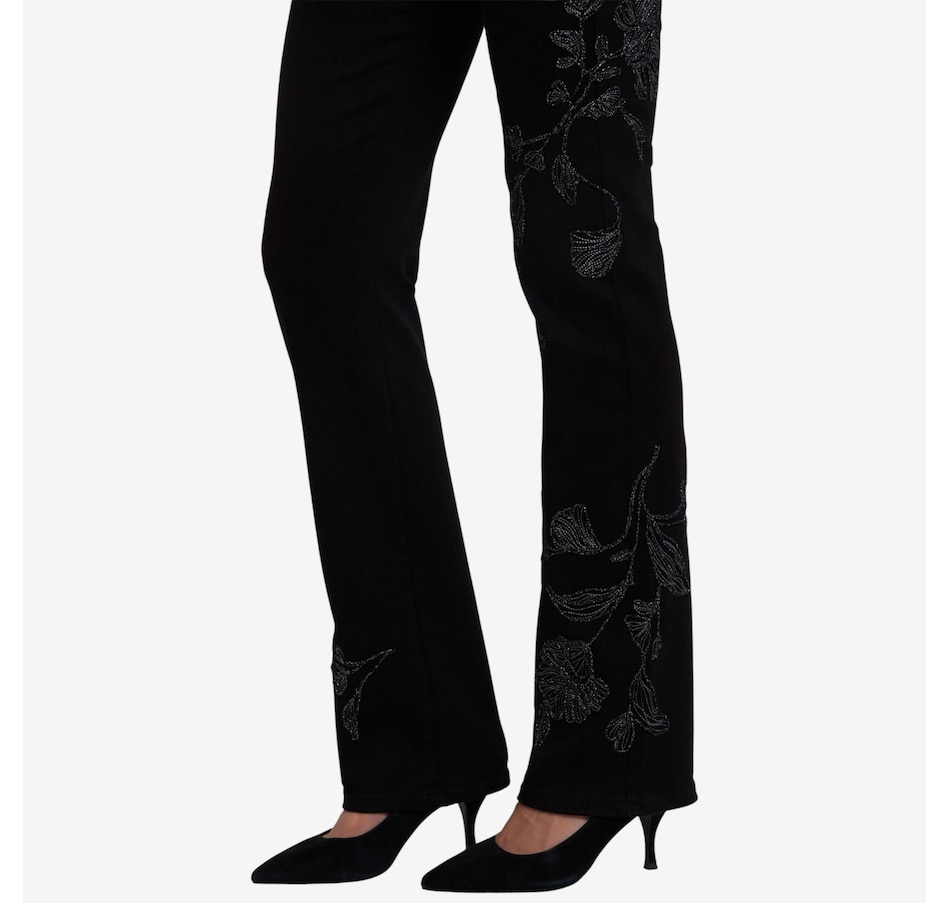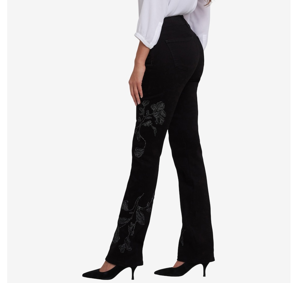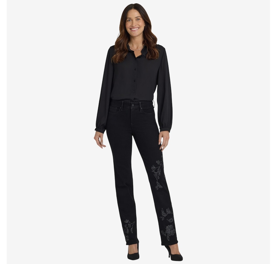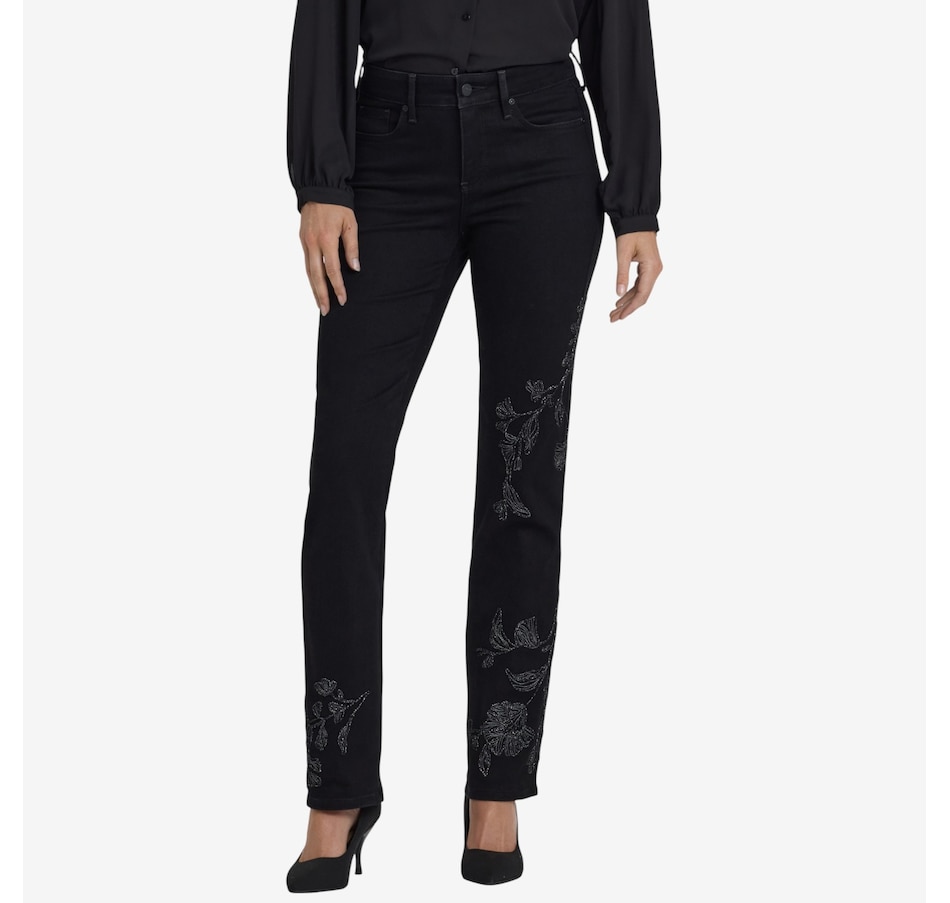 The Marilyn incorporates NYDJ's iconic bestselling fit. The curve-sculpting, figure-elongating construction of this jean pairs well with everything, in a classic straight-leg silhouette. This style has front embroidery that gives it a unique boho-chic look. Lift Tuck technology uses a proprietary slimming panel with a patented criss-cross design to shape and support your curves. It features a zip fly with button closure, classic five-pocket styling, and belt loops. This jean is made with earth-friendly methods that result in reduced consumption of water, chemicals and/or energy.