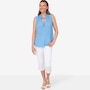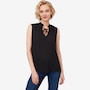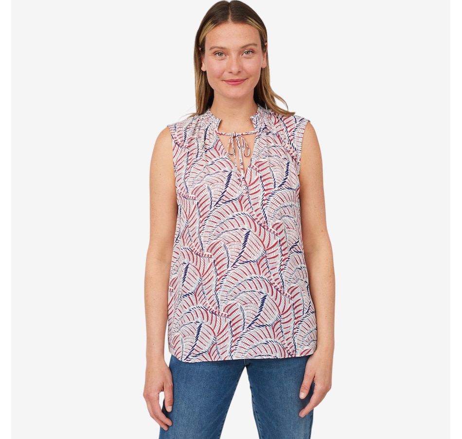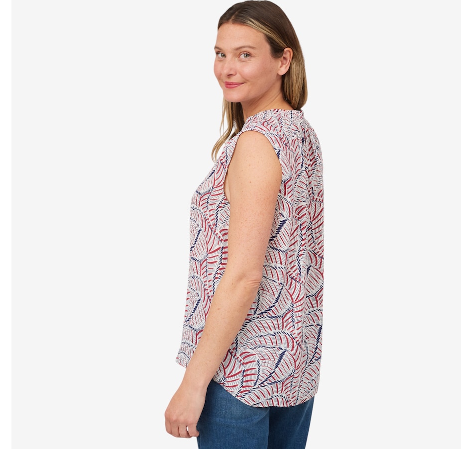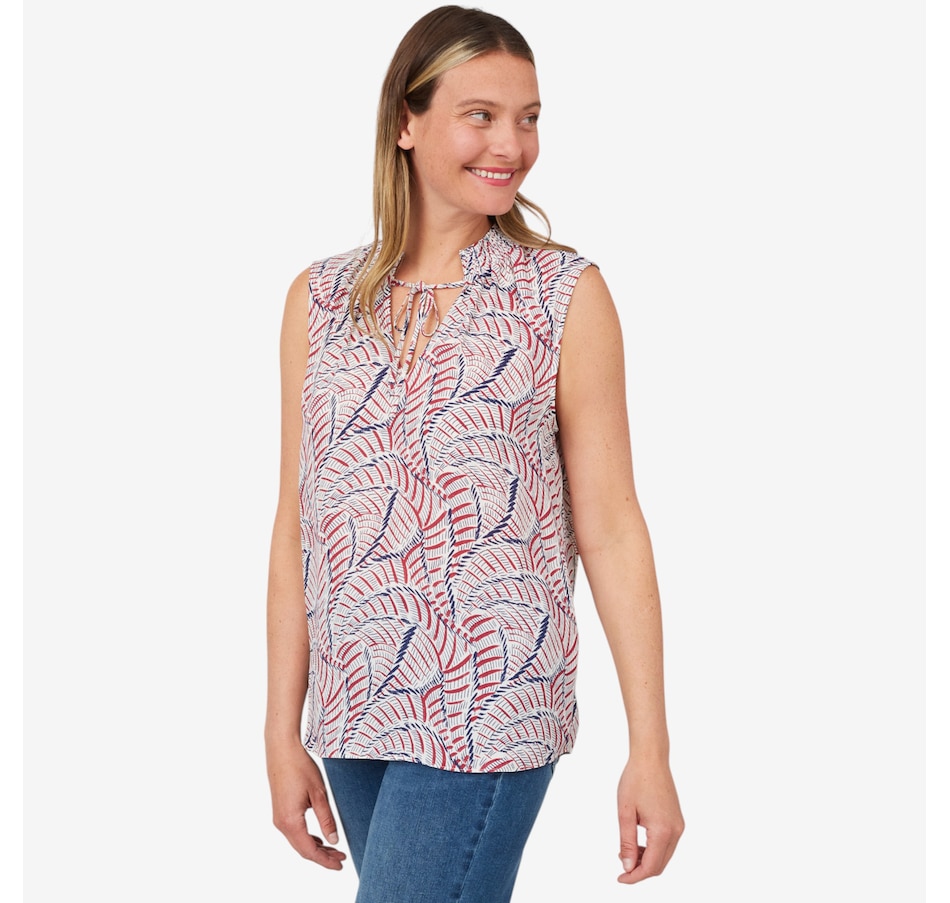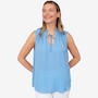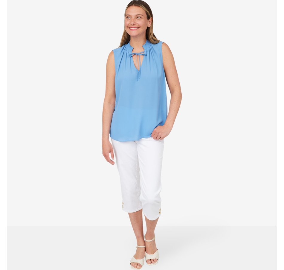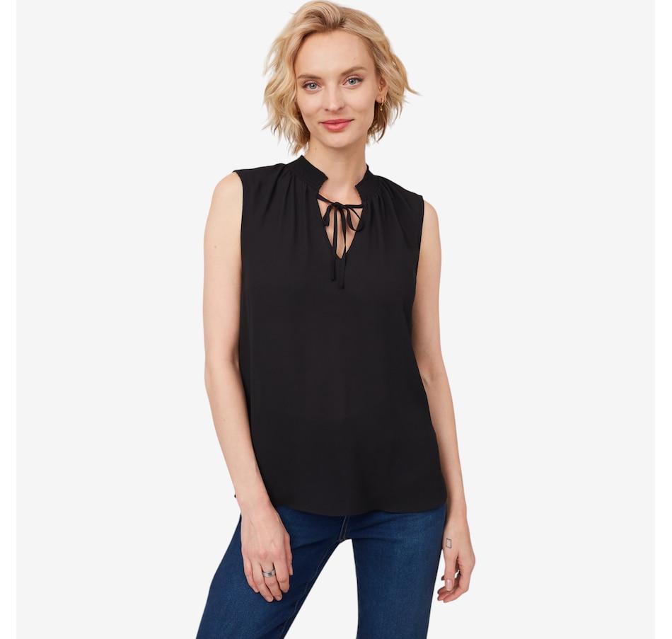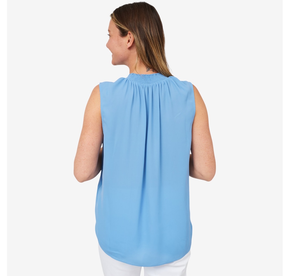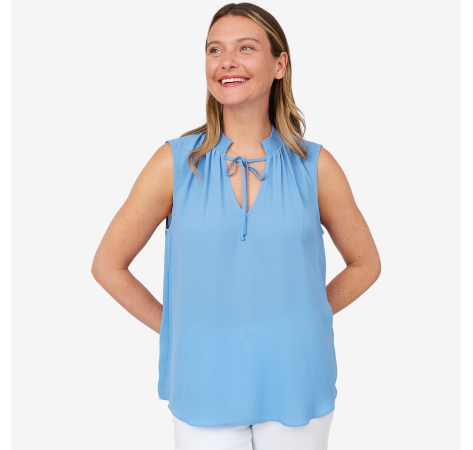Romance your favourite jeans with NYDJ's sleeveless Gemma blouse! Featuring a breezy silhouette and a split neckline with ties, this pullover style has an effortless boho look. Stretch smocking details the collar, and it finishes with a flattering curved hem.