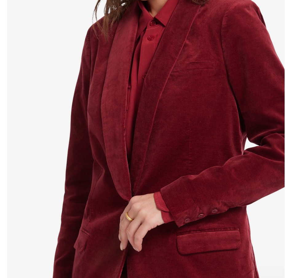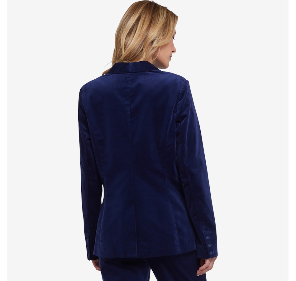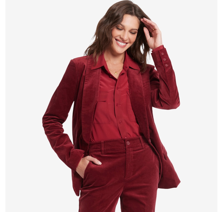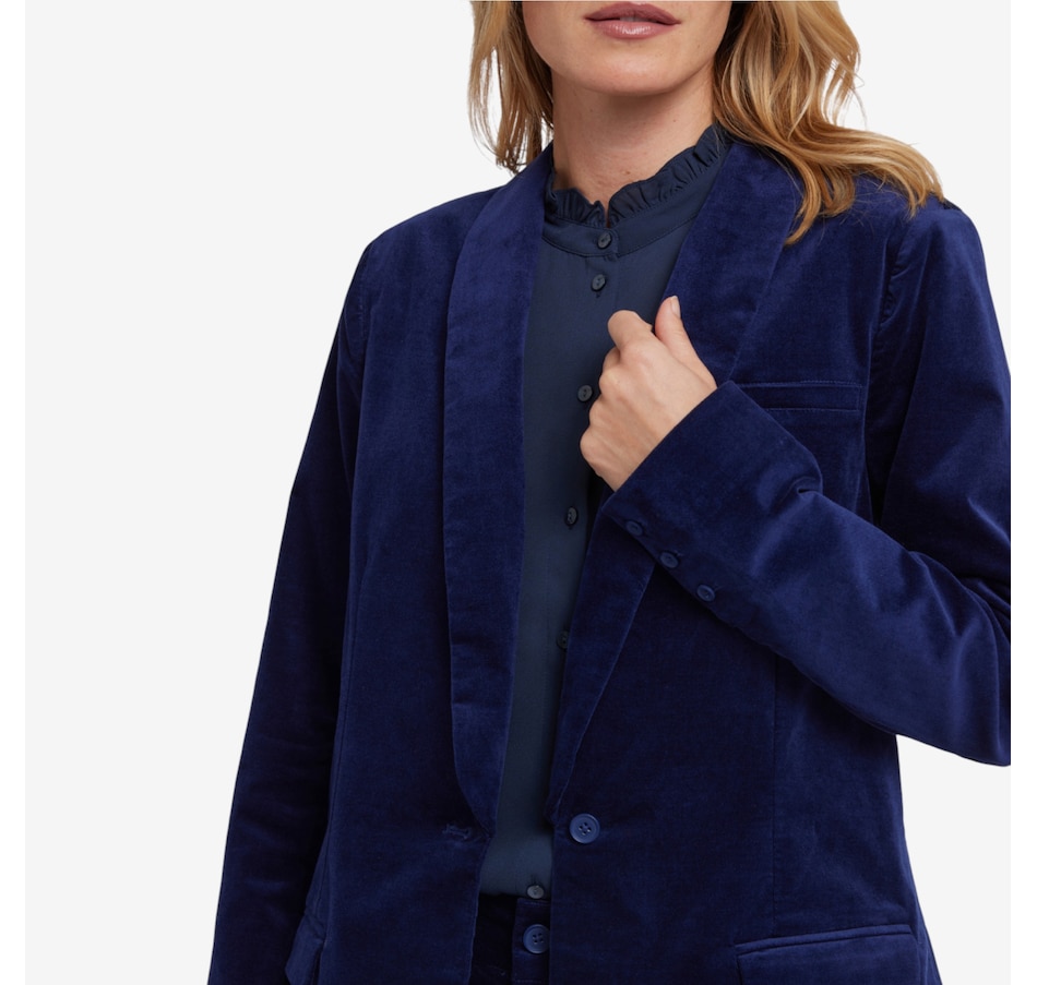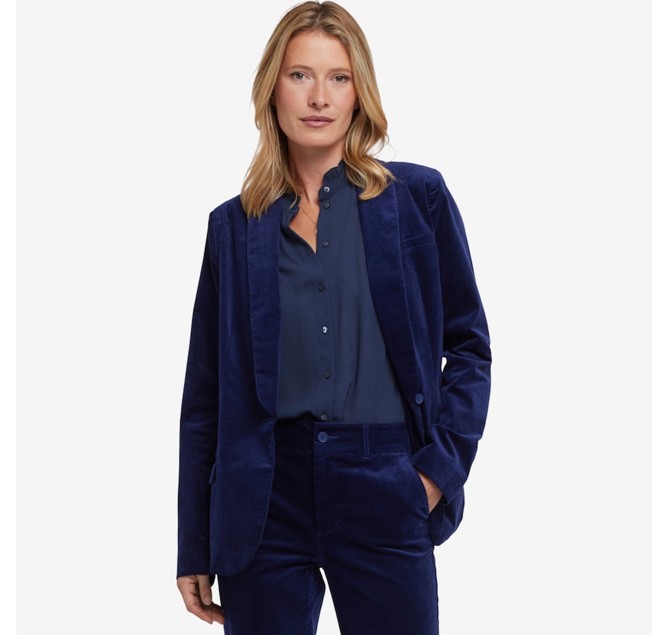 You'll exude a stylish confidence in NYDJ's velveteen tuxedo jacket. Crafted with inspiration from a menswear staple, this jacket features a shawl collar, flap pockets and a sleek single-breasted design with a front button closure.