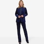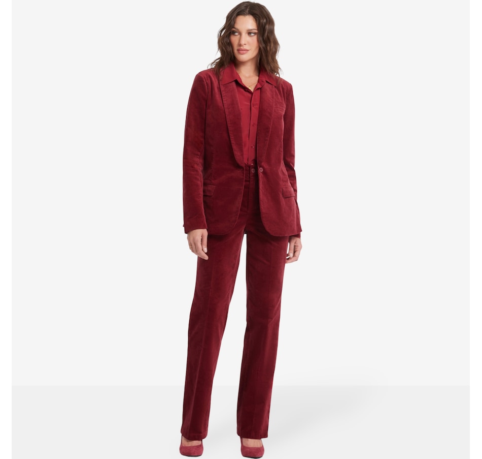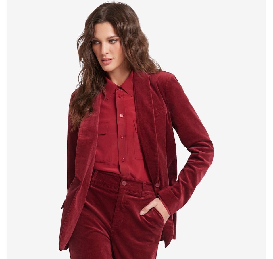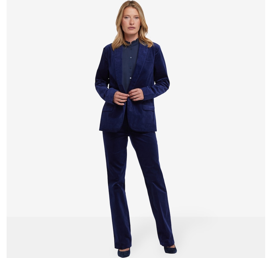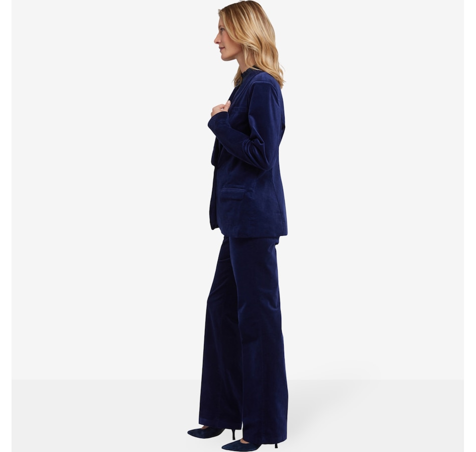 You'll exude a stylish confidence in NYDJ's velveteen tuxedo jacket. Crafted with inspiration from a menswear staple, this jacket features a shawl collar, flap pockets and a sleek single-breasted design with a front button closure.