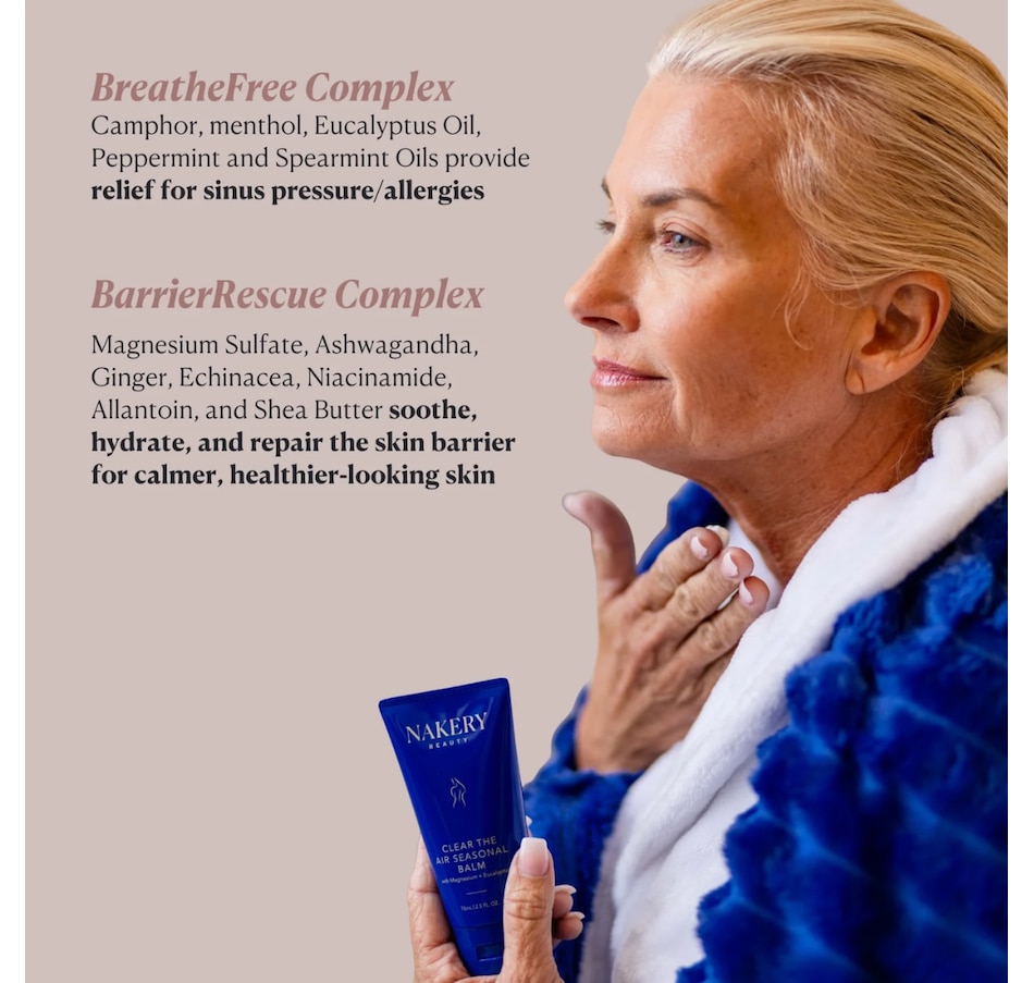 Meet your new must-have for clear sinuses and calm skin. The Clear the Air Seasonal Balm is a soothing 3-in-1 seasonal relief balm that eases congestion, sinus pressure, and allergy discomfort. It's infused with eucalyptus, peppermint, and camphor to help open airways and support calm, clear breathing.
