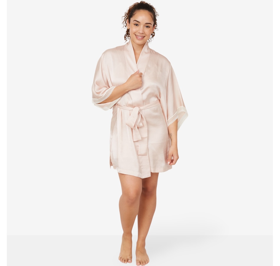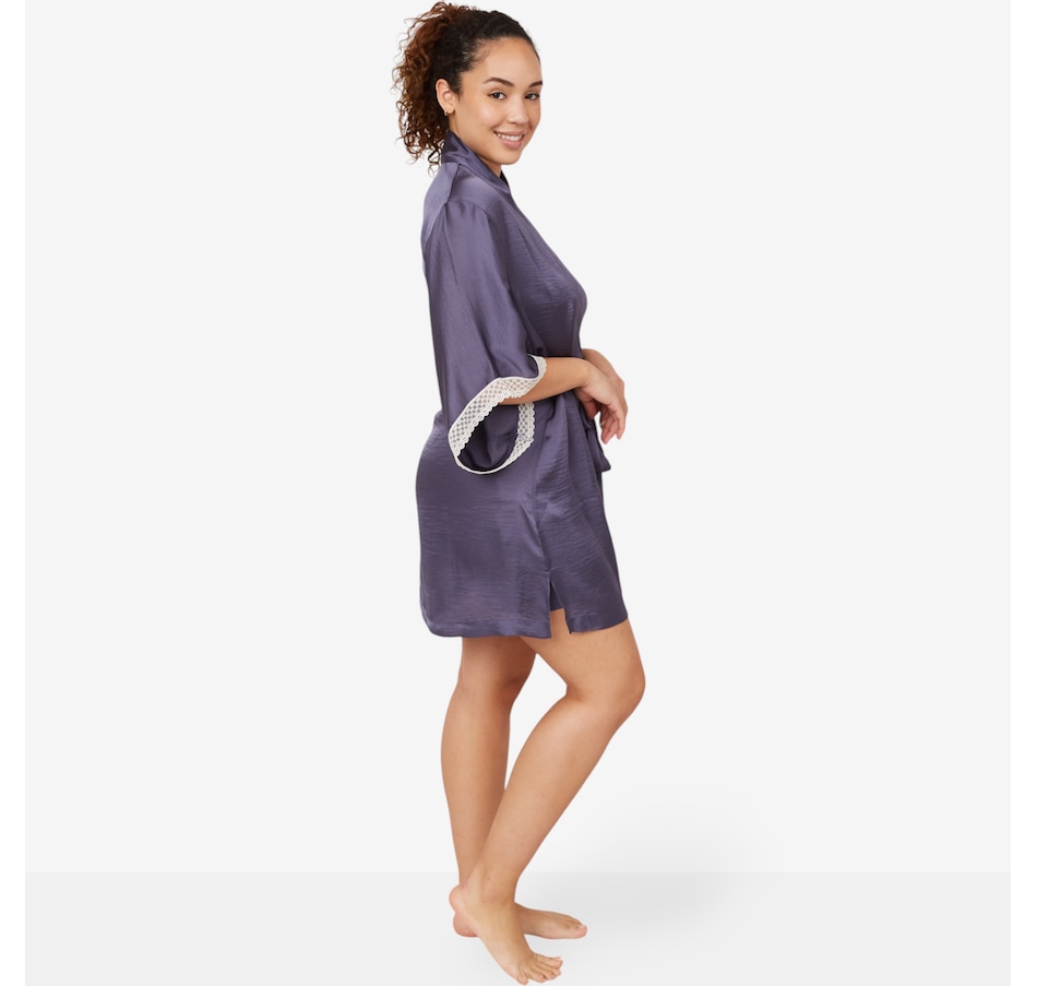 You'll slumber and lounge in elevated style with the new sleep essential Ashley icon robe from Natori Edit. It features a lace applicate on the sleeve opening, and the washed satin texture gives another layer of dimension.