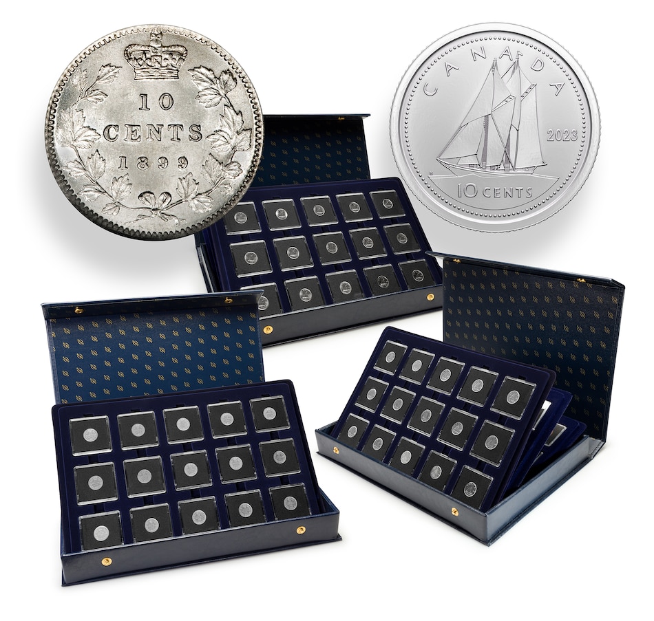Instantly build a classic collection of historic Canadian coins with this comprehensive dime collection dating from 1899 through to 2023. The set includes a total of 125 coins, with 64 struck in silver. The collection includes about 95 percent of all dates to form a complete set, and features every date of issue from 1909 to 2023. The coins range from good circulated condition to brilliant uncirculated, with all coins dated from the late 1950s to 2023 in brilliant uncirculated condition, and come presented in high-quality display cases. Major varieties are included for some issues including 1947 (plain and maple leaf), 1953 (shoulder fold and no shoulder fold issues), and 1968 silver and nickel issues.