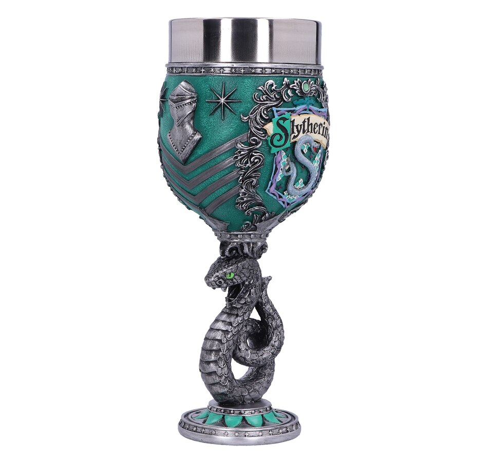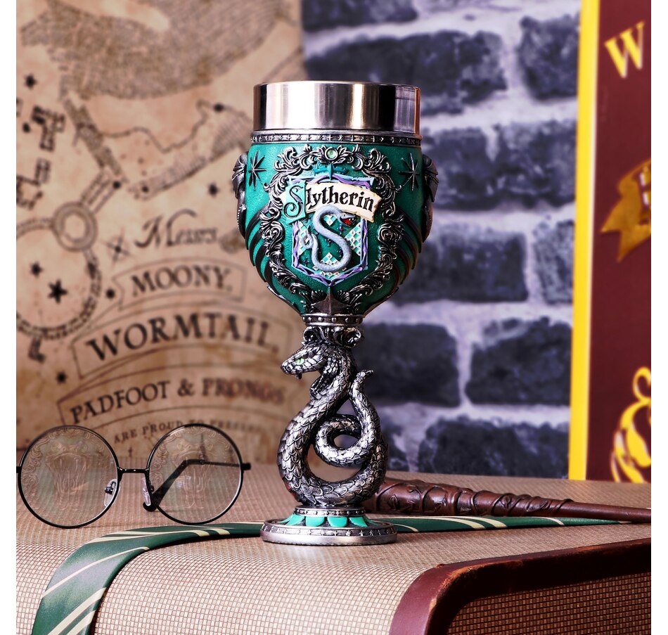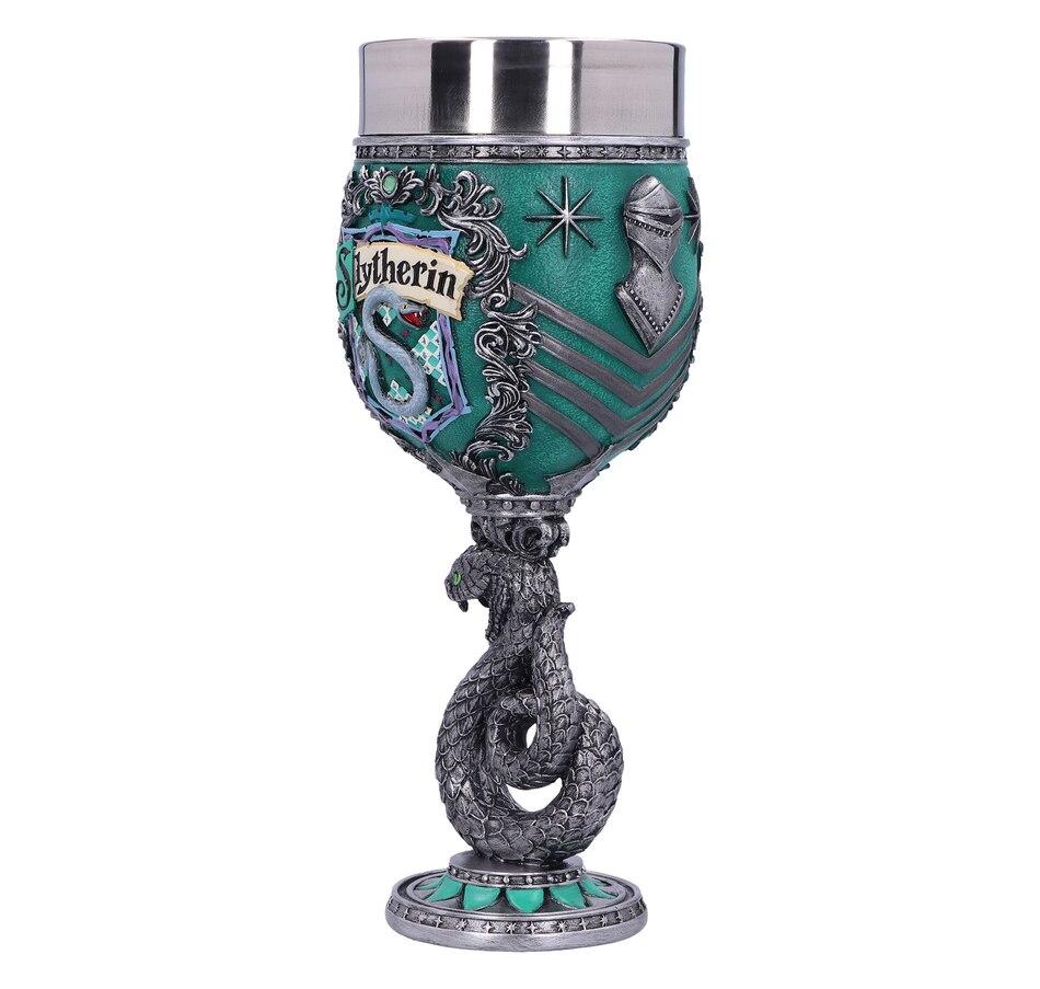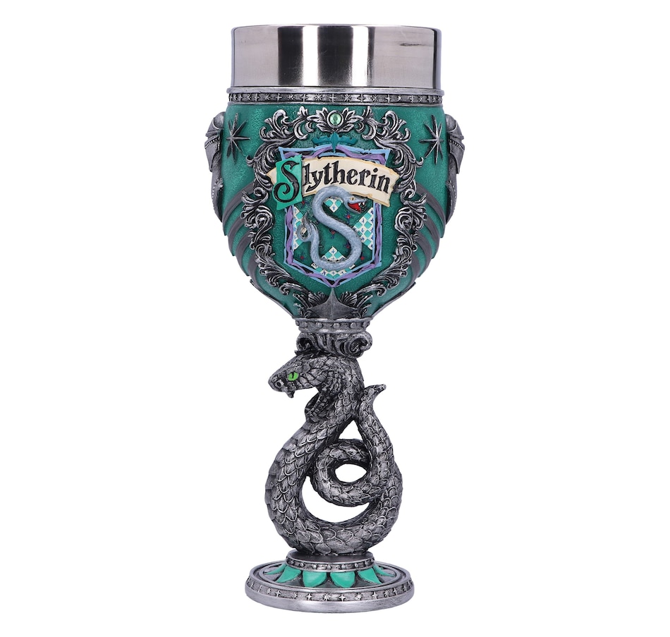 Show your passion for the finest school of witchcraft and wizardry in the world with this officially licensed Slytherin collectable goblet. Slytherin is one of the four houses of Hogwarts School of Witchcraft and Wizardry, whose members are characterized by their cunning, resourcefulness, leadership, and ambition. The emblematic animal of the house is a snake, which can be seen within the crest on the sides of this beautifully crafted piece, along with the house colours of green and silver. Cast in the finest resin before being expertly hand-painted, this collectable Goblet is the perfect addtion to any wizarding collection and can be enjoyed by witches, wizards and Muggles alike.