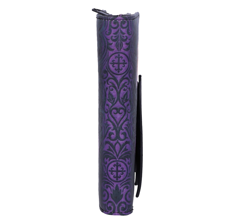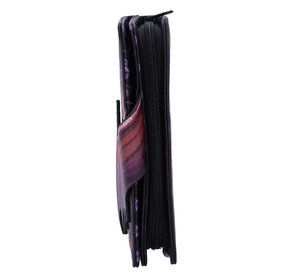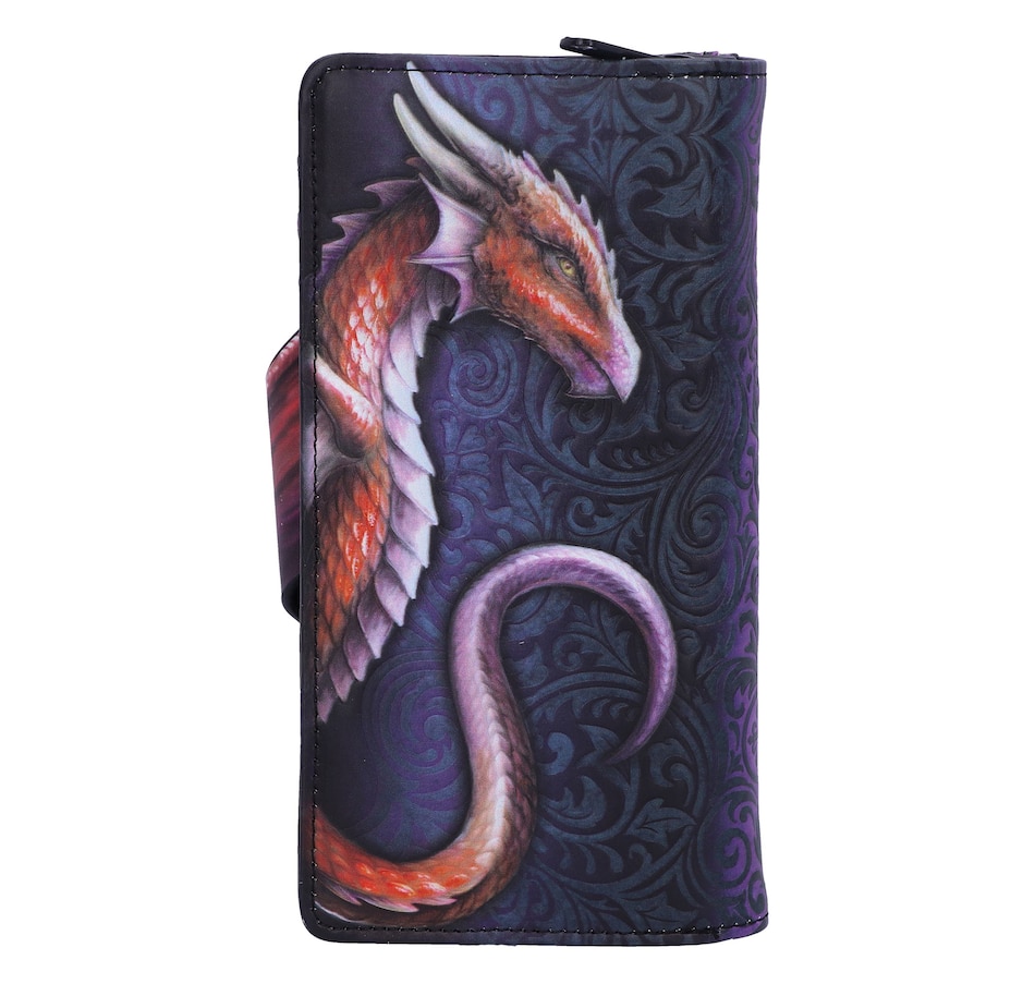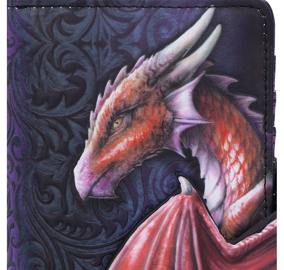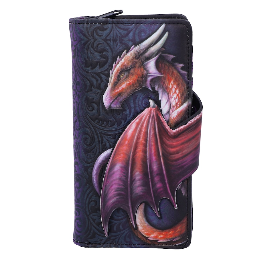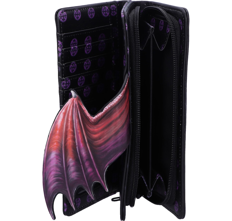 Dragons have been a part of folklore and literature since the dawn of time, whether they be treasure hoarders or flying menaces. Now you can own your own piece of mythology with this Take Flight purse. Featuring the profile of a beautiful red dragon, with a large wing covering its side, this purse is not what it seems; the wing can be unfastened to open the card holder slot! Covered in embossed Baroque designs, this purse has multiple slots for holding cards, cash and coins.