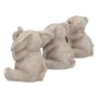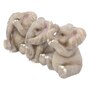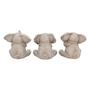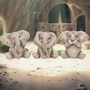 Sitting back on their haunches, these three baby elephants rest side by side. One has one front foot covering one eye playfully, the other closed, while its trunk hangs down. One has both front feet on the ground, ears folded down to their hanging trunk. And the third sits back, trunk up, as it clasps both front feet to their mouth. Wise beyond their years, these three baby elephants epitomize the ancient wisdom of "see no evil, hear no evil, and speak no evil." They are cast in high-quality resin before being lovingly hand-painted.