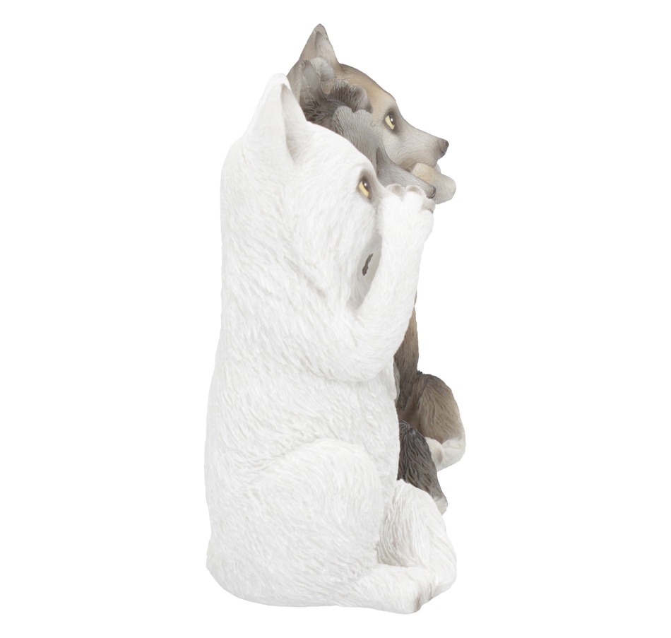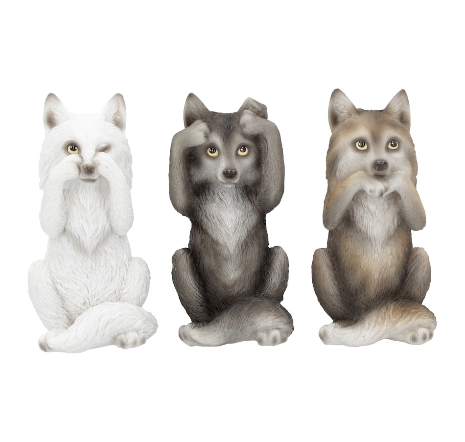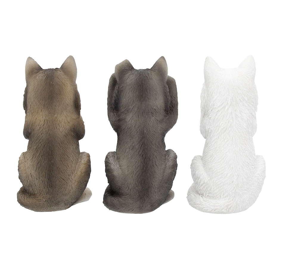 Sitting side by side, these three wise wolves look up with adorable eyes. One clasps their paws to their mouth, one blocks their ears, and one covers their eyes, but still sneaking a peek. Cast in the finest resin before being lovingly hand-painted, these adorable animals are the perfect illustration of Confucius' famous maxim: see no evil, hear no evil, and speak no evil.