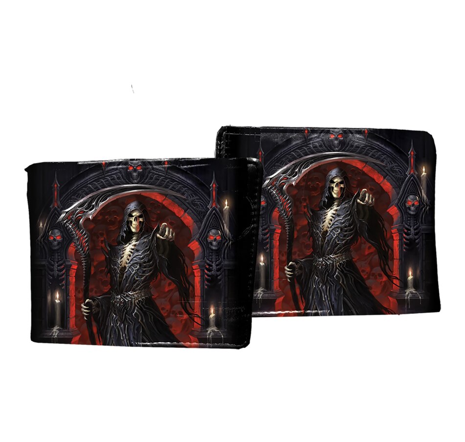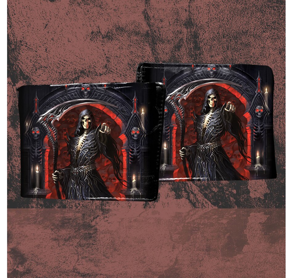 From the twisted mind of gothic fantasy master James Ryman, this alternative wallet is made exclusively available through Nemesis Now. In front of a glowing red crypt, packed with skulls, the grim reaper stands, black robe covered with a spindly metallic exoskeleton. His right hand holds a cruel gothic scythe and the left points directly at you, letting you know there is no escape! The crypt portal is framed with stone skulls, the eyes glowing red. It also features the same design on the back.