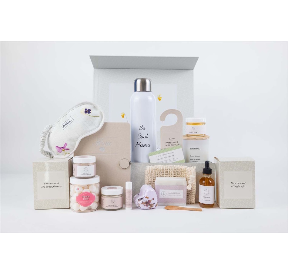 This box is thoughtfully curated to bring the new mother some joy and comfort.This is exactly what she needs before and after the baby arrives. It is the ideal gift to help her cherish these special moments and take a pause.Make her new title official with the perfect gesture that's both fun and functional.This gift set includes: Nipple balm Belly oil Water Bottle - Be Cool Mama Scented Candle Journal ¢‚¬€œ Mom (heart symbol) Lavender Natural Soap Lavender foot salt Candy Sparkle Heart Shower Steamer Facial Clay Mask Lip Balm ¢‚¬€œ unscented Eye Mask ¢‚¬€œ Cotton Soap Saver - Natural luffa Door hangtag Gorgeous box. Make it special and add a name on the lid Your personal note printed free on a beautiful greeting card Personalize your box: You can choose to add the Recipient's Name on the lid in rose gold lettering to make it more personal for a small extra cost.Gift message: During check out, on the cart page, enter your personal message to the recipient.Shipping: -Please choose between free shipping (5-7 business days) or expedited shipping (2-4 business days) during check out. - Orders placed after 5 PM PST will be shipped the following business day. Ship it directly to the recipients: During checkout change to the recipient'sshipping address. At Lizush we believe that you deserve the best! Working hard all week and taking care of your family and loved ones? It's now time that someone else should take care of you! We, therefore, created All Natural products with you in mind: * High-quality all-natural materials. * We use only natural colorant made from spices and herbs * We use only high-quality essential oils for scent Our goal at Lizush is to make you feel good and look your best!