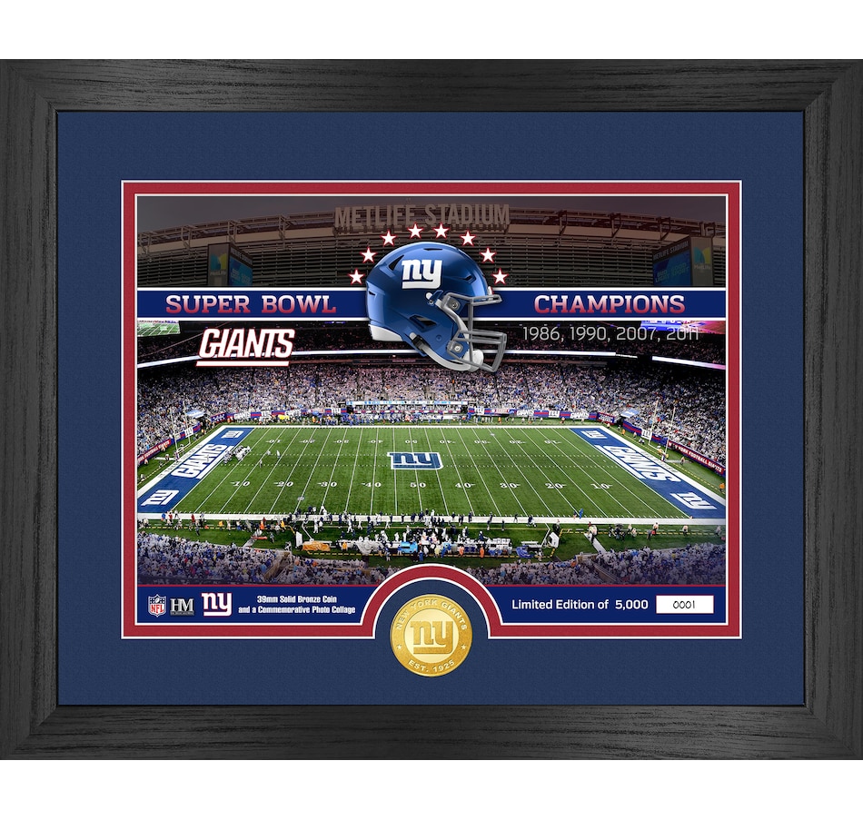This limited edition 13" x 16" frame features, in double matting and under glass, a hand numbered 8" x 10" custom print commemorating the NFL's New York Giants combined with a 39mm minted bronze team coin. As a limited edition of only 5000 and officially licensed by the NFL, each one is accompanied by a certificate of authenticity. This product is proudly made in the U.S.A. by The Highland Mint.
