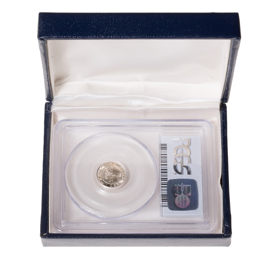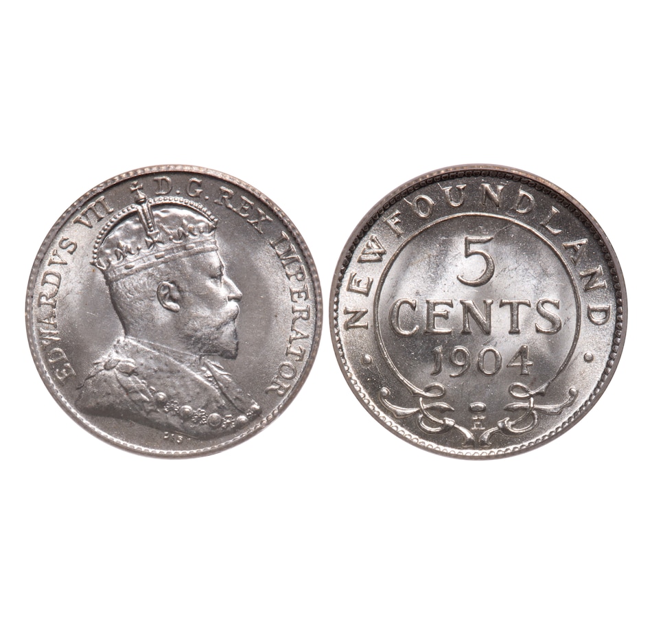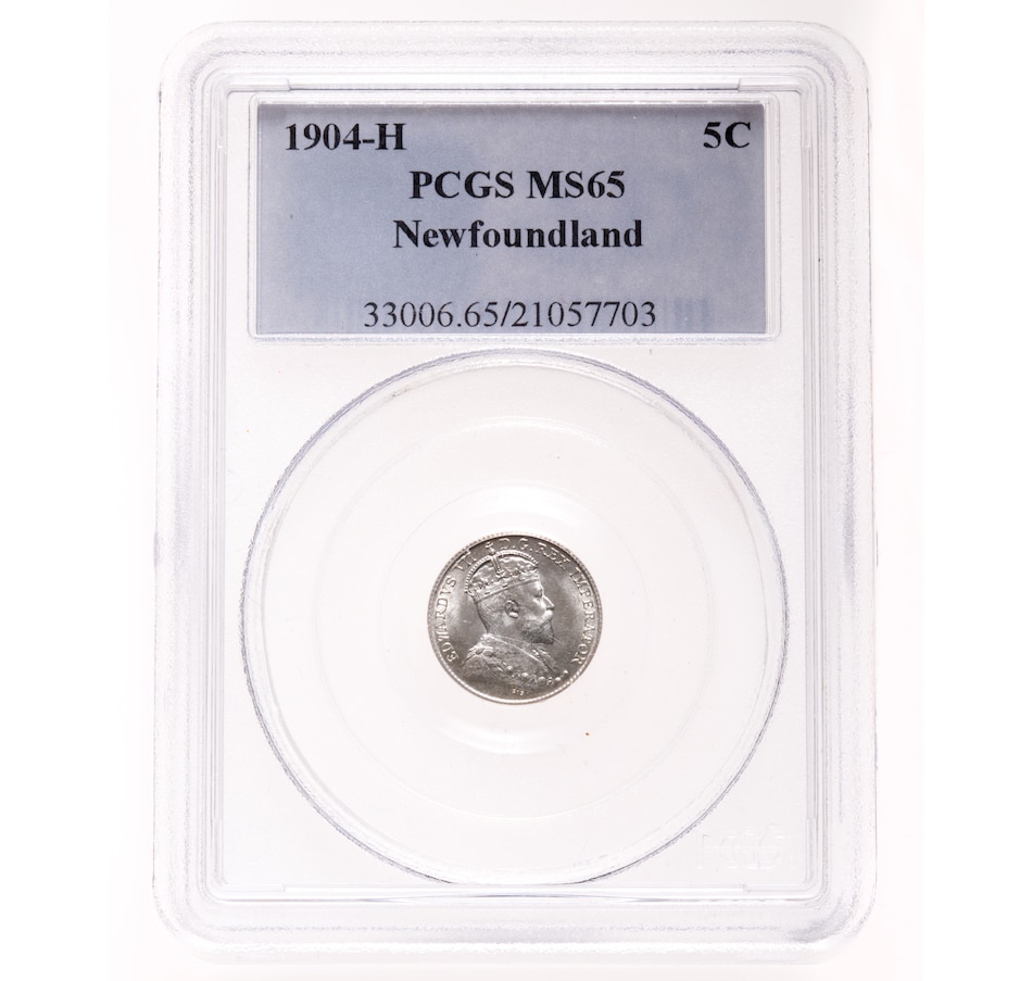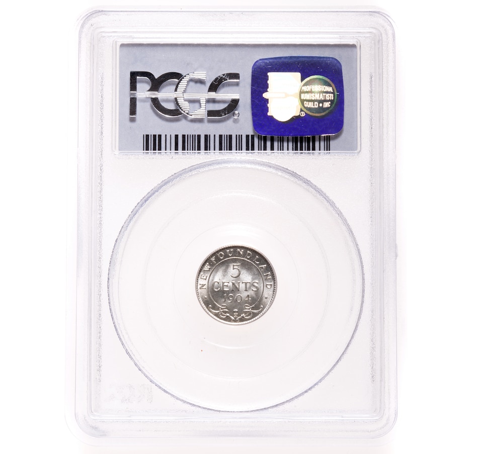 This ultra rare 1904 Newfoundland silver five cent coin is one of the finest known surviving Edwardian five cent coins of Newfoundland in nearly flawless gem uncirculated condition. To provide complete confidence to the collector or investor, it has been independently authenticated and graded by PCGS, the largest and most respected third party grading service in the world. The grade assigned to this coin is Gem Uncirculated 65, meaning it is a well struck coin with nearly perfect surfaces free from scratches, bag marks or other blemishes. The coin is fully brilliant with dazzling original mint lustre rarely found on a coin struck 107 years ago.