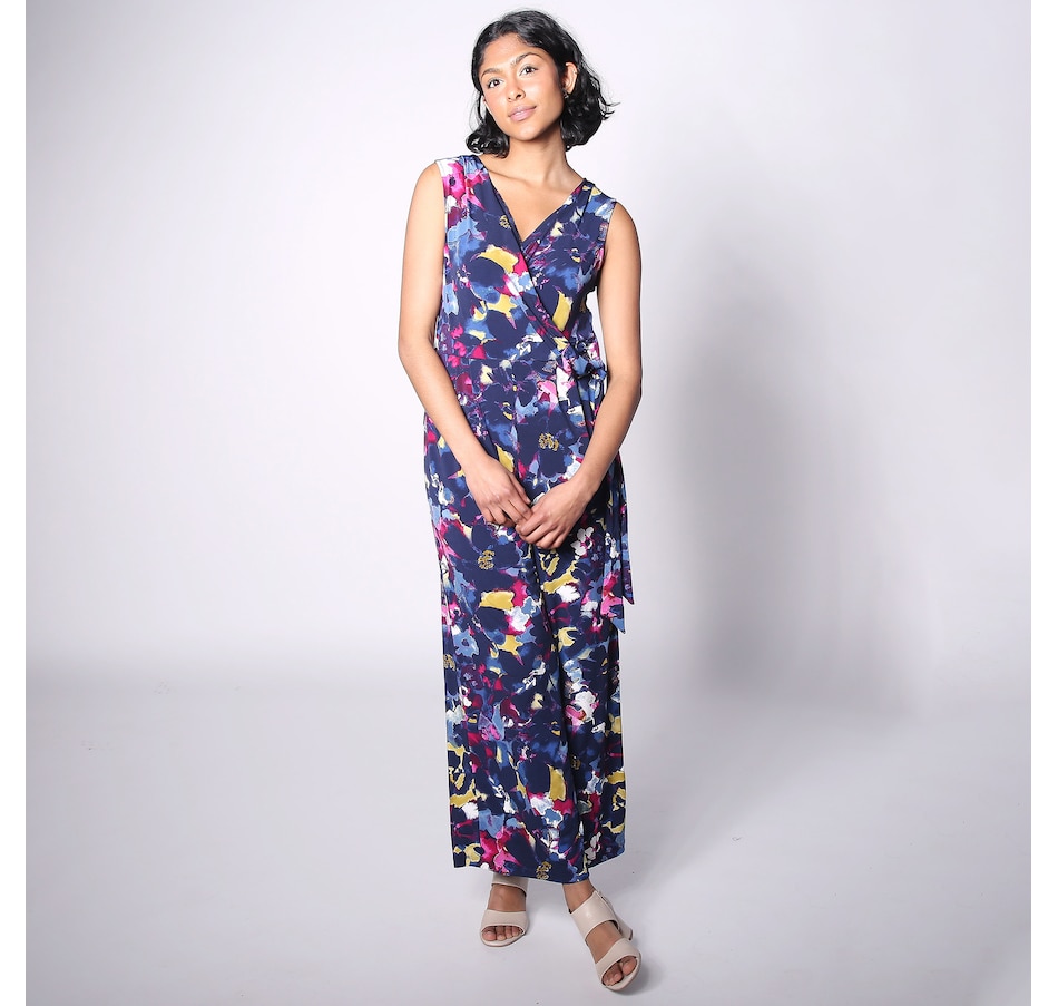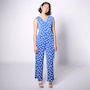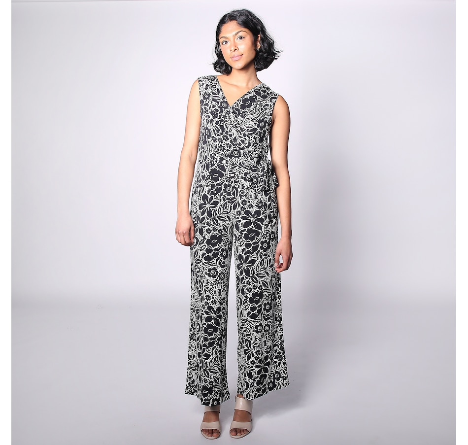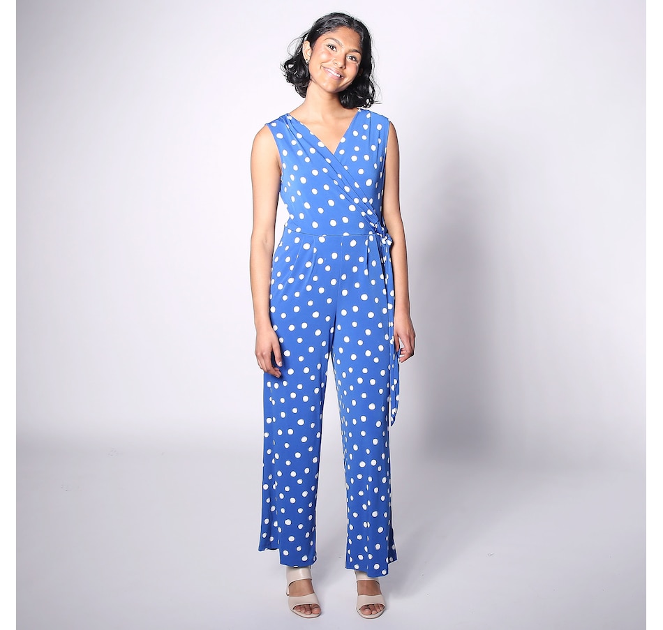 You'll create a look that's exciting and stylish with this all over print coulotte jumpsuit from Nina Leonard.