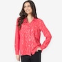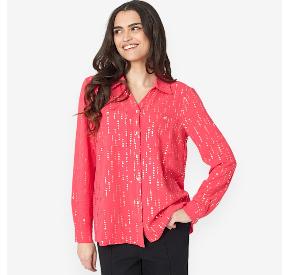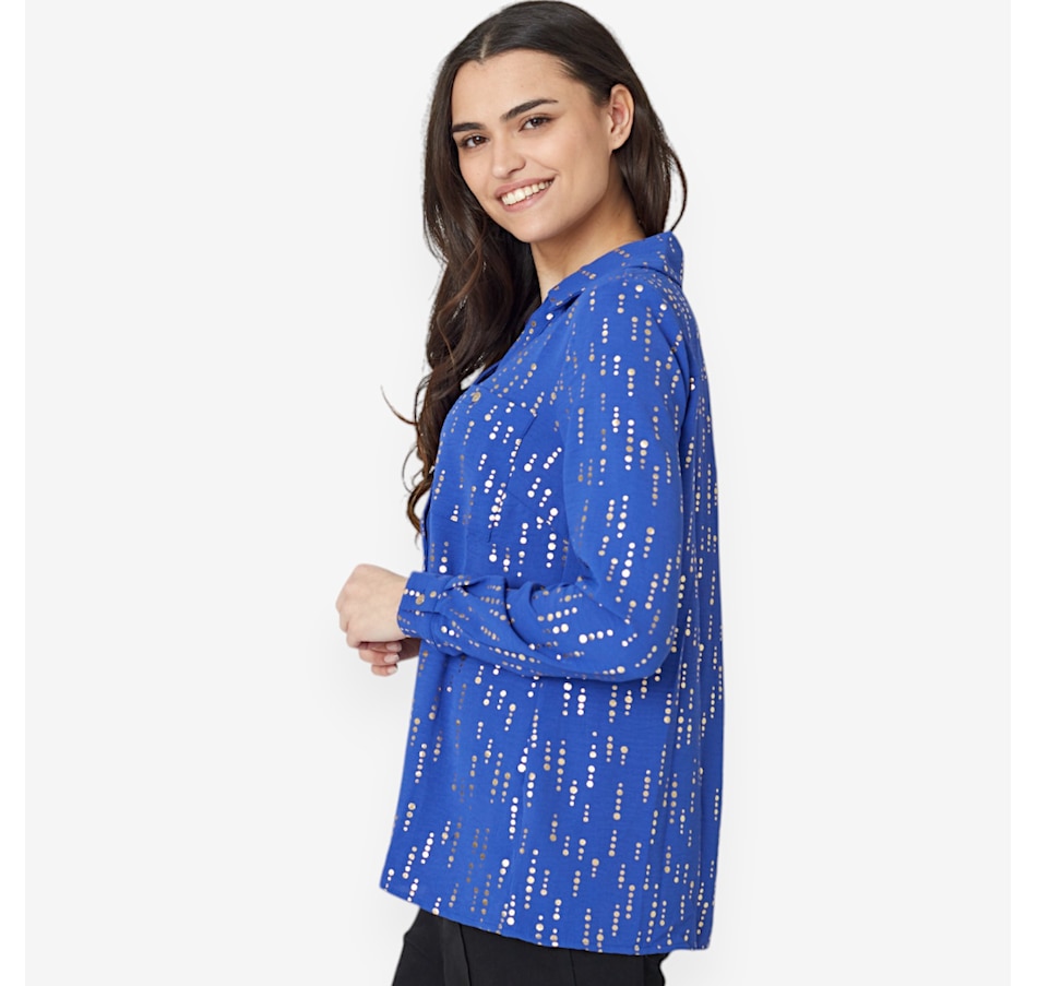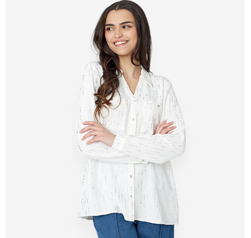 You'll elevate every ensemble with a stylish twist wearing this beautiful front foiled textured wave blouse from Nina Leonard.