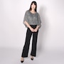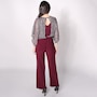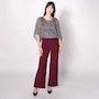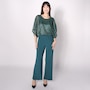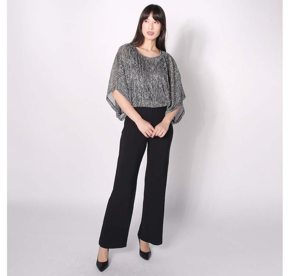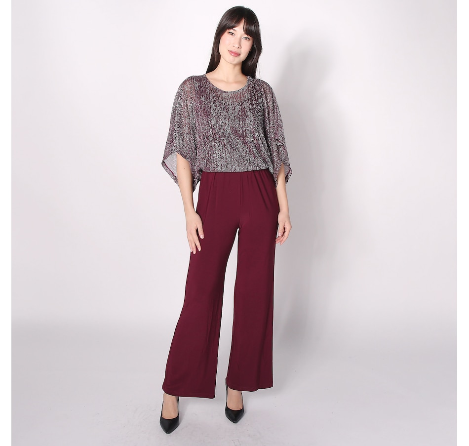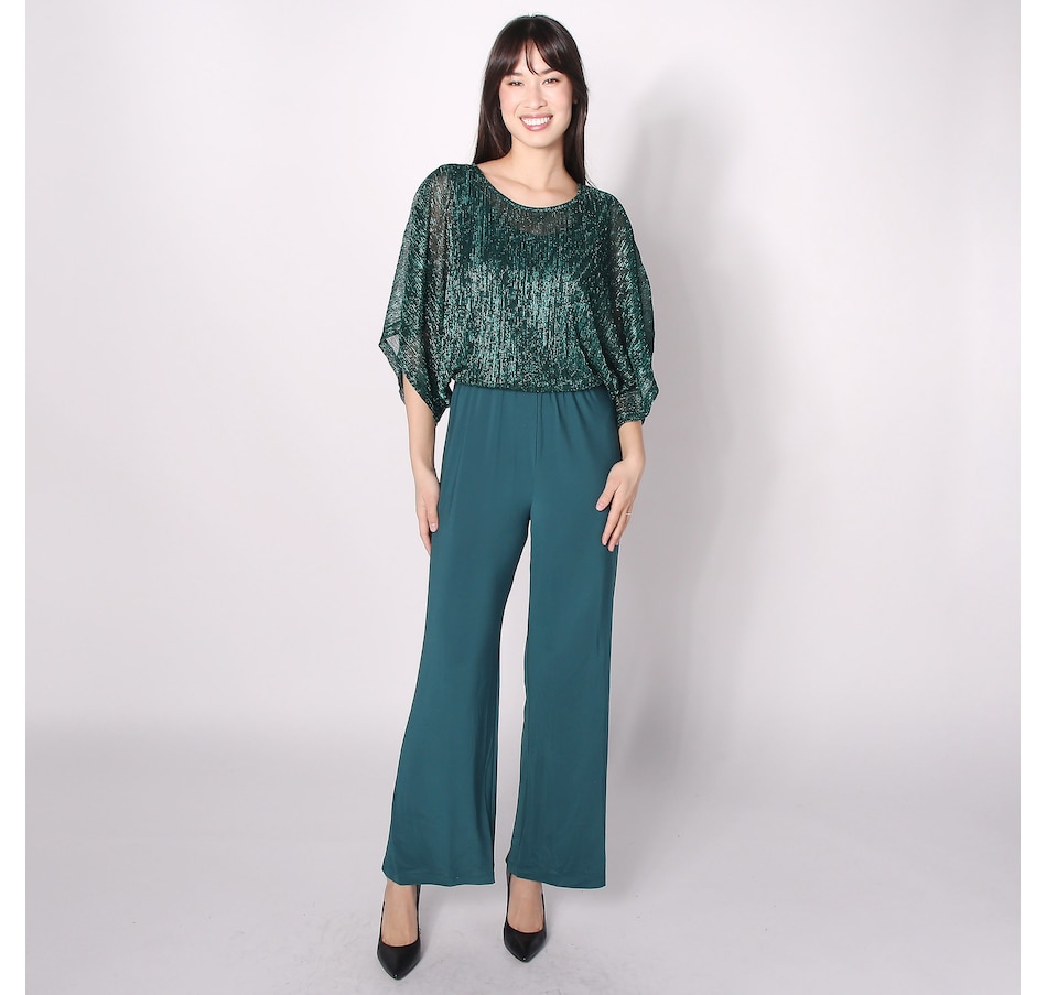• Long pants , elbow sleeve, elasticized waist, boat neck, sparkle knit dropped shoulder bodice, back slit with hook and eye closure at neck, lined bodice with round front neckline and V- neck back