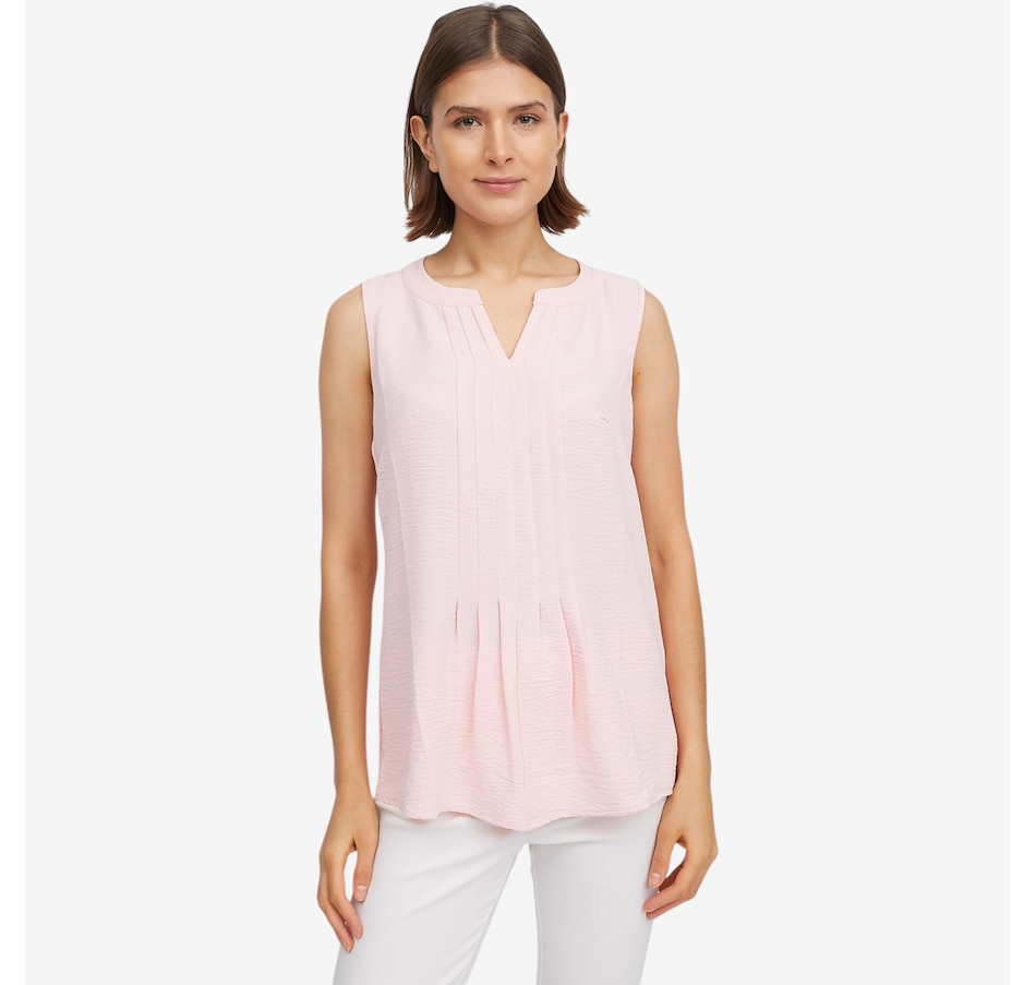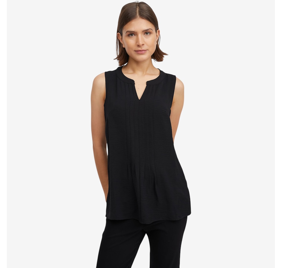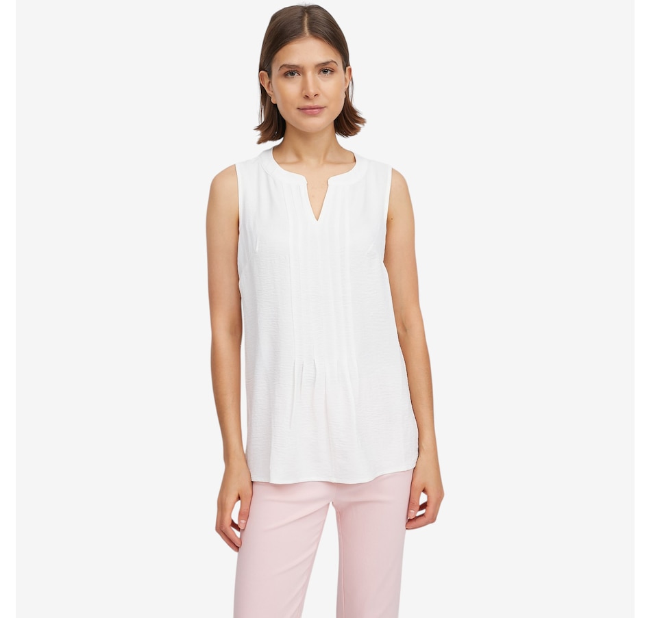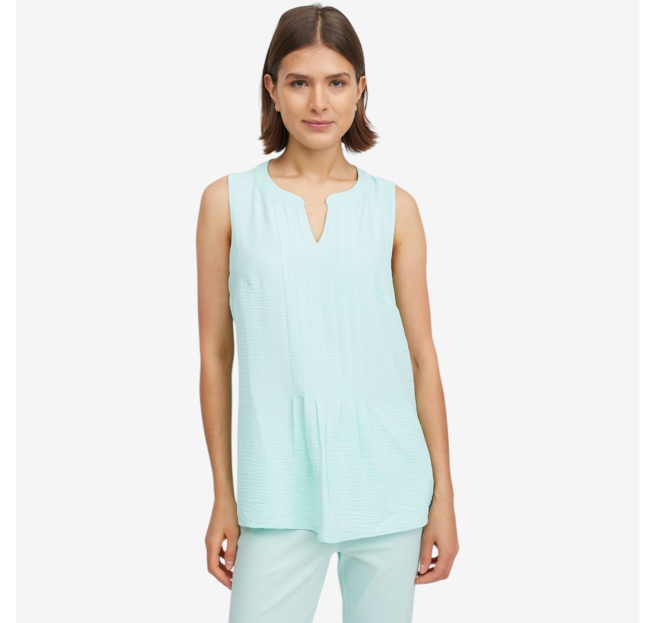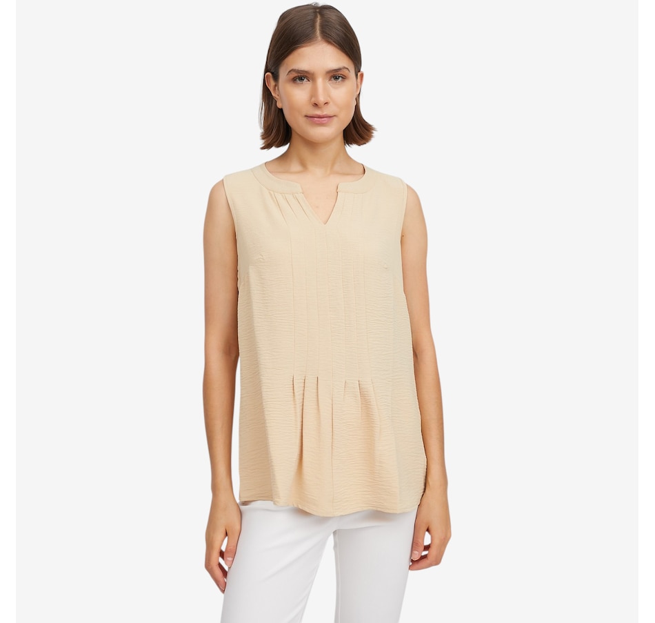 This pleat front tank from Nina Leonard is a versatile staple designed to elevate your everyday look. Featuring a flattering notch neckline and soft pleat‑front detailing, this sleeveless style adds subtle structure and dimension while maintaining a clean, streamlined silhouette. The pull‑on design makes it fuss‑free and comfortable, ideal for layering under jackets or wearing on its own in warmer weather. Whether styled for work or paired casually with denim, this refined tank delivers timeless appeal with ease.