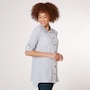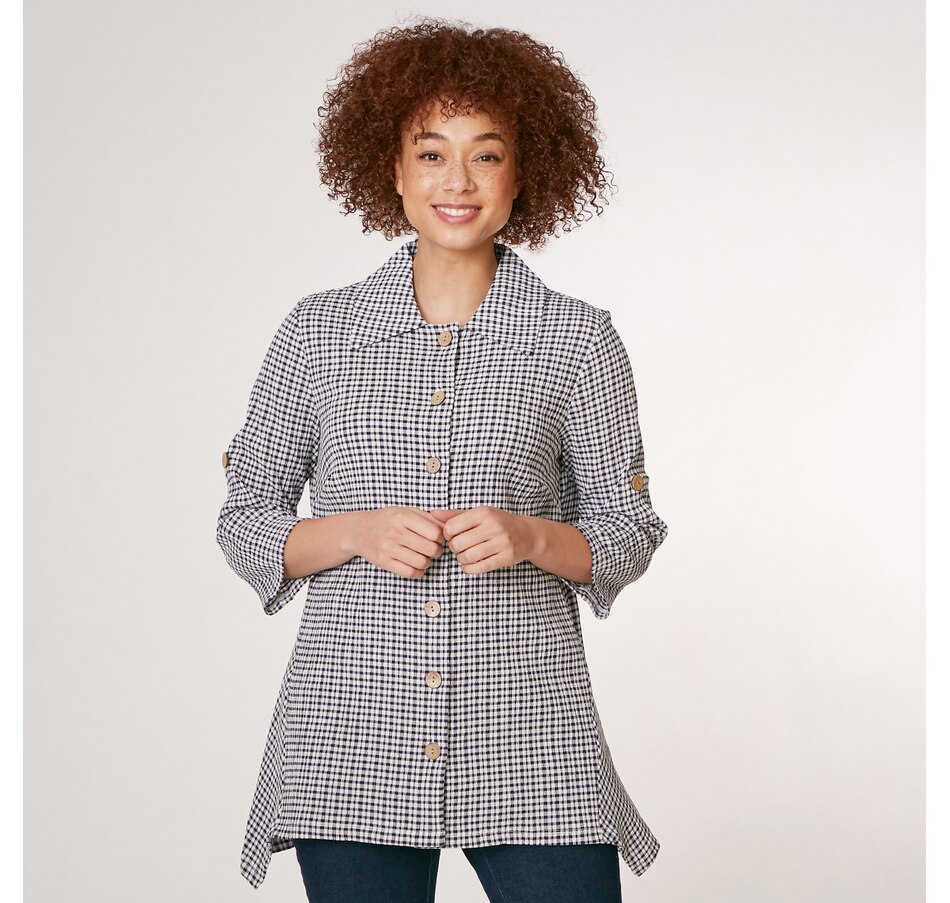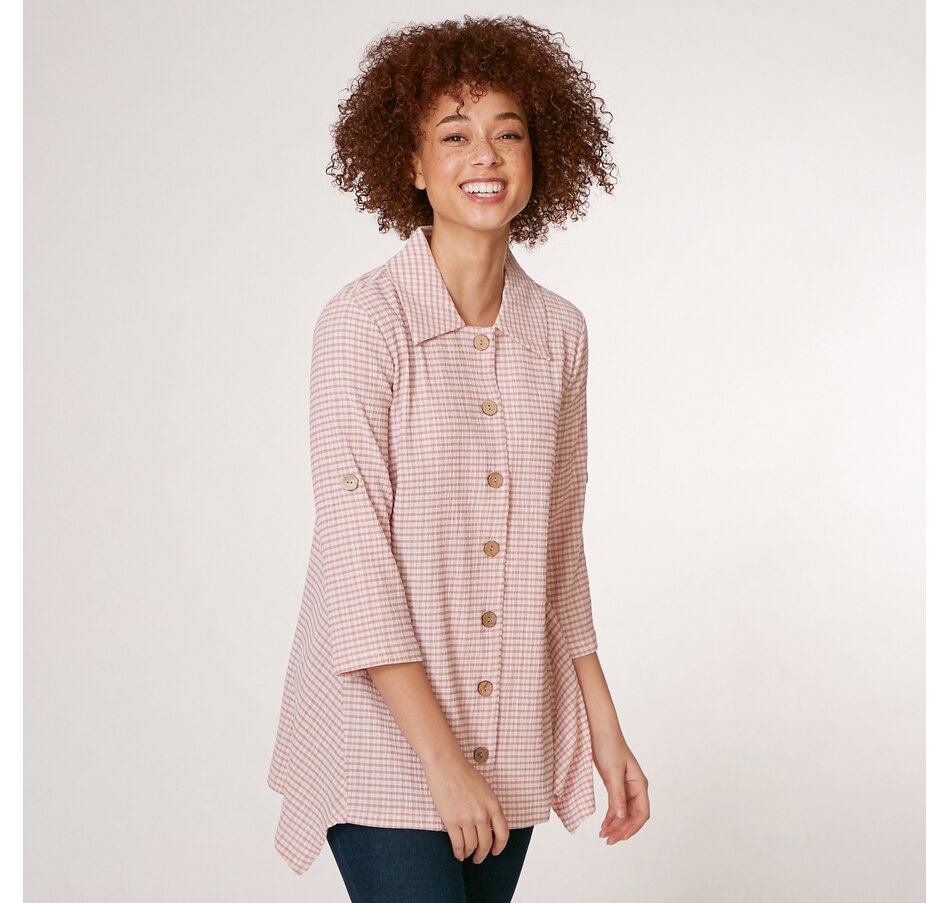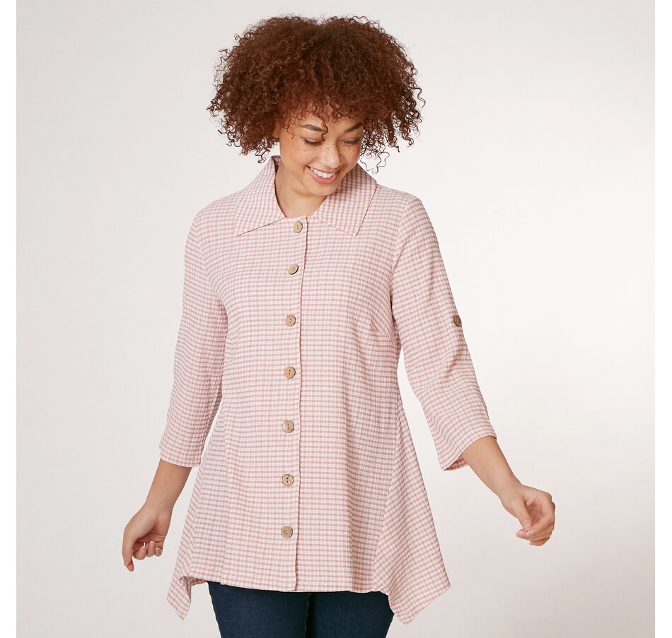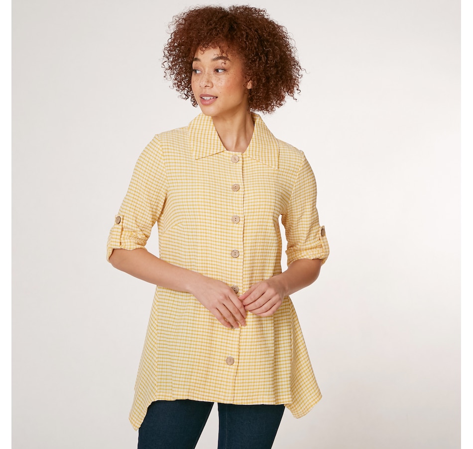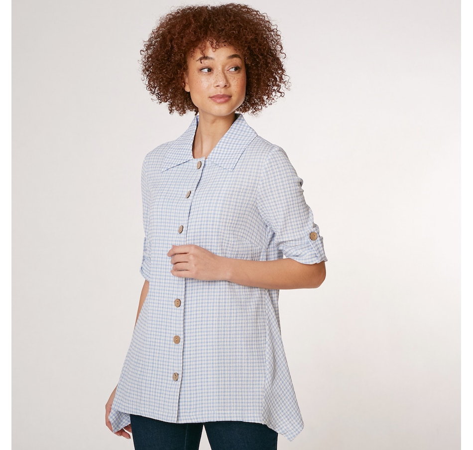 A fabulous twist on a traditional classic piece, you can finish every ensemble in chic style with this puckered plaid button up shirt from Nina Leonard.