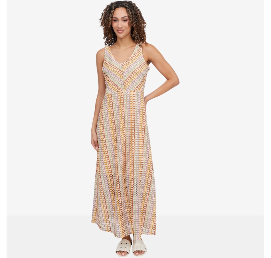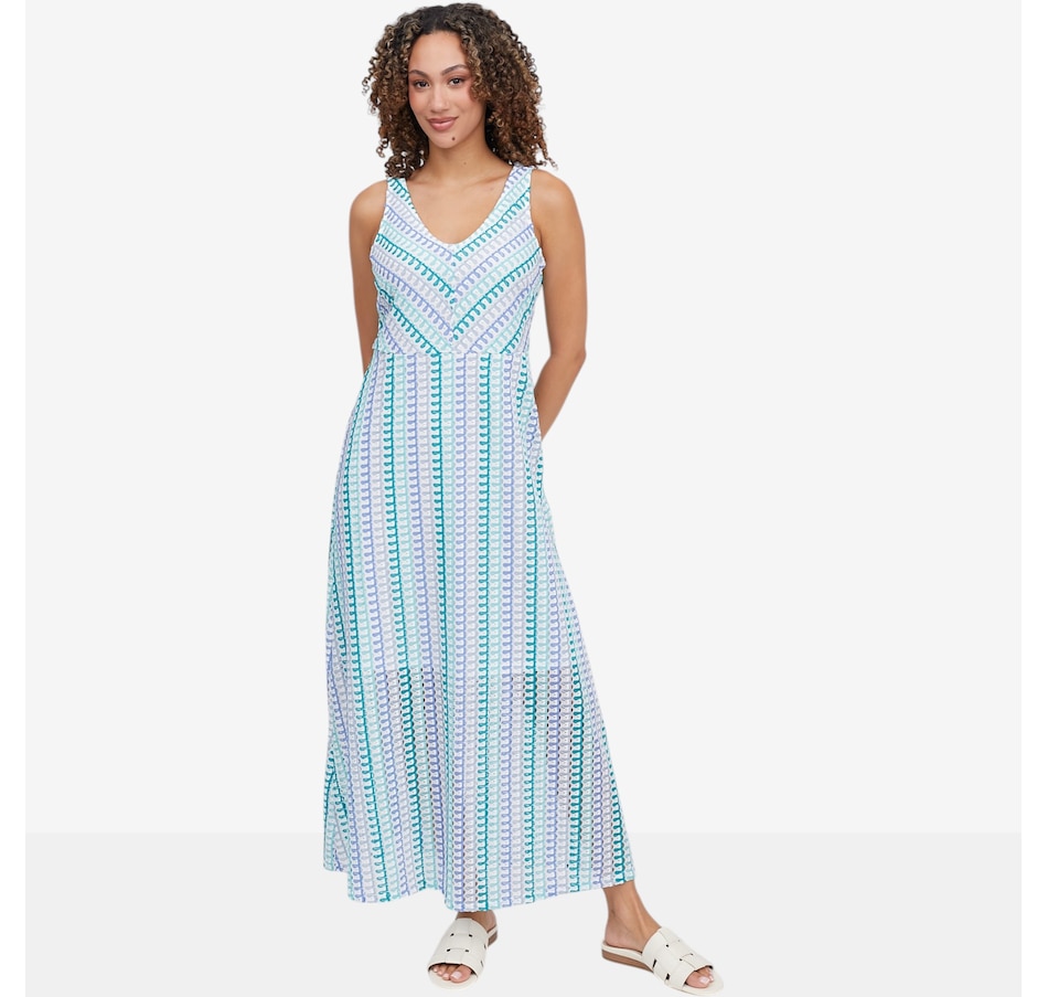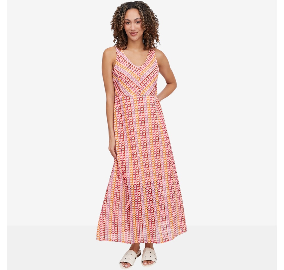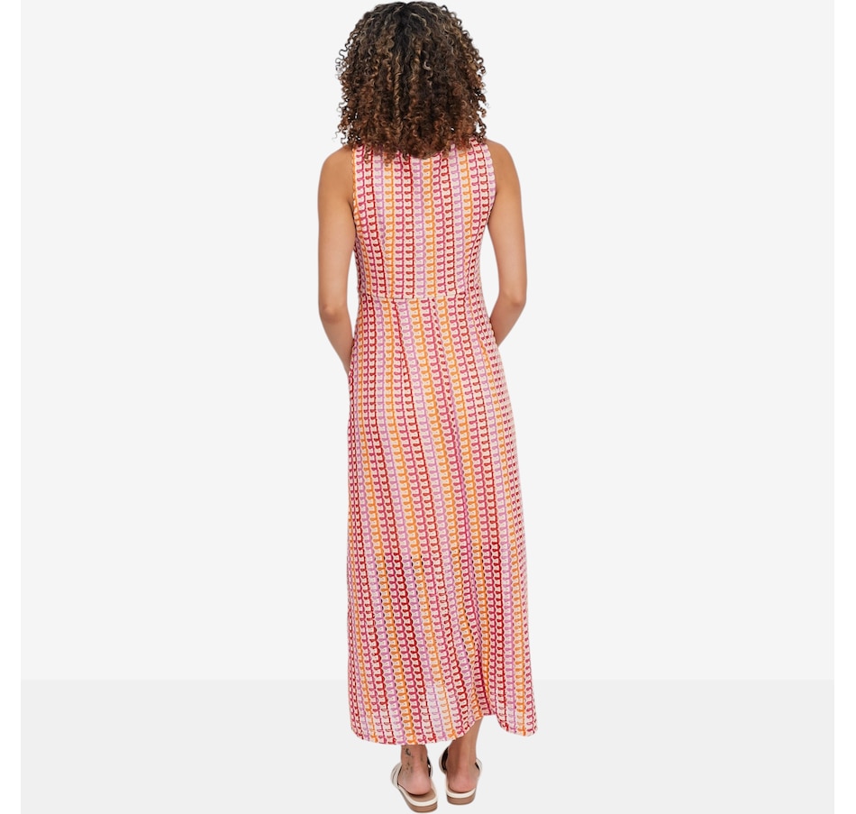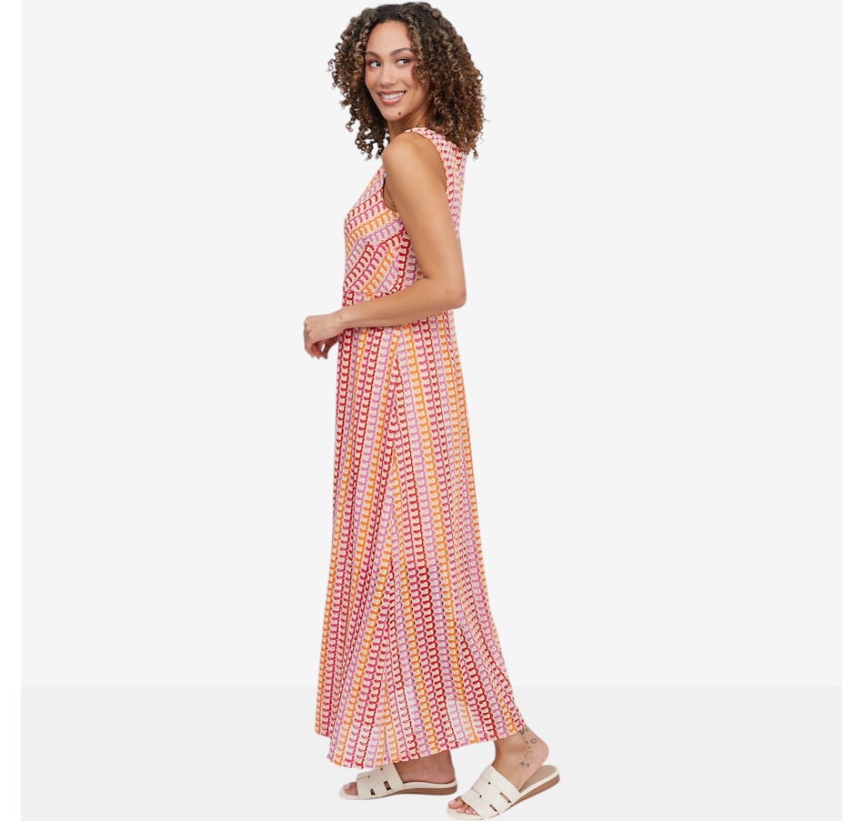 Flow into effortless elegance with this sleeveless novelty knit maxi dress from Nina Leonard, a striking blend of comfort and statement style. Designed with a flattering V‑neckline and a smooth, lined finish, this dress skims the body beautifully while offering confident coverage and all‑day ease. The novelty knit fabric adds visual interest and fluid movement, making it ideal for everything from daytime outings to relaxed evening plans.