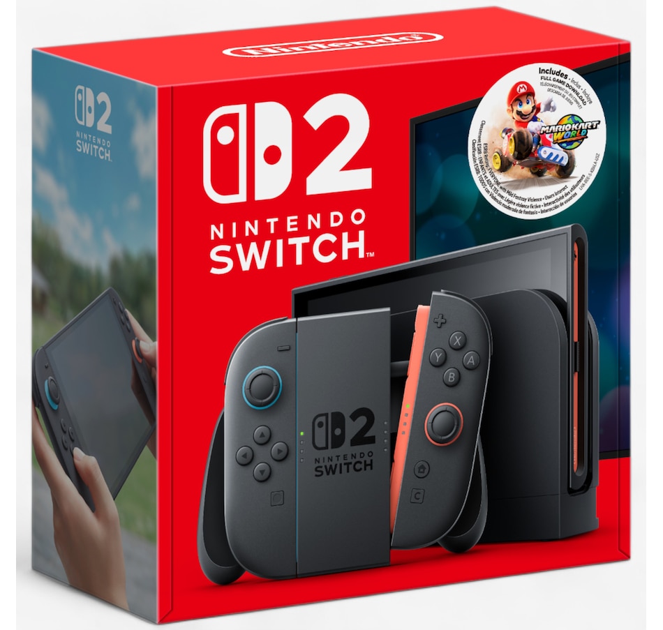 • Nintendo Switch 2 and Mario Kart World Bundle: Nintendo Switch 2 Console, Mario Kart World Full Game Download, (L) Joy-Con 2 (light blue), (R) Joy-Con 2 (light red), Nintendo Switch 2 AC Adapter, USB-C Charging Cable, Nintendo Switch 2 Dock, Joy-Con 2 Grip, (2) Joy-Con 2 Strap, Ultra-High-Speed HDMI Cable